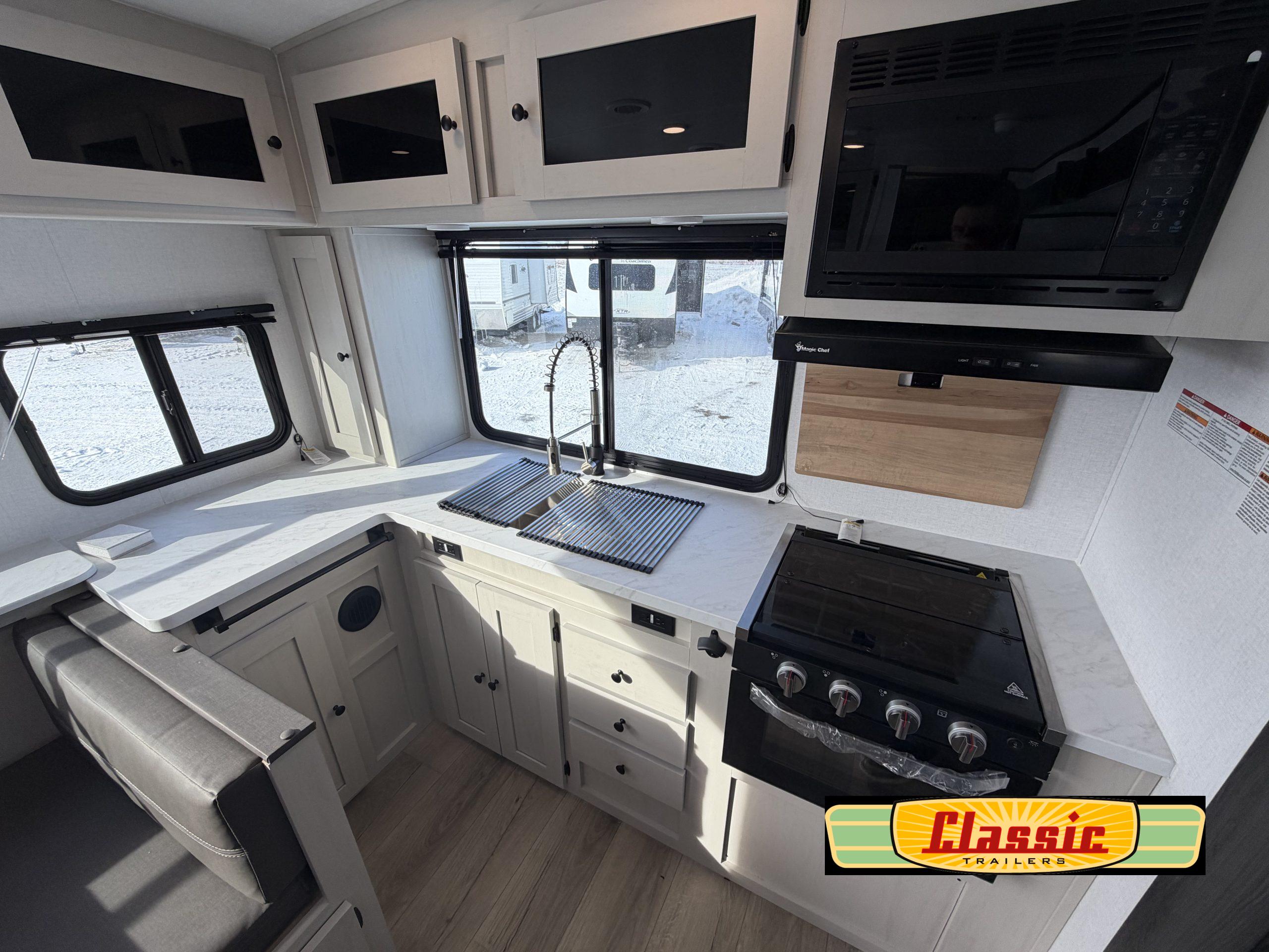 Kitchen designed for real use, featuring a deep-basin farm-style sink with rack, seamless countertops, a three-burner cooktop with glass cover, oven, microwave and 10-cubic-foot 12-volt refrigerator — a full kitchen environment for meal prep, even on extended trips.