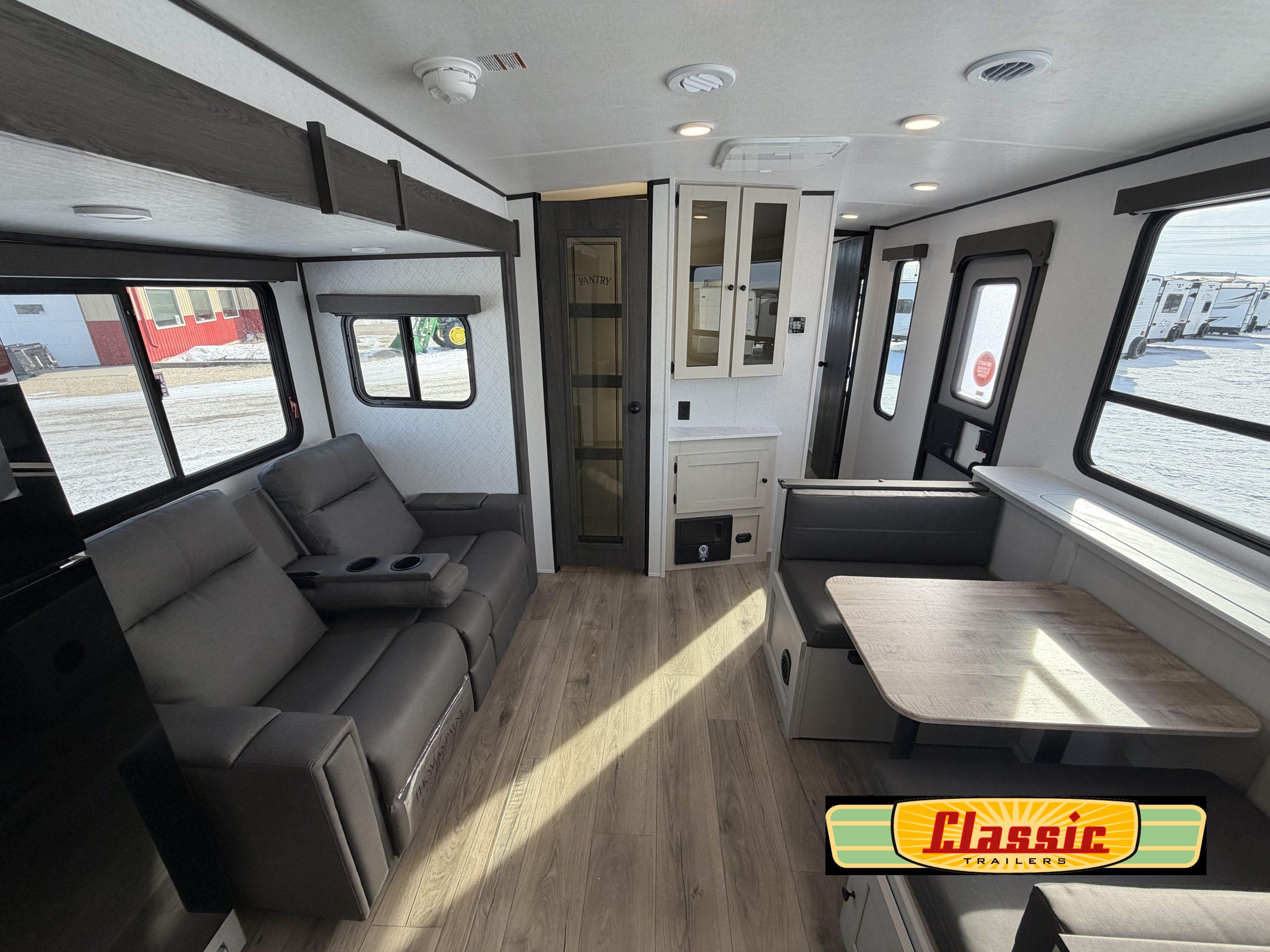 Slide-out living area that expands space when parked, bringing comfort and openness to the living and dining zones.