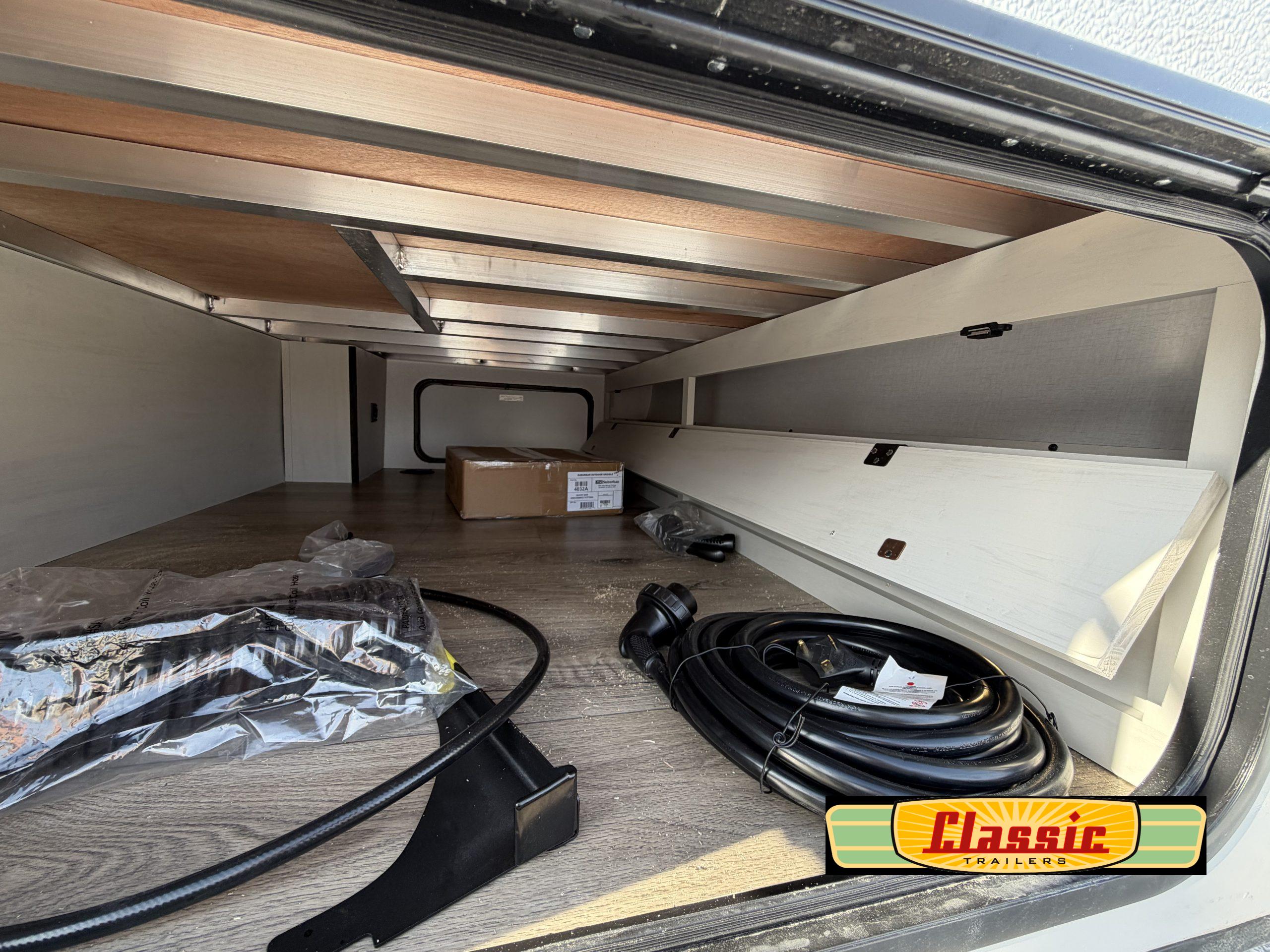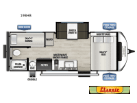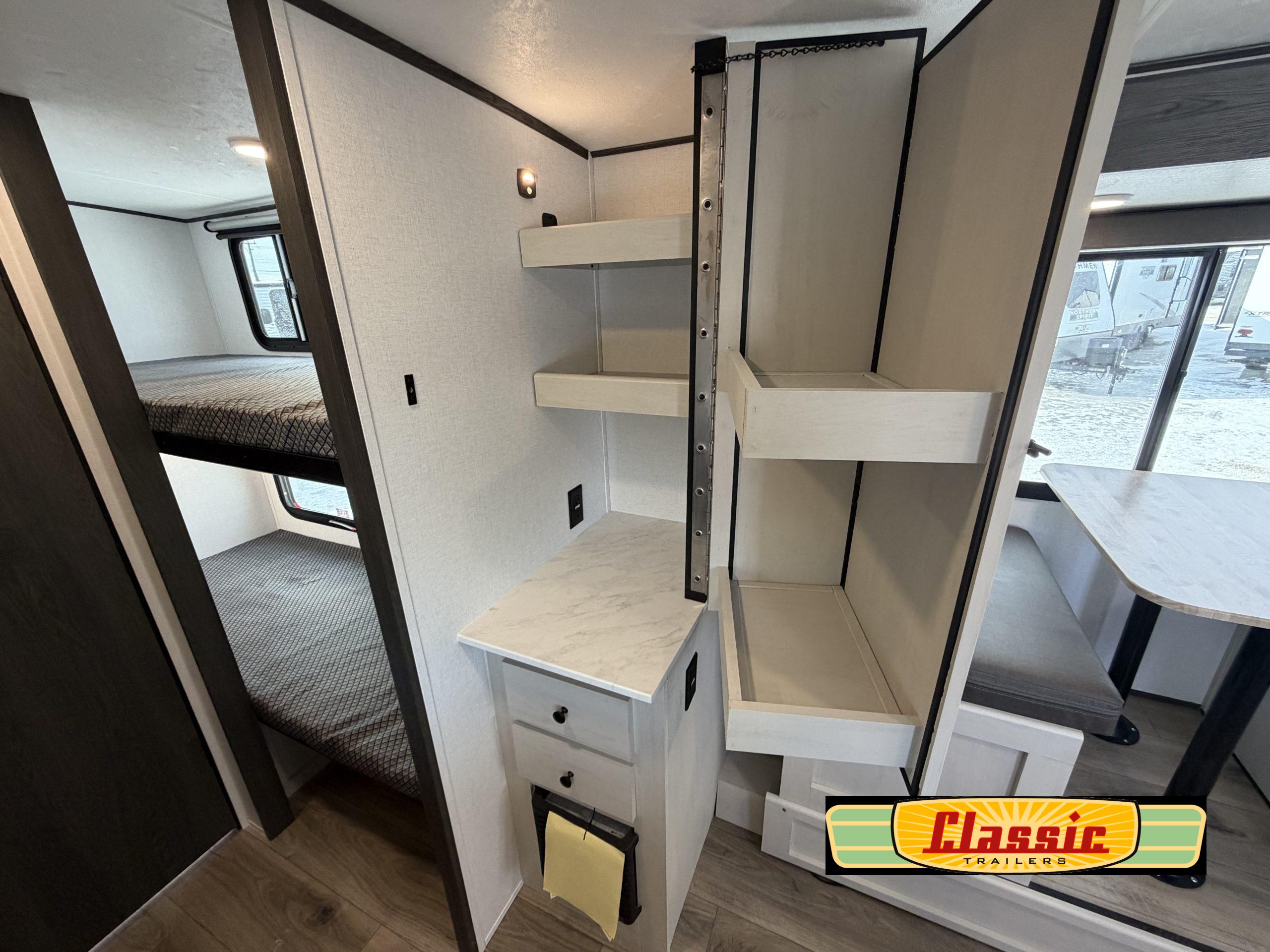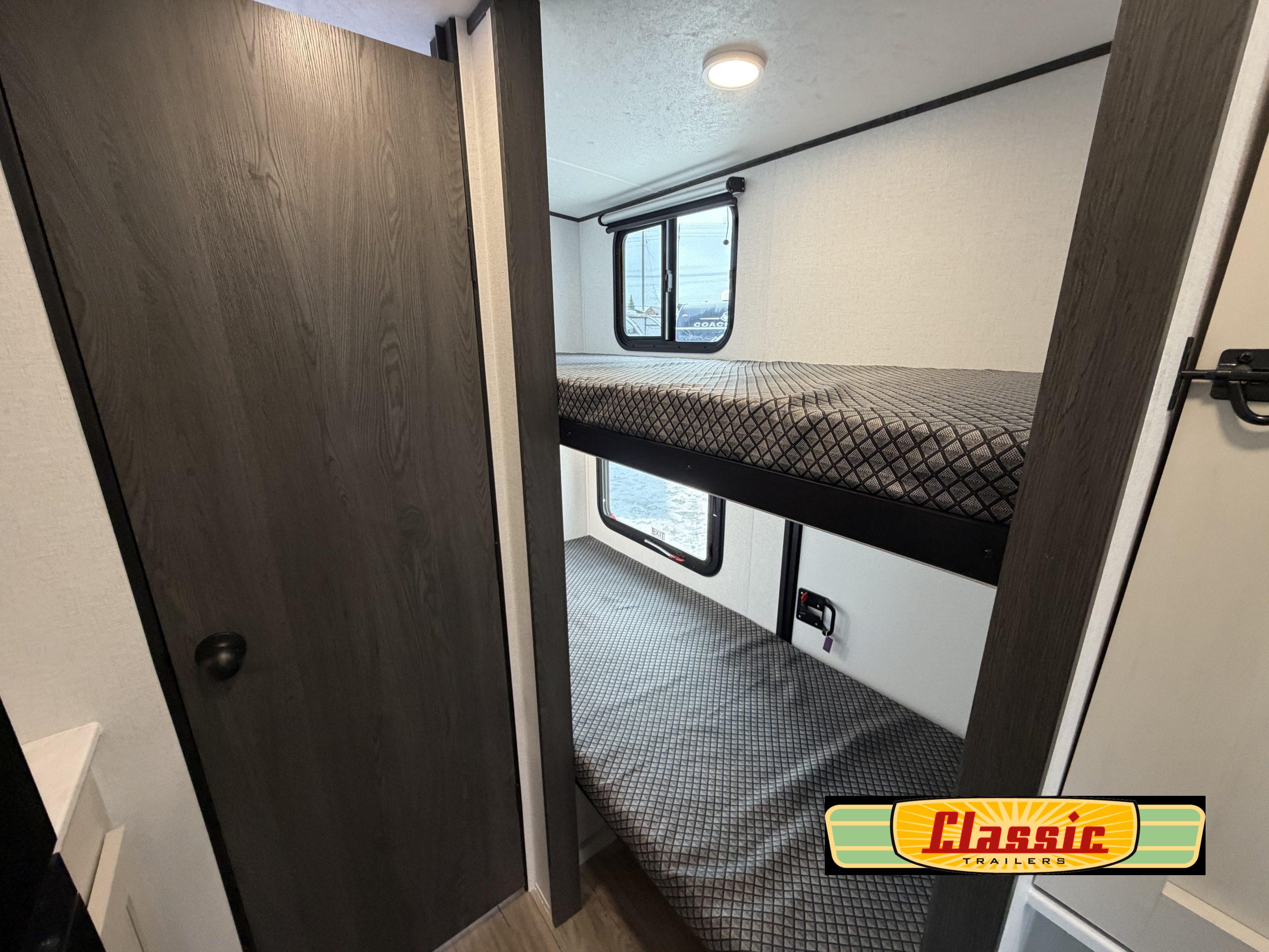 The Bijou bunkhouse model is perfect for your family of four or five! The children will love the bunks in the rear roadside corner conveniently located next to the rear corner private bath making nighttime use easy for little ones. Plus there is a bike door under the bunks to easily pack in camp gear! The booth dinette slide provides a place to dine while also providing more interior space. Up front, a 54″ x 74″ bed with overhead storage is sure to bring a great night’s rest. This is also where your front pass-through storage will be located beneath for tons of easy storage for outdoor rugs, camp chairs, games and more. For cooking, you’ll find two burner cooktop and a microwave oven, plus there is a double door refrigerator for food storage!