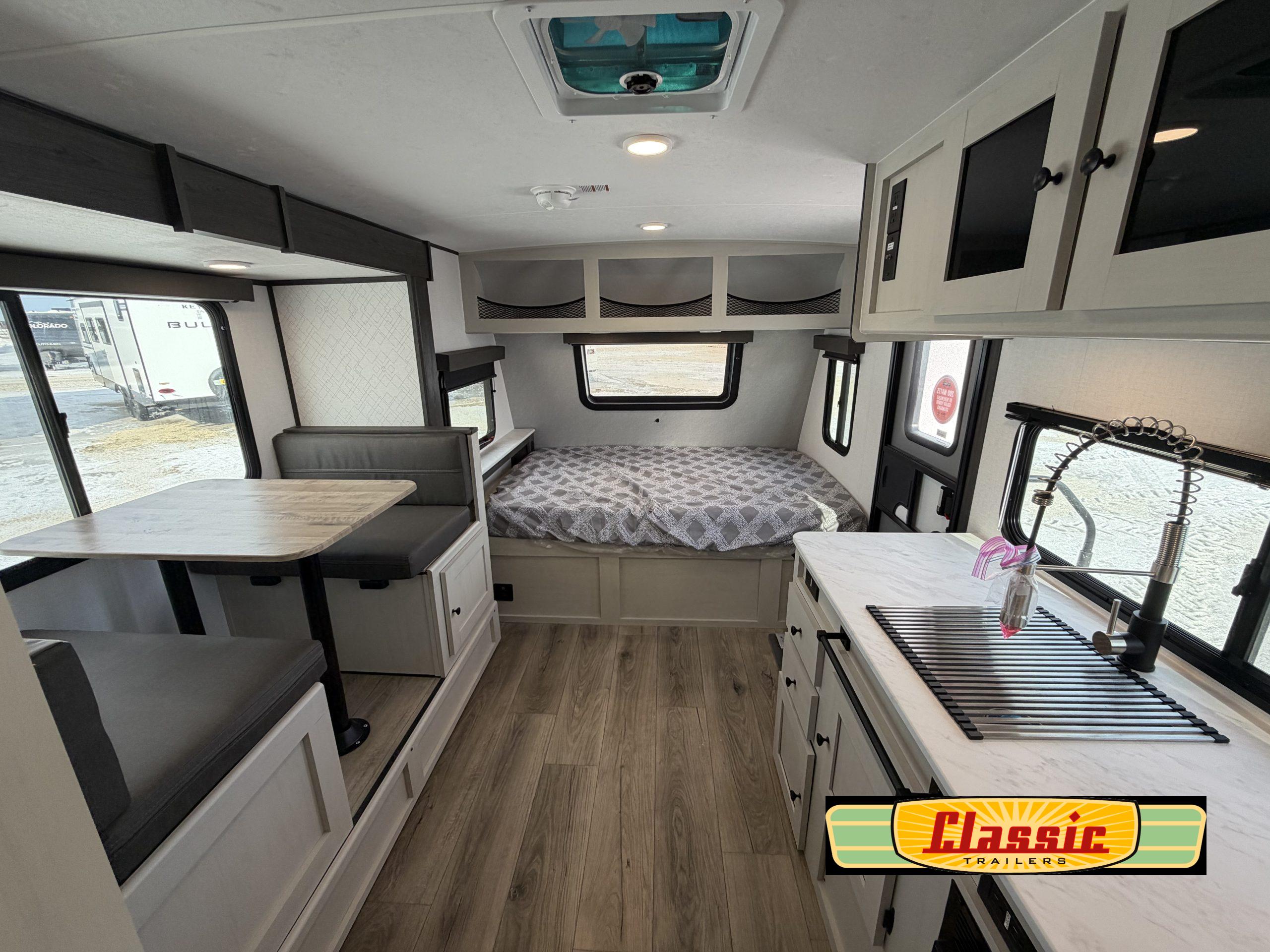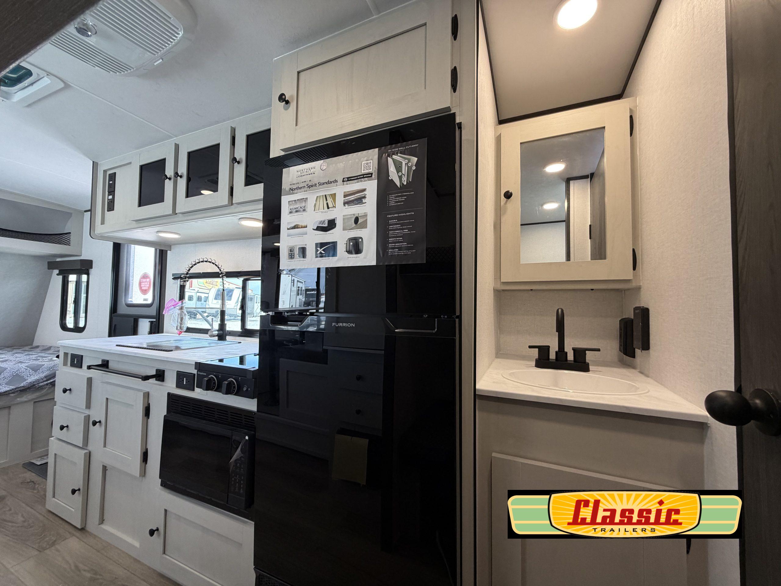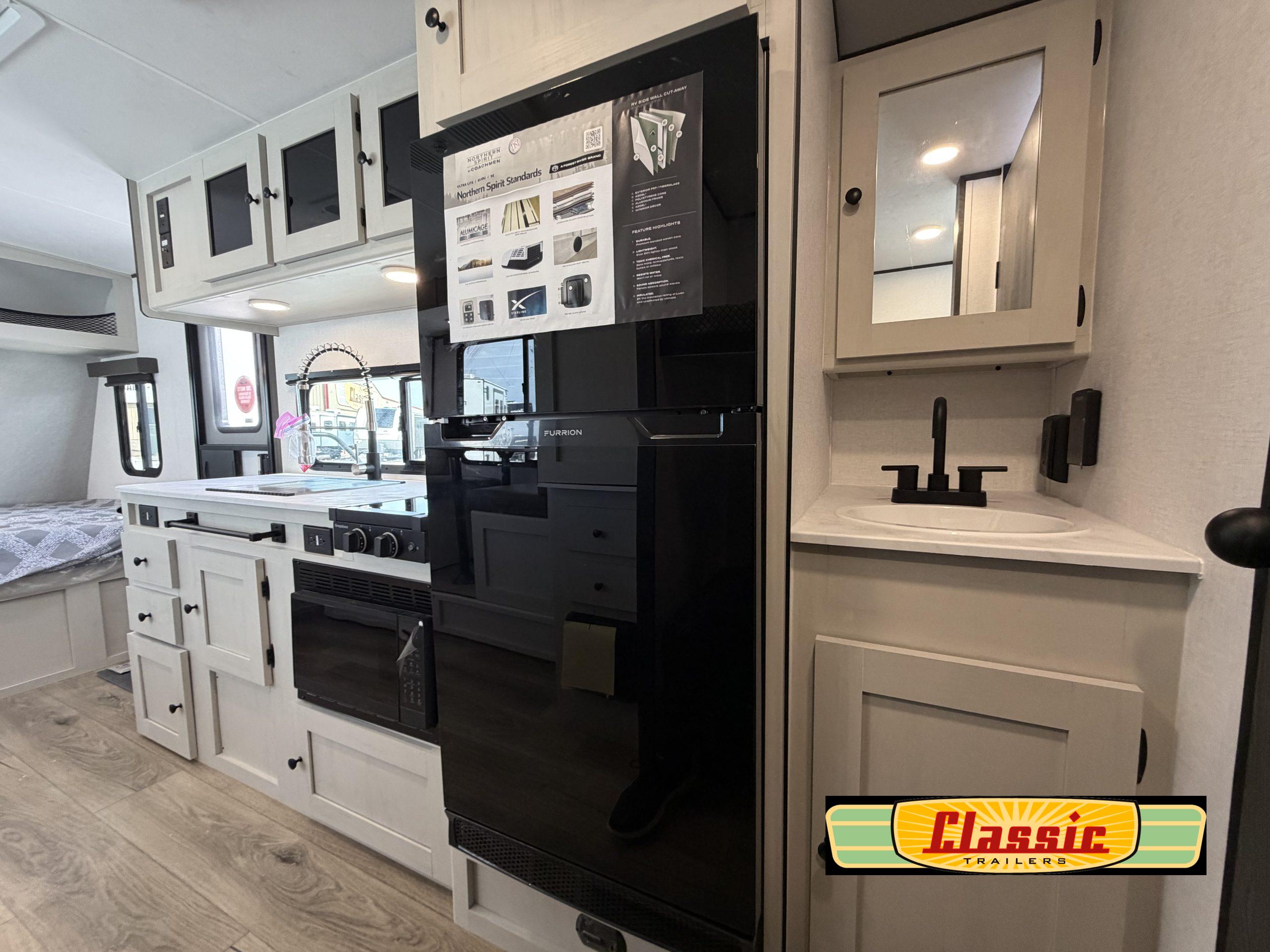 With any Northern Spirit Bijou travel trailer by Coachmen, you will find a solid built RV thanks to the dual Azdel laminated and aluminum framed sidewalls and rear wall, a fully walkable roof, plus a Darco subfloor protective wrap/enclosure. There is also a premium exterior graphics package, Keyed Alike compartment doors, a power awning with an LED light, and fishing pole storage in the front pass-through. The interior will have you feeling right at home with stylish night shades, seamless Thermofoil countertops, Congoleum linoleum flooring, and a stainless steel sink. The USB ports throughout will help you keep your electronics charged, and the TV prep will give you the option to add a television for entertainment.