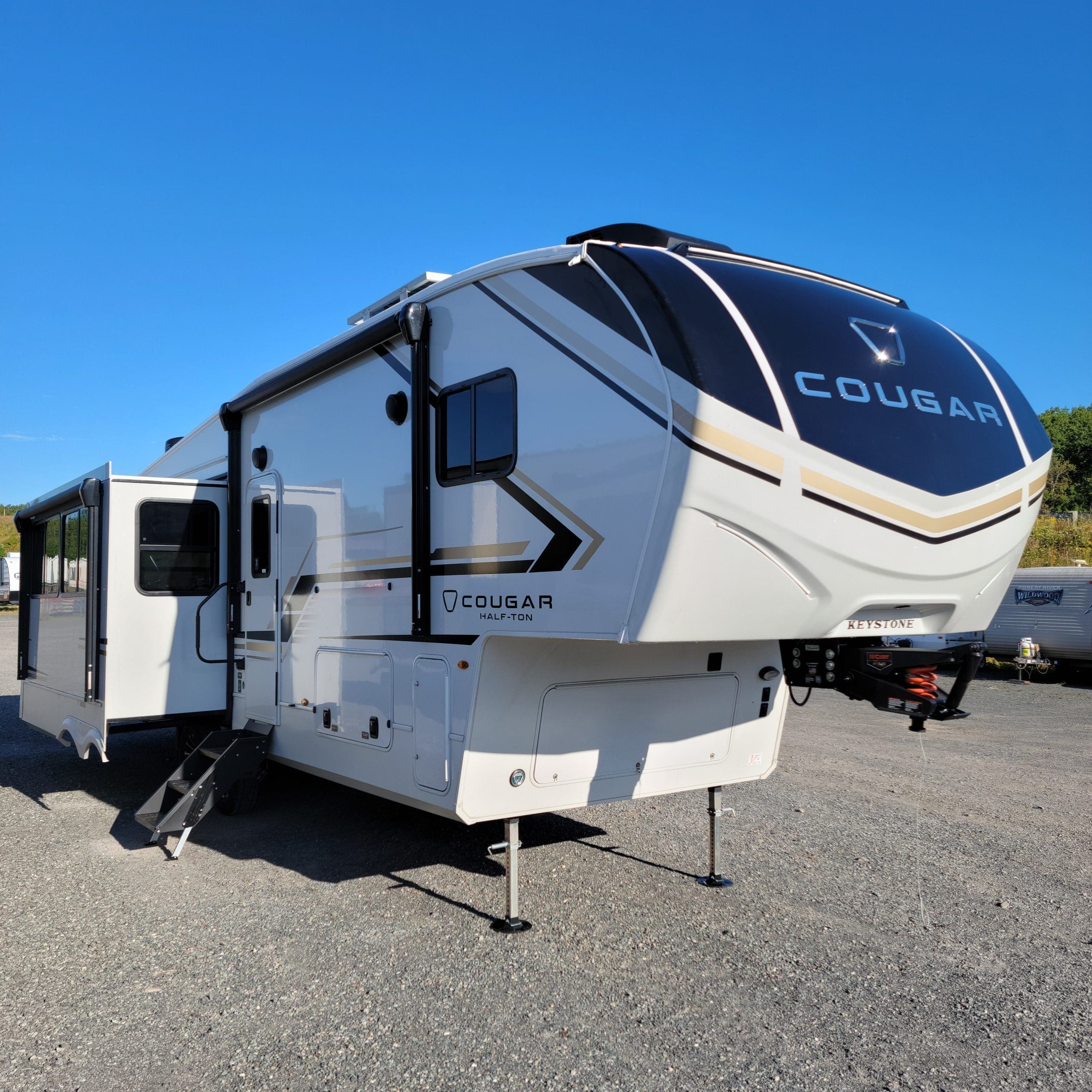 The 2026 Cougar Half-Ton 28RLI is a feature-packed rear-living fifth wheel built for comfort and versatility, ideal for both weekend getaways and longer adventures thanks to its lightweight, towable-by-half-ton-truck design and climate-controlled, solar-ready features. Key elements include a spacious opposing slides in the living area, comfortable theater seating, a chef-friendly kitchen with an island and pantry, and a dedicated bedroom with a king-size bed and abundant storage. The exterior boasts an automatic leveling system, dual-pane windows, and a large pass-through storage compartment, ensuring convenience and durability for years of exploration.