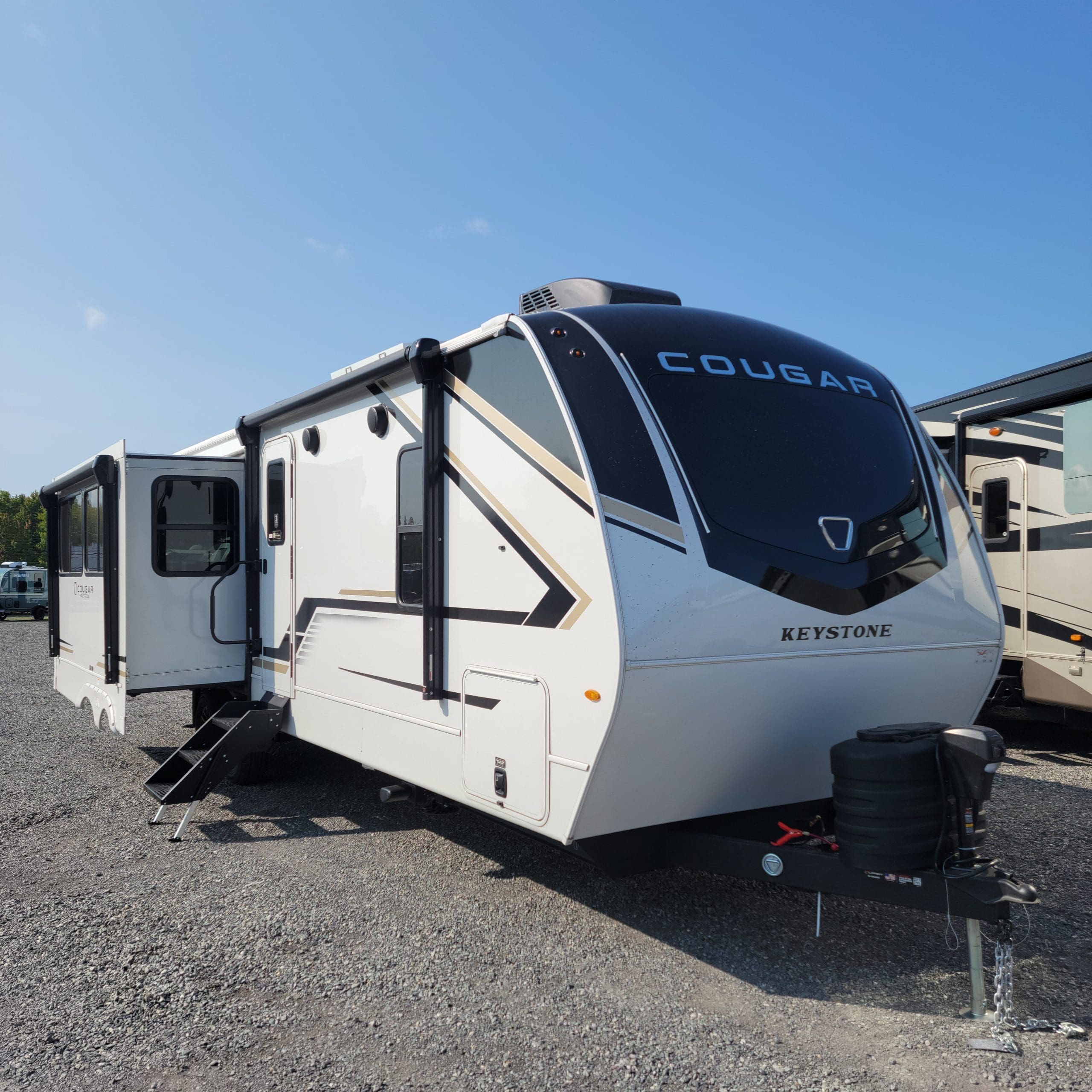 The 2026 Cougar Half-Ton 29RLP is a luxury travel trailer featuring a rear living area with theater seating, a spacious kitchen with an island, and a private front bedroom with a king bed. Key features include two opposing slides, a friction hinge entry door with an extra-wide step, dual power awnings with LED lighting, a large pass-through storage compartment, and the convenience of a built-in entertainment center. It boasts an upgraded exterior with an automotive-grade fiberglass front cap and a durable, climate-controlled construction including a heated and enclosed underbelly and an Alpha Ply roof membrane.