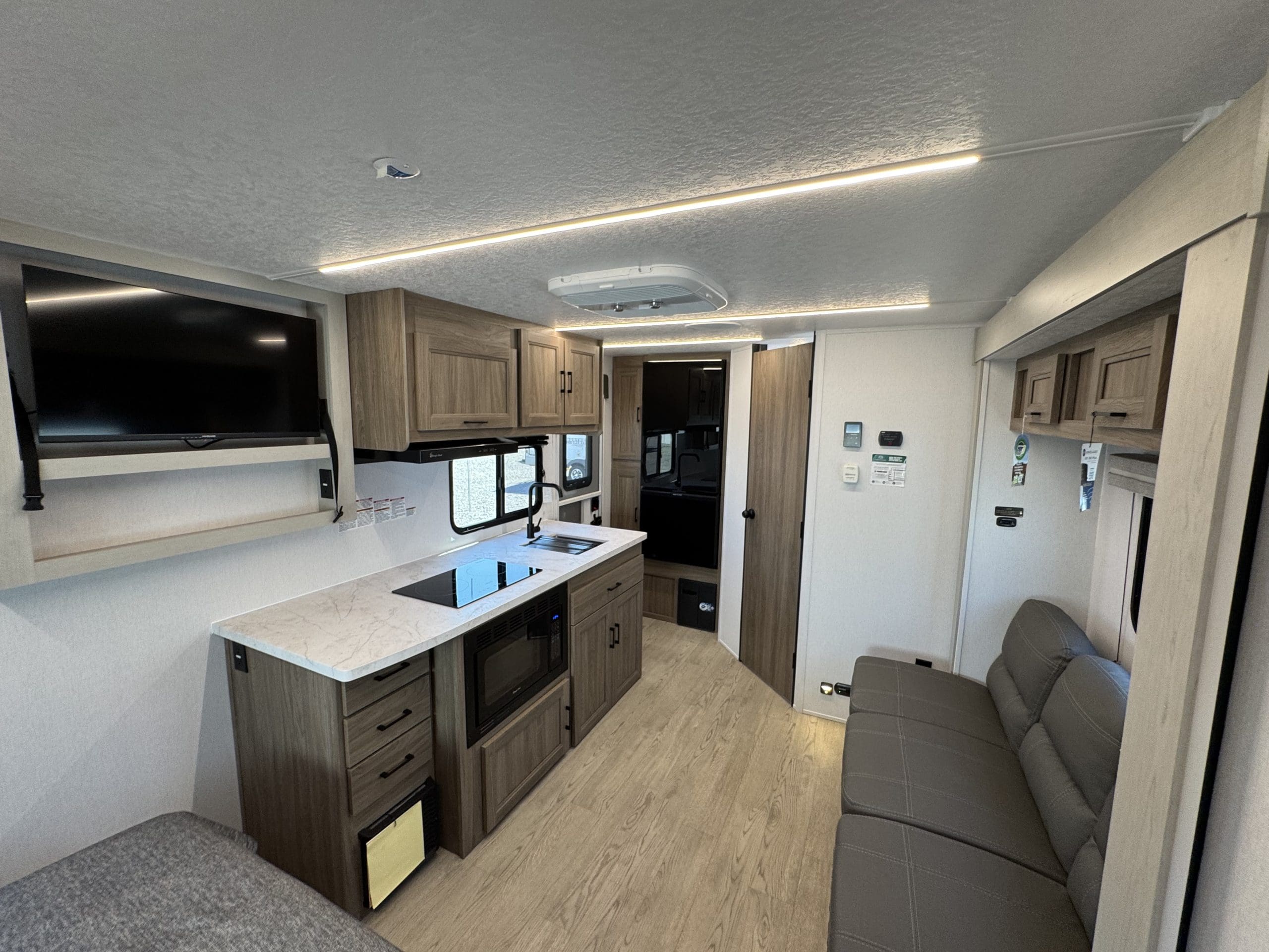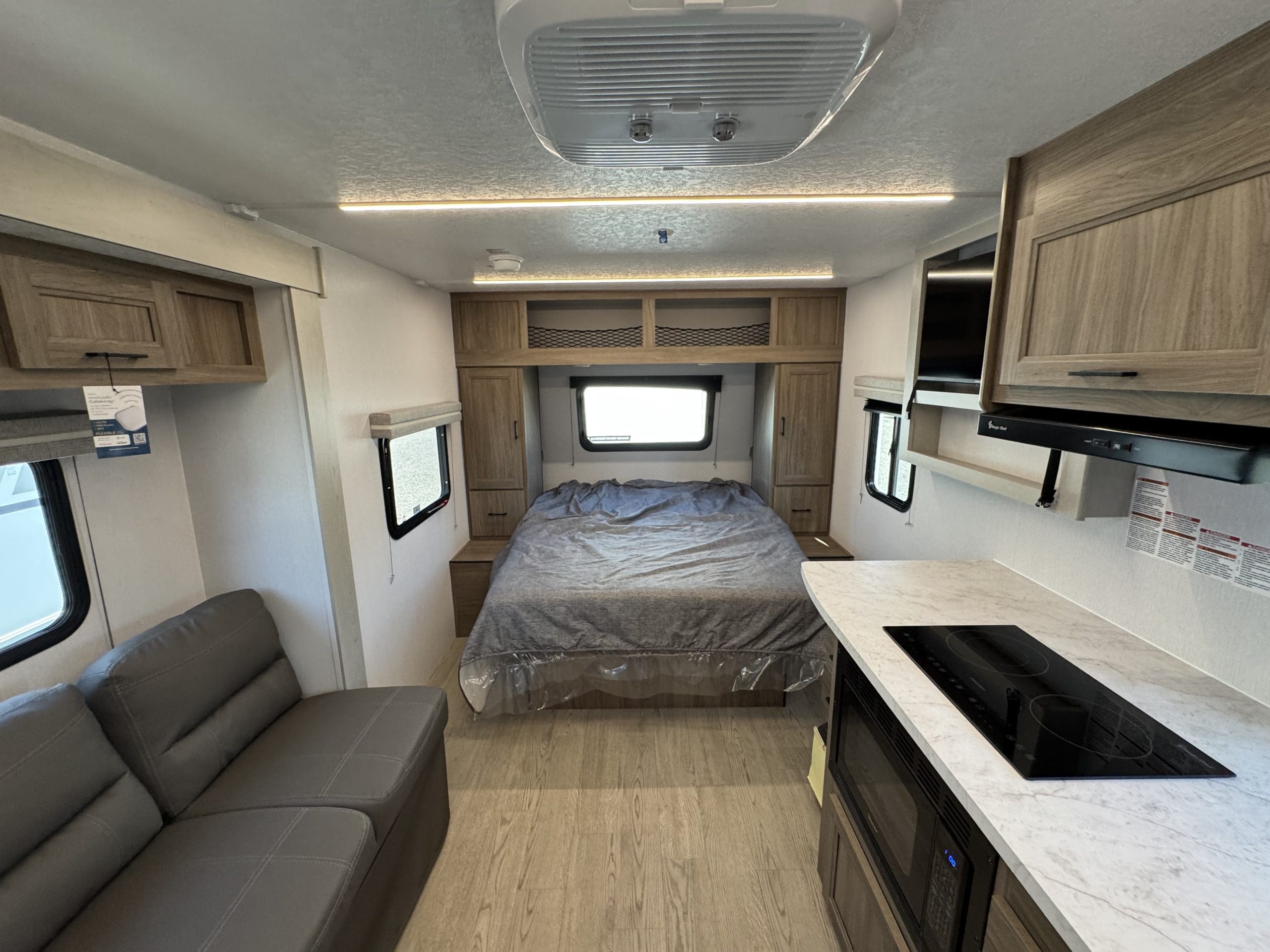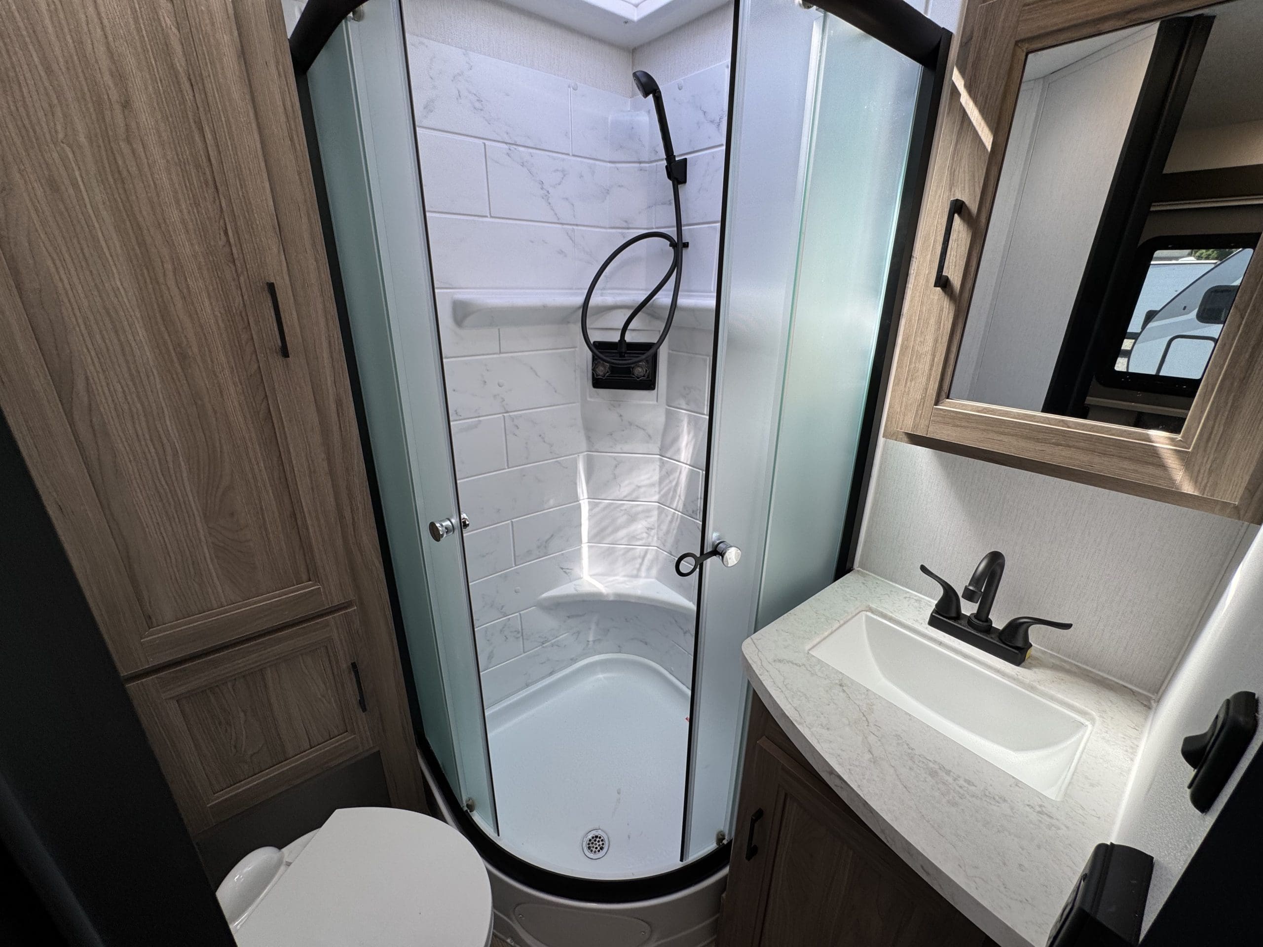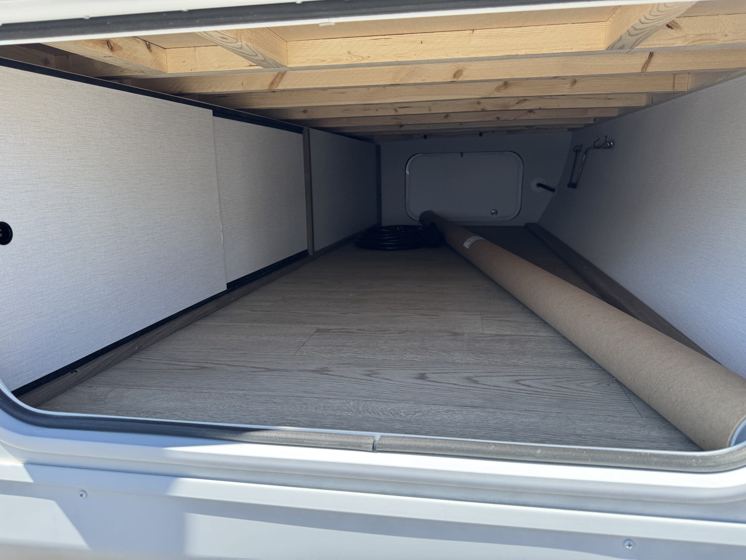 Climate Control: Equipped with a 15,000 BTU roof air conditioner and a tankless water heater, providing efficient cooling and endless hot water.