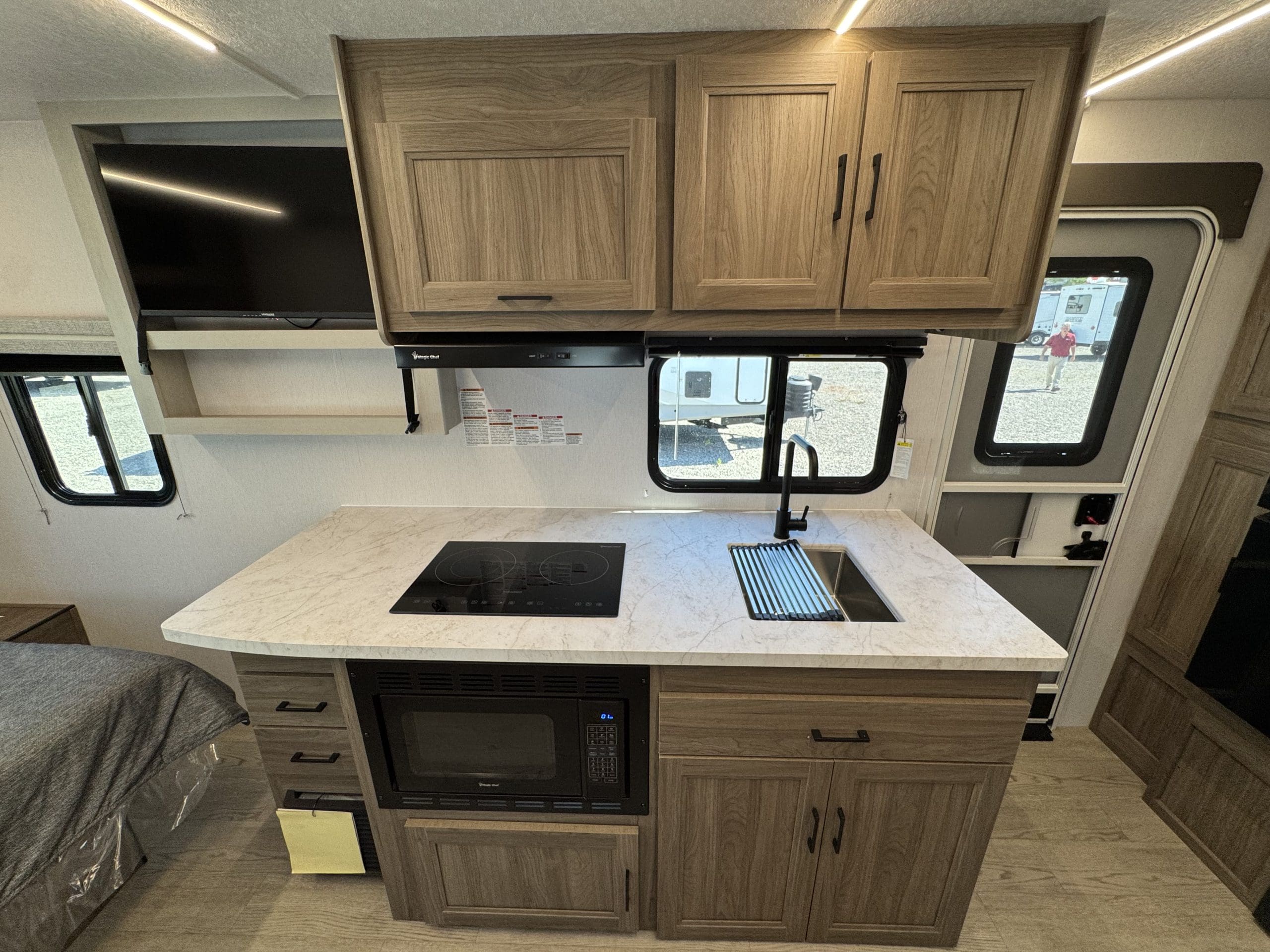 Efficient Kitchen Setup: Equipped with a 2-burner cooktop, 12V 10 cu. ft. double-door refrigerator, microwave, and stainless steel sink, facilitating convenient meal preparation.
