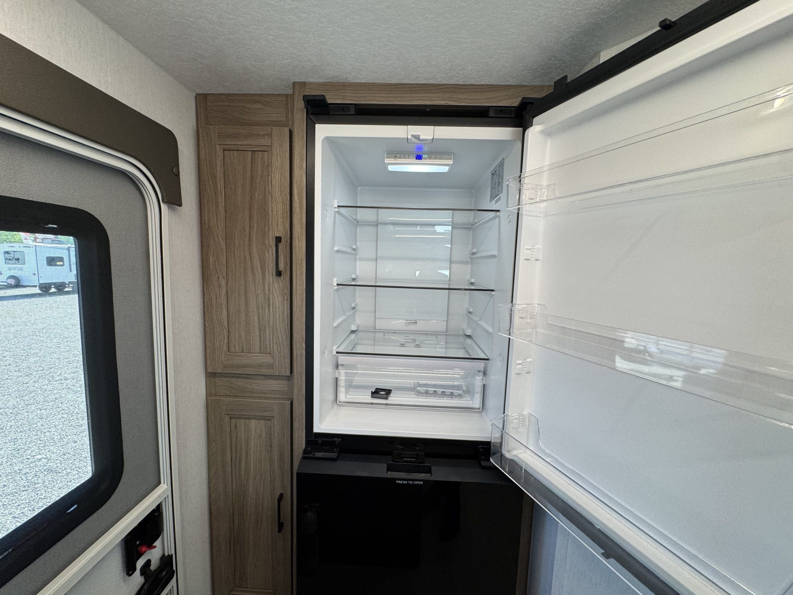 Outdoor Features: Comes with a 14′ power awning with LED lights, pass-thru storage, and a pet leash and bottle opener, enhancing outdoor living experiences.
