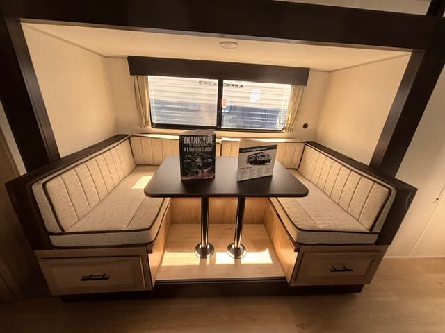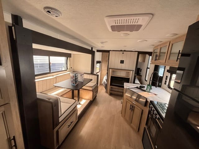The heart of the trailer is the spacious living area featuring a large U-shaped dinette slide-out, giving everyone plenty of room for meals, card games, or rainy-day movie nights. The fully equipped kitchen makes campsite cooking easy with modern appliances, lots of counter space, and plenty of storage for all your camping snacks.