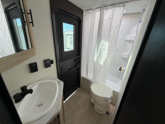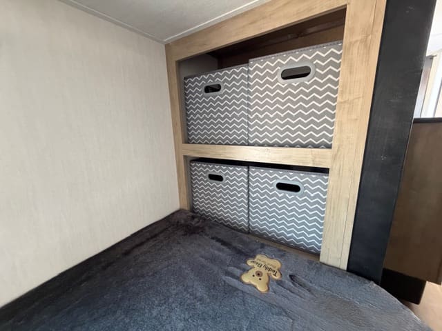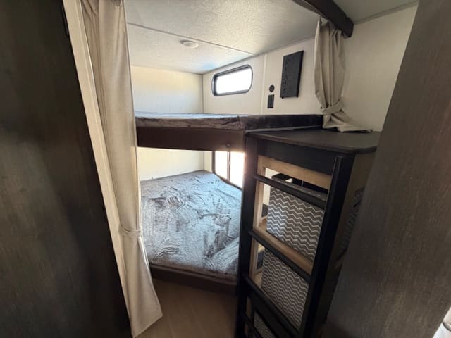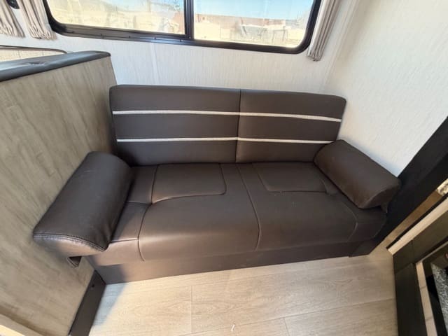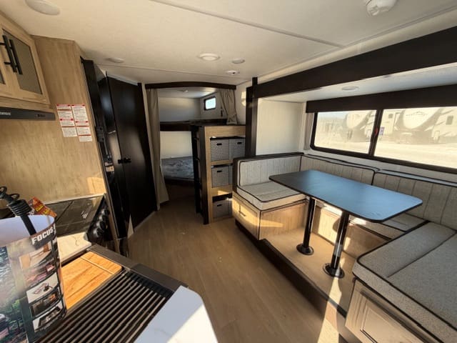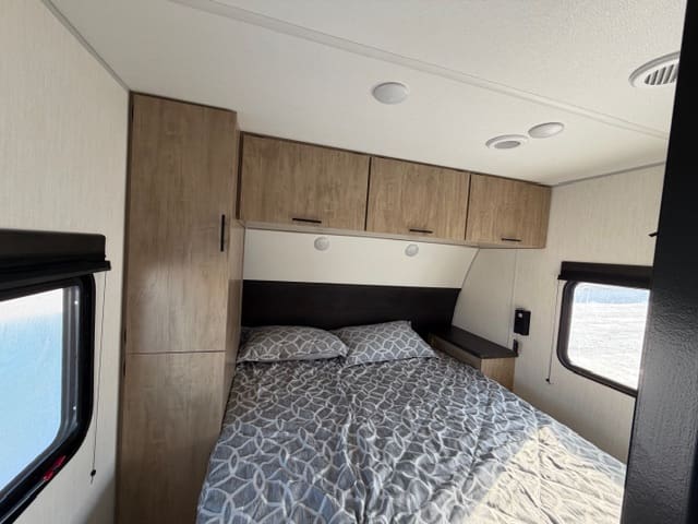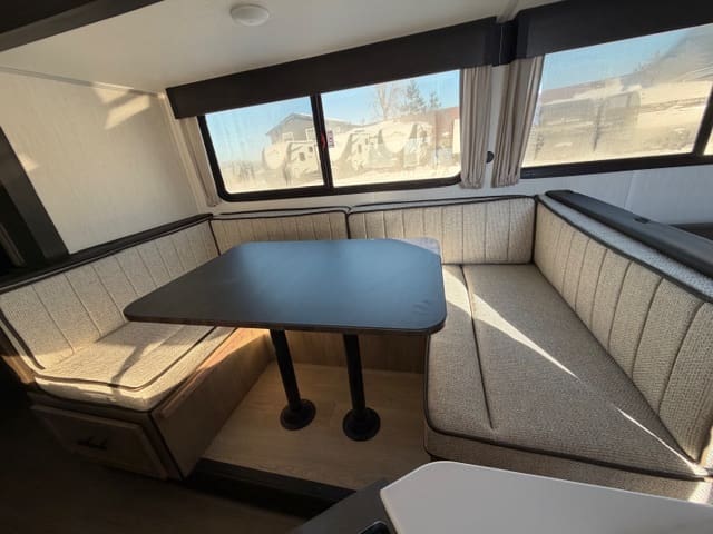 Up front, the private bedroom gives you a quiet retreat after a long day of adventure. With a comfortable bed, wardrobe storage, and separation from the main living space, it’s your own cozy escape—no dinette conversions required.