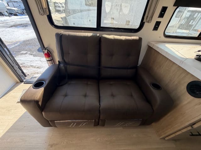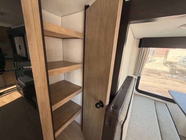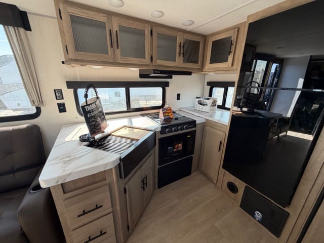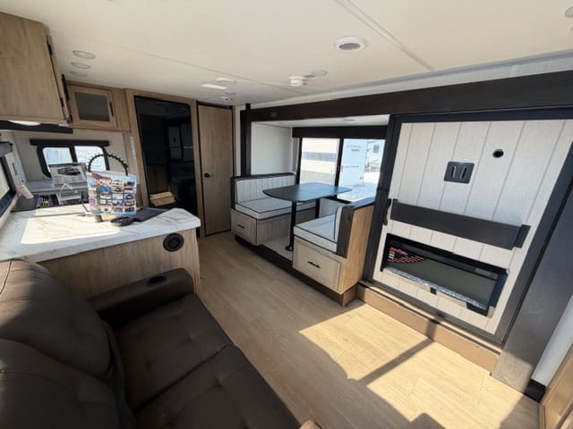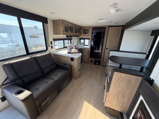 Step inside and be greeted by an inviting layout that maximizes space and livability. The spacious main living area features a comfortable dinette and lounge seating, perfect for meal times, board games, or just kicking back after a day exploring. The well-equipped kitchen makes cooking on the road a joy, with plenty of counter space, storage, and appliances that feel right at home. Large windows throughout let in natural light and connect you with the scenery outside.