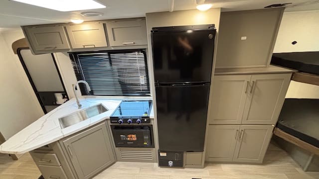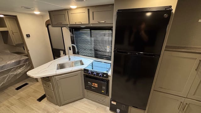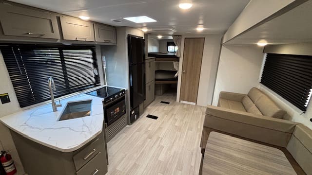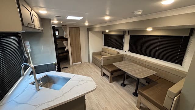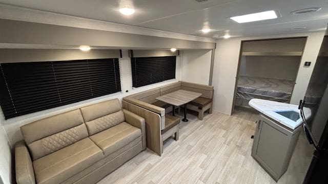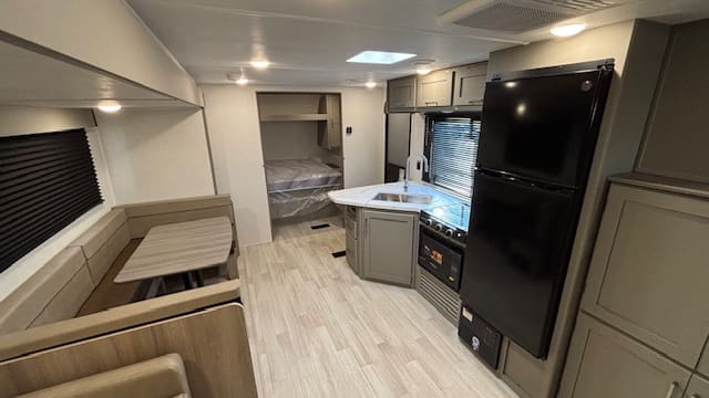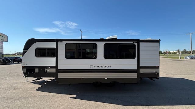 This 2026 Keystone Hideout Double Axle Sport 269DB Travel Trailer will fit perfectly for a group of 10 or less thanks to all the sleeping space! The owners will have a queen-size bed, and others can choose between the rear corner bunk beds, Jack-knife sofa or the booth dinette for bedtime. There is a full bathroom for convenience when changing and getting cleaned up, a galley kitchen with a two-burner cooktop plus a 10 cu. ft. refrigerator for the cold items.