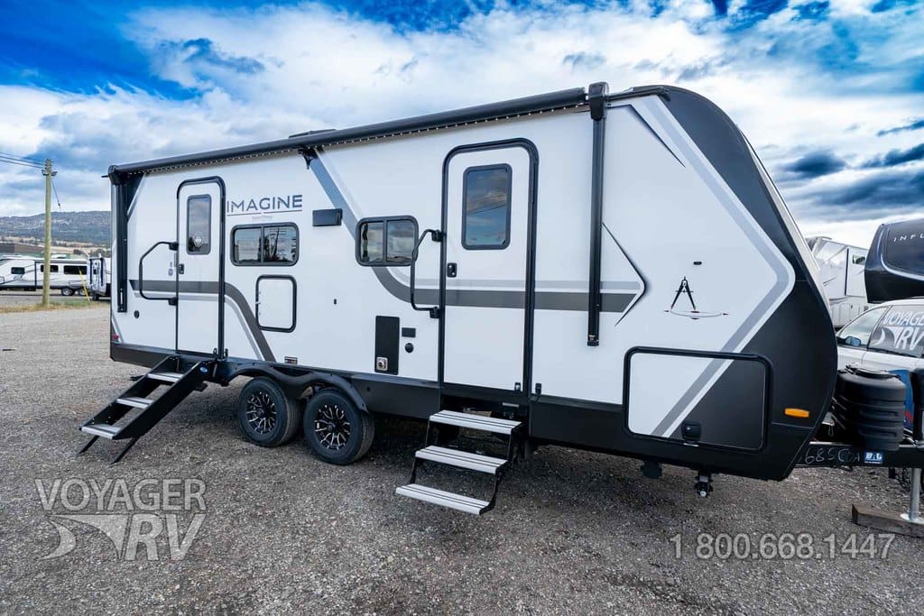 The New 2026 Grand Design Imagine 2300MK, measuring approximately 26′ 6in in length, a no bunks floorplan, sleeping up to 2 people, queen bed, equipped with 1 slide-outs, and a sofa with table dining area.