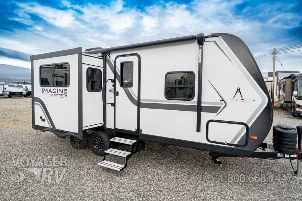 The New 2026 Grand Design Imagine XLS 22RBE, measuring approximately 25′ 11in in length, a no bunks floorplan, sleeping up to 4 people, queen bed, equipped with 1 slide-outs, and a face to face dining area.