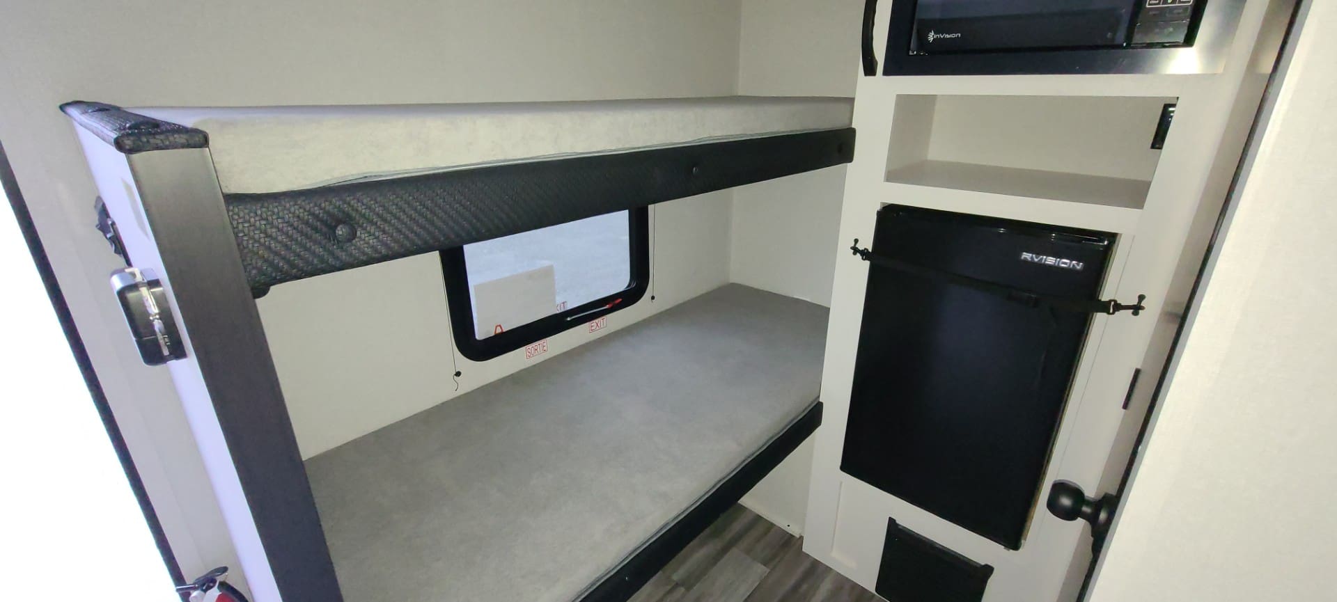 SUV towable with 3 beds! 2 twin bunk beds (30″ x 74″) and front double (54″x74″) only 2790 lbs