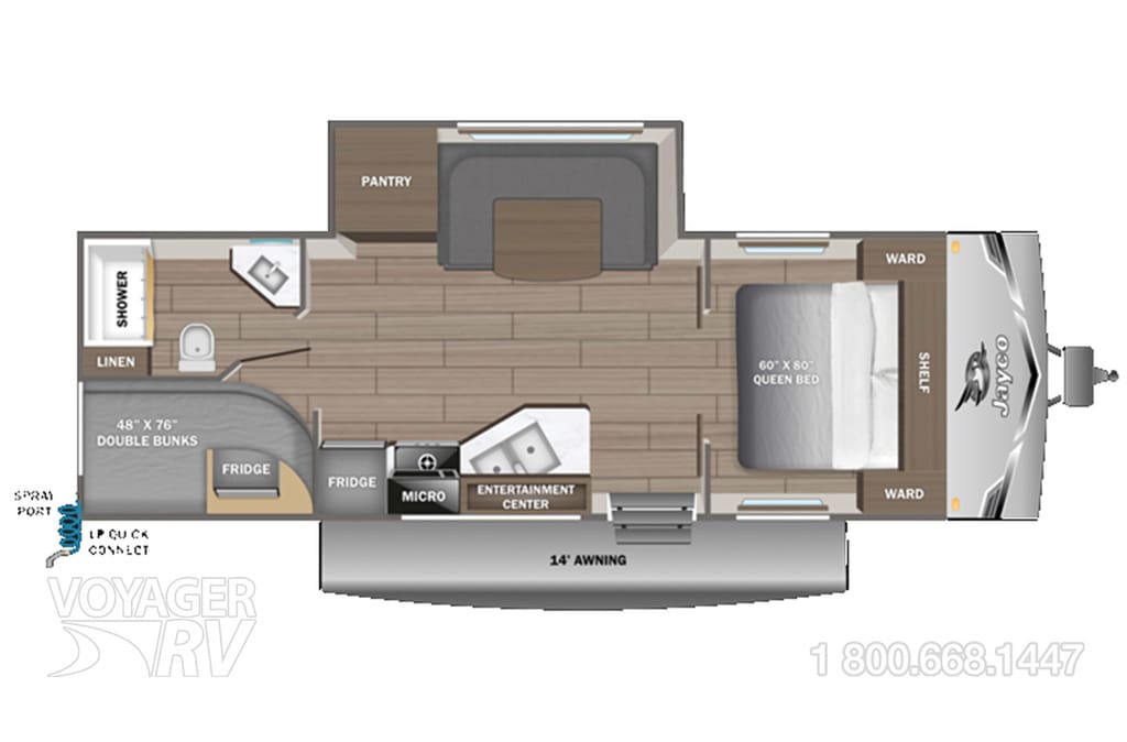 The New 2026 Jayco Jay Flight SLX 245BHSW Elite, measuring approximately 28′ 7in in length, a bunks floorplan, sleeping up to 8 people, island queen, equipped with 1 slide-outs, and a u-shaped dining area.
