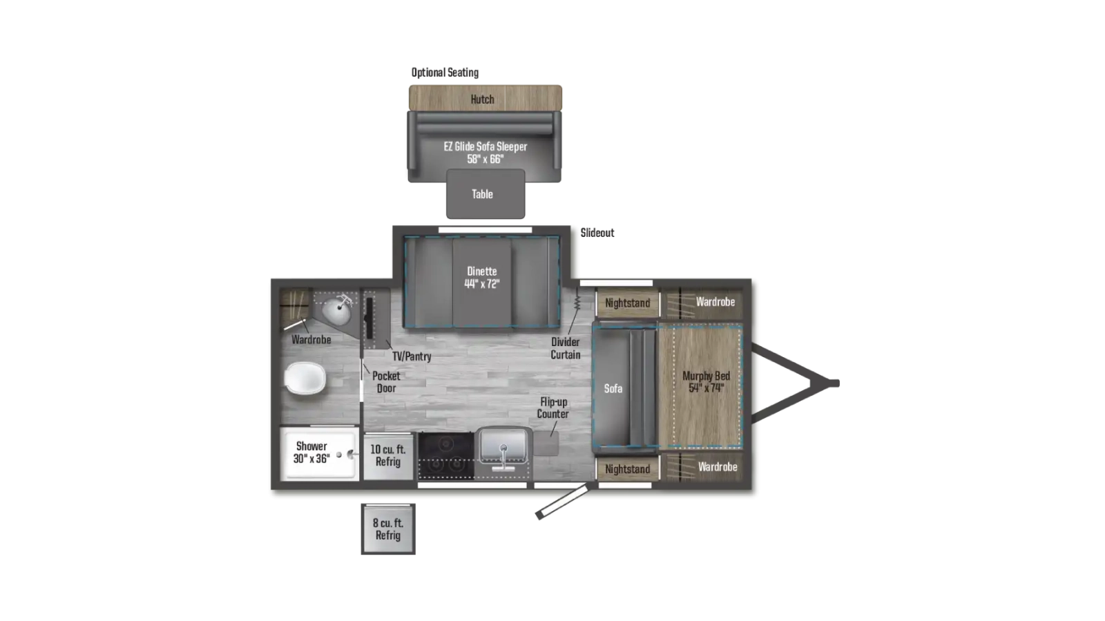At the rear, you’ll find a spacious full bathroom with added wardrobe storage, providing privacy and convenience rarely found in a trailer this size. Every detail is designed to maximize comfort without adding unnecessary weight.