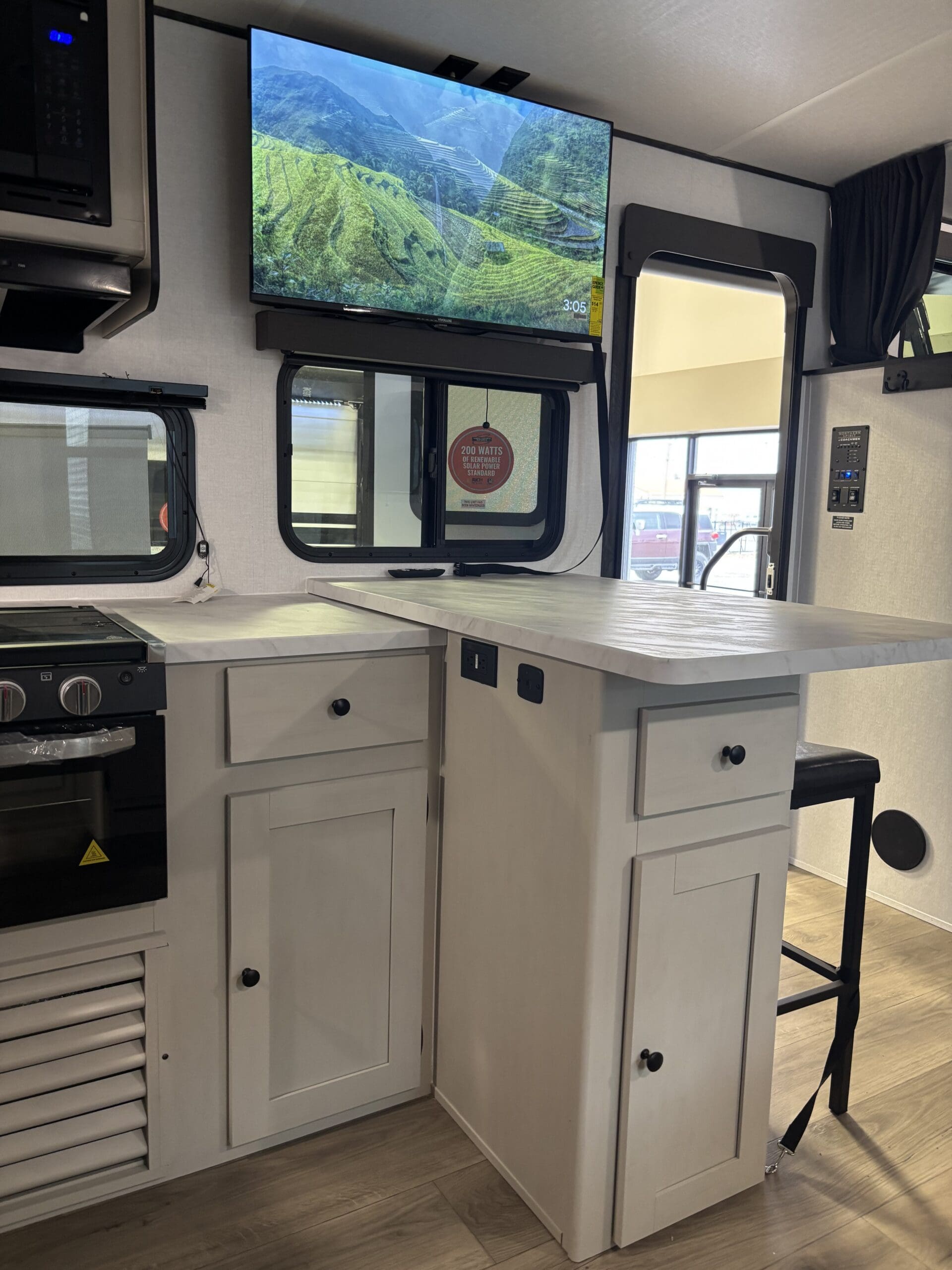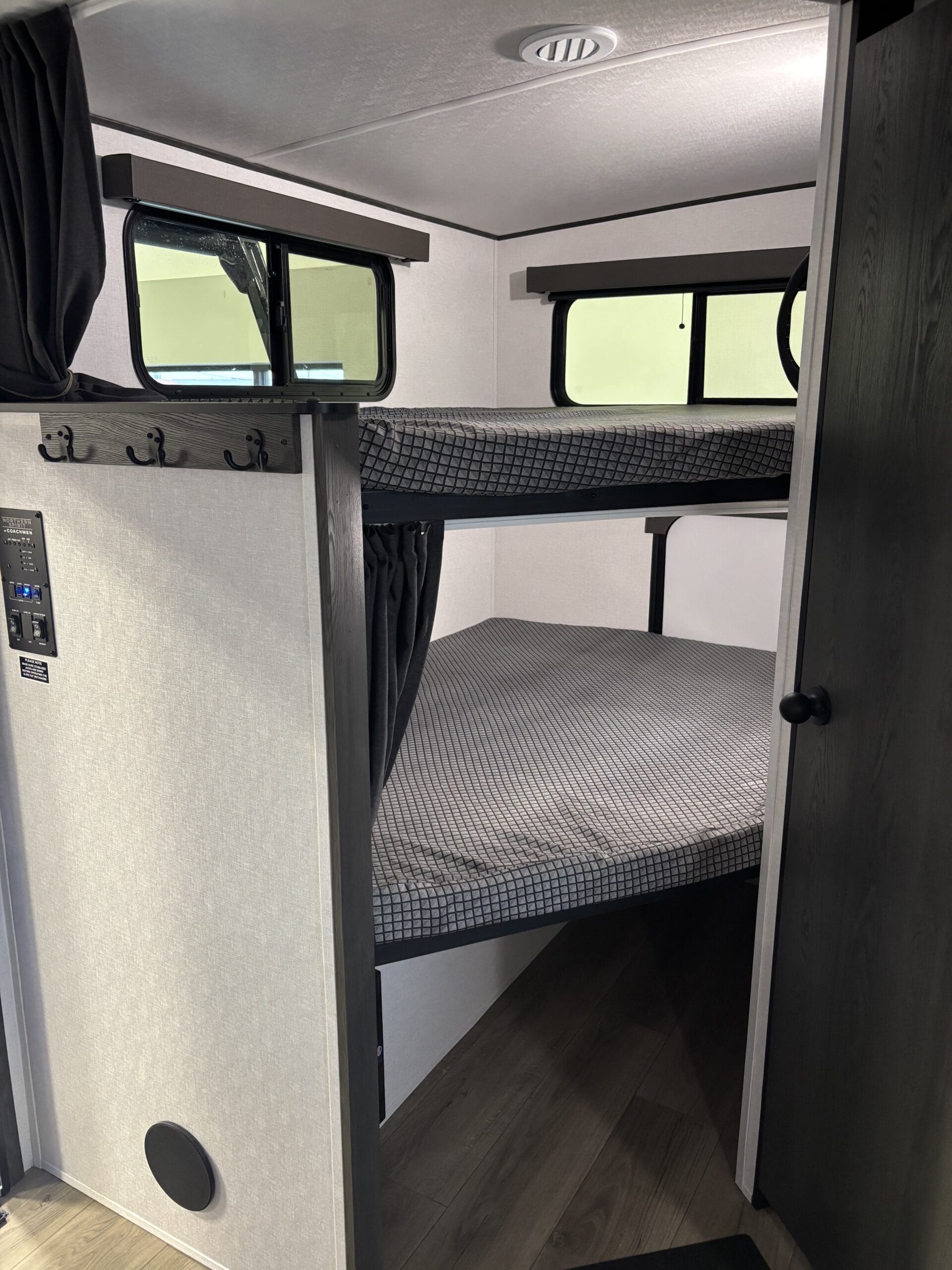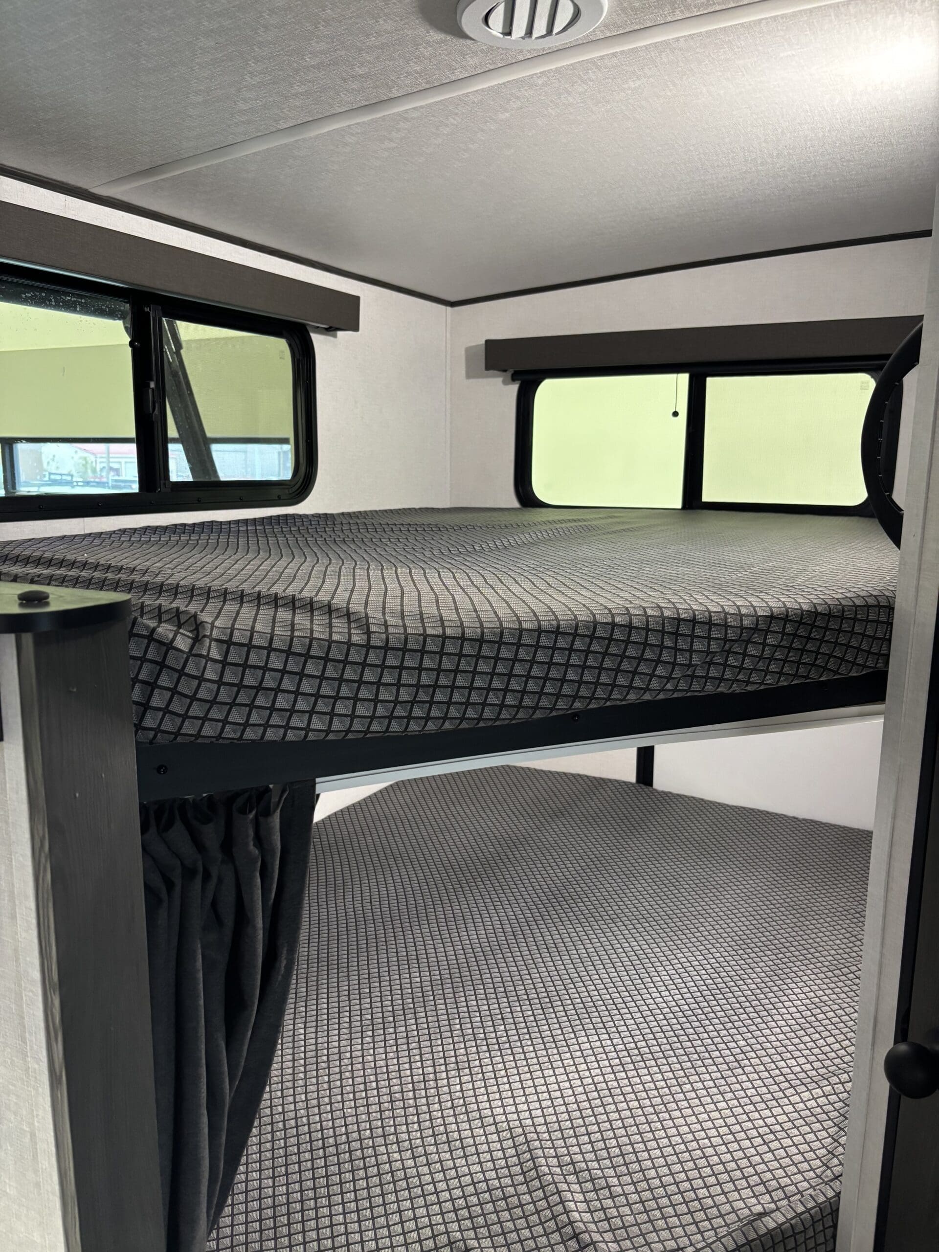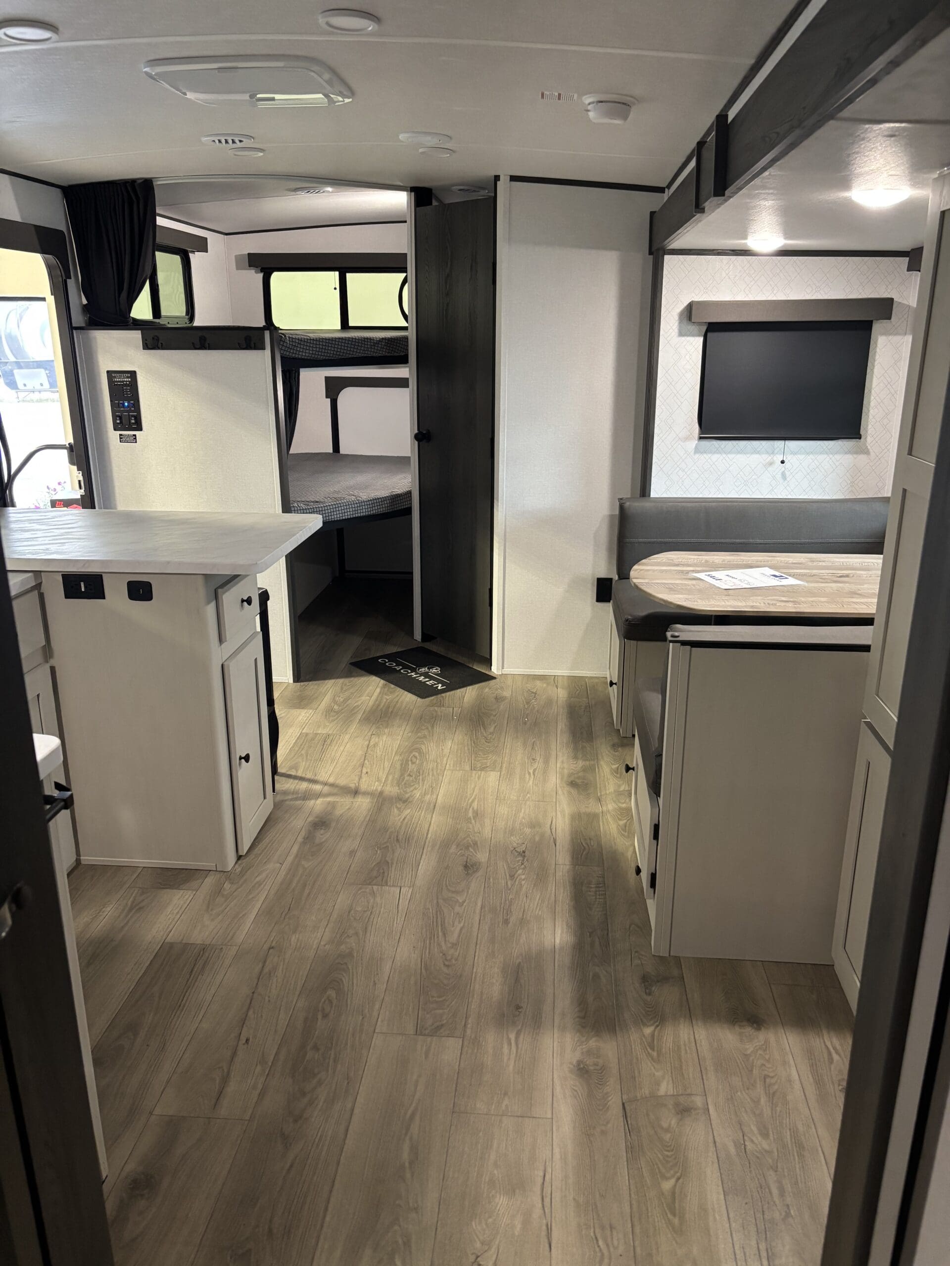 This midsize bunk floorplan is perfect for the family. Coming in under 30 feet overall and just under 6000 lb., the 2457BH features a booth dinette, a breakfast bar with chairs, huge pantry, an abundance of counterspace, double over double bunks, and an outside kitchen. The bottom bunk lifts up to make use of our “Store More” cargo center, which is perfect for bikes, coolers, kayaks, totes, or any other storage items.