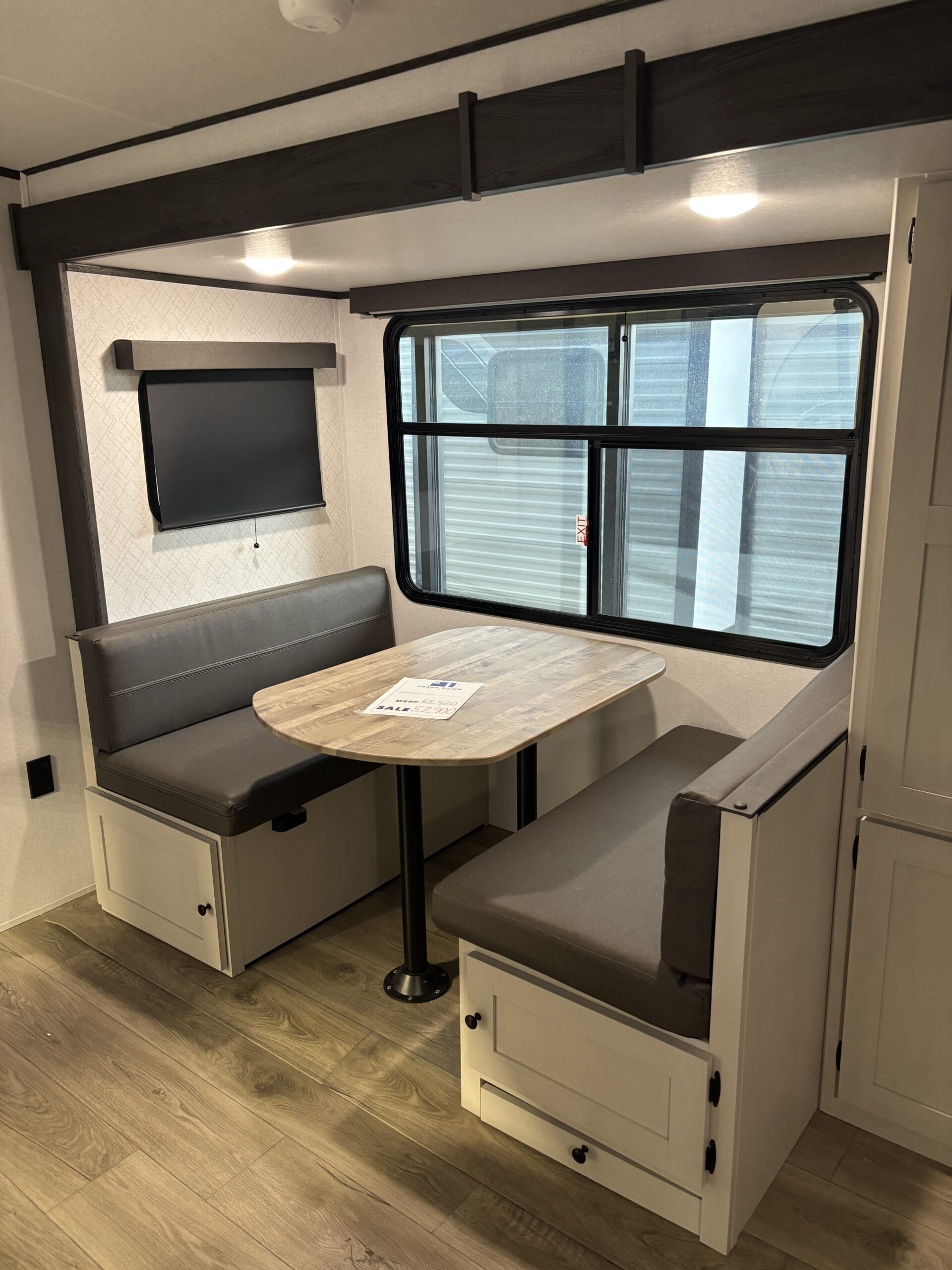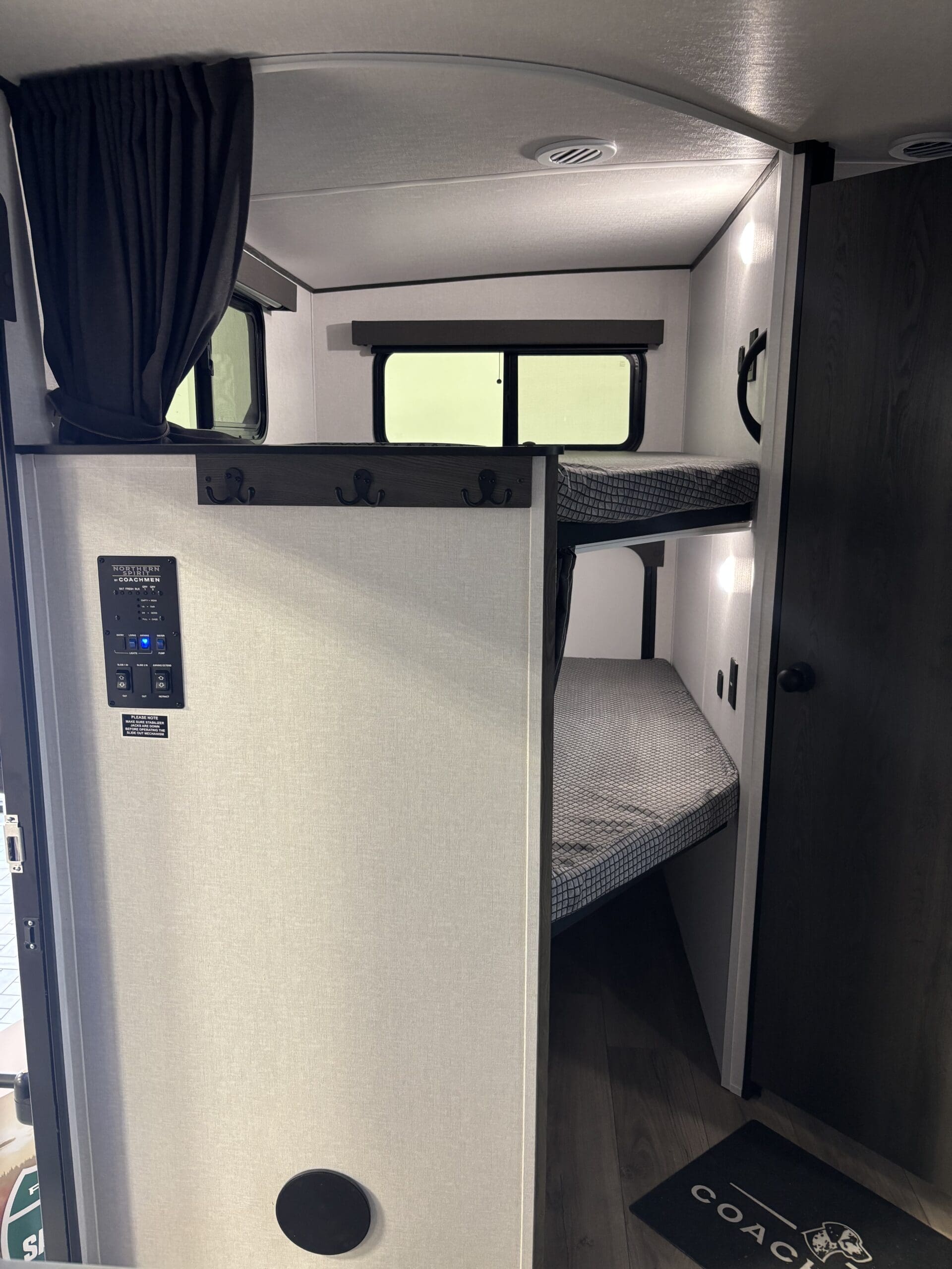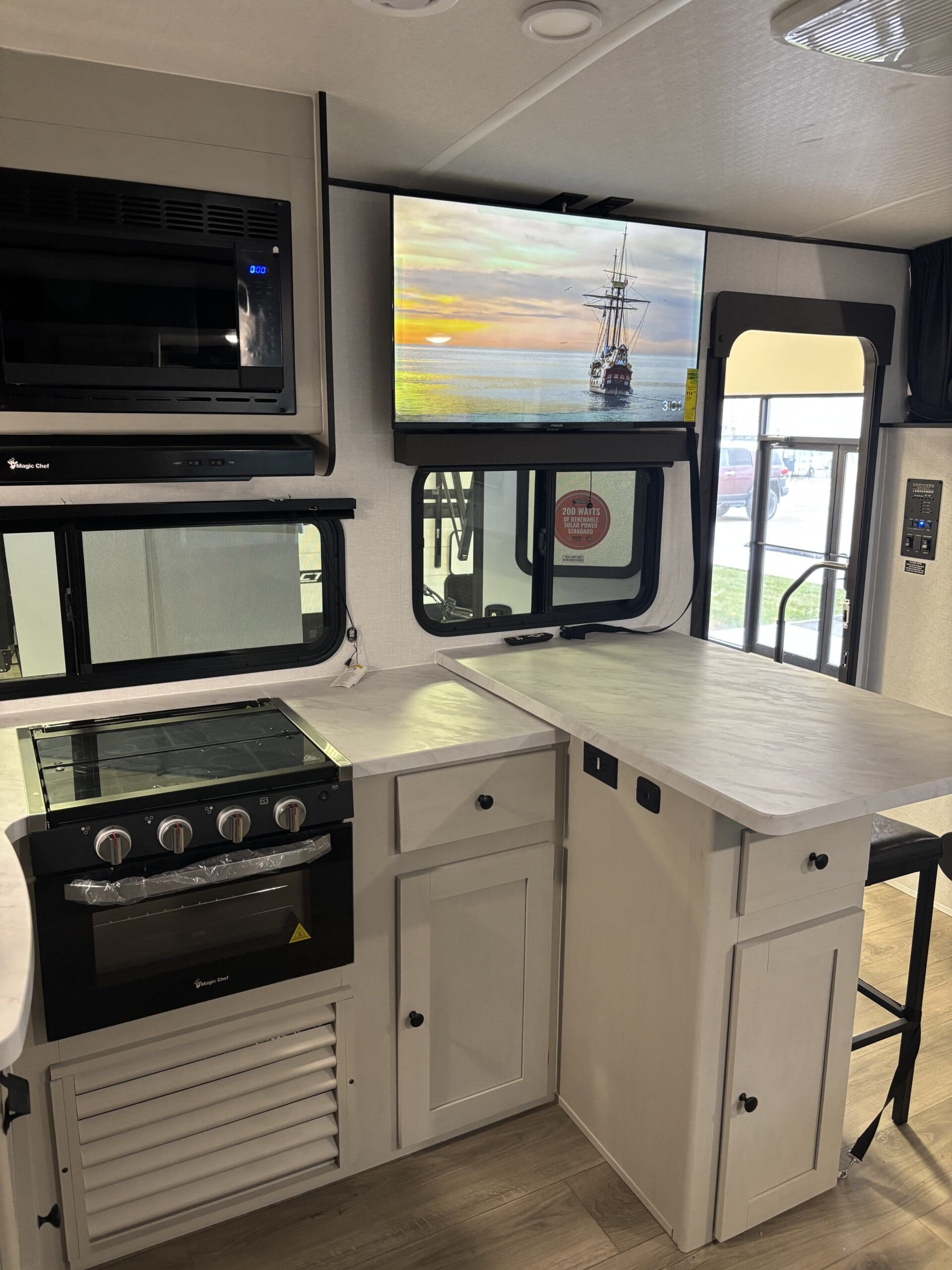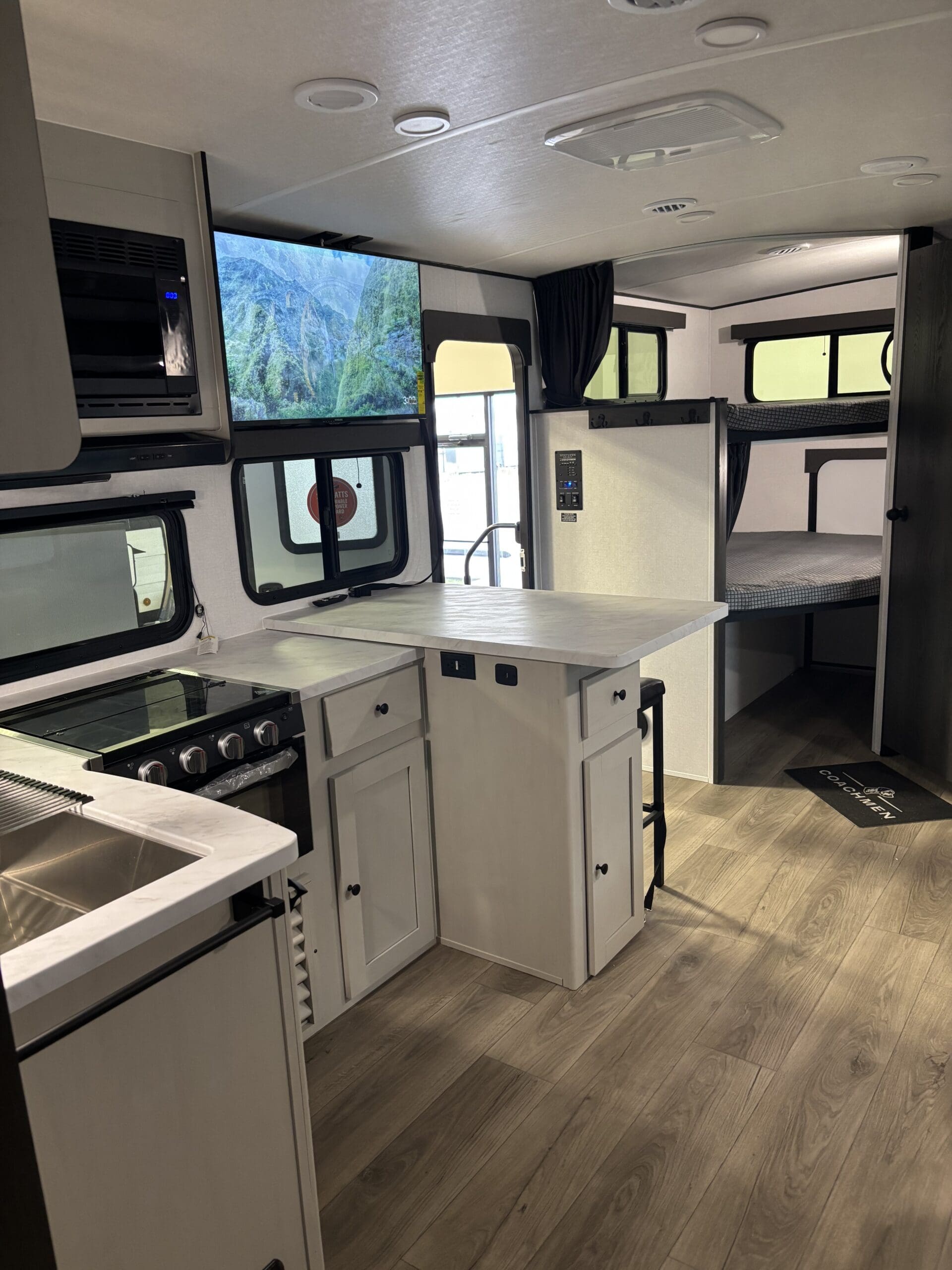This midsize bunk floorplan is perfect for the family. Coming in under 30 feet overall and just under 6000 lb., the 2457BH features a booth dinette, a breakfast bar with chairs, huge pantry, an abundance of counterspace, double over double bunks, and an outside kitchen. The bottom bunk lifts up to make use of our “Store More” cargo center, which is perfect for bikes, coolers, kayaks, totes, or any other storage items.