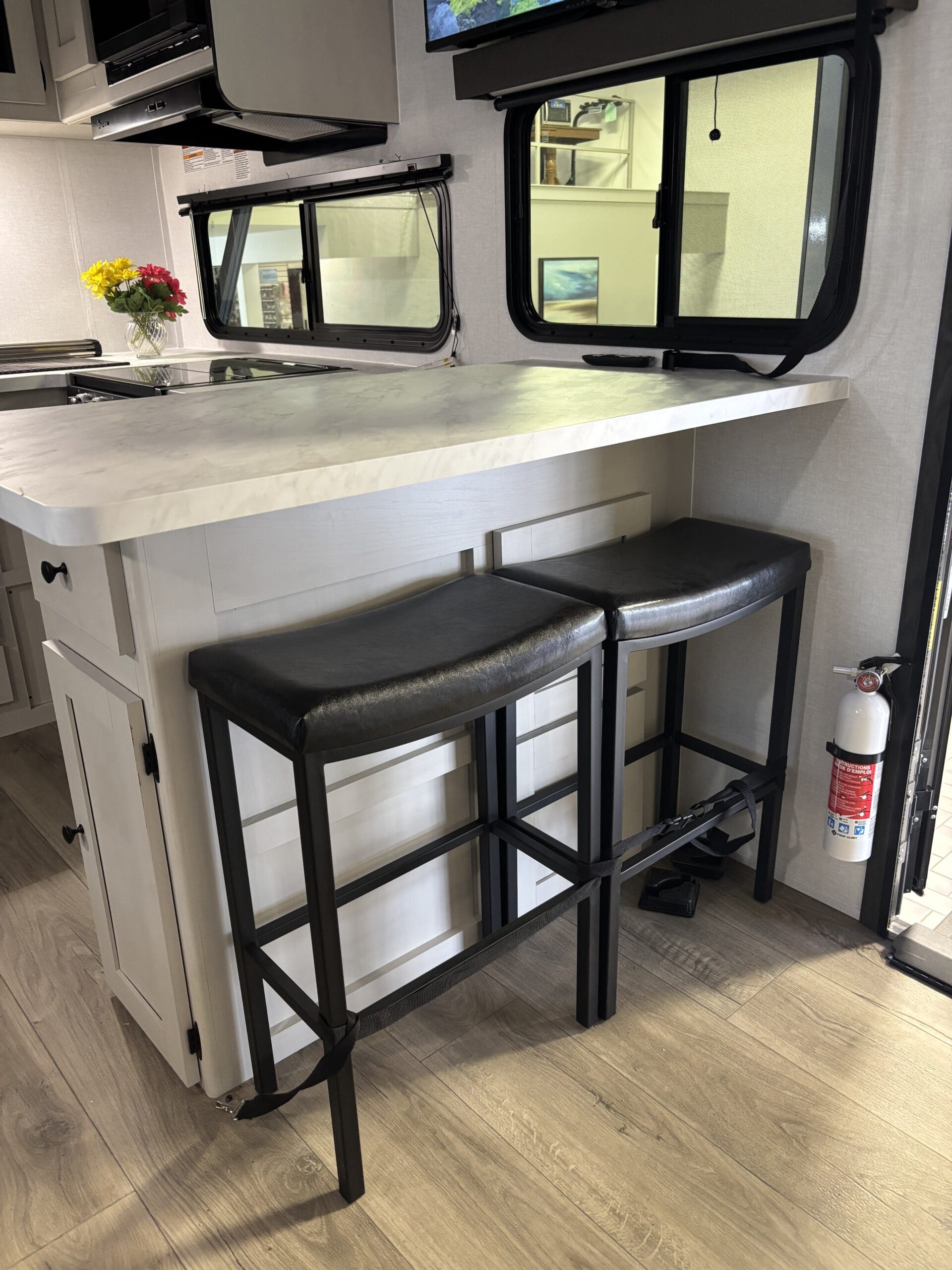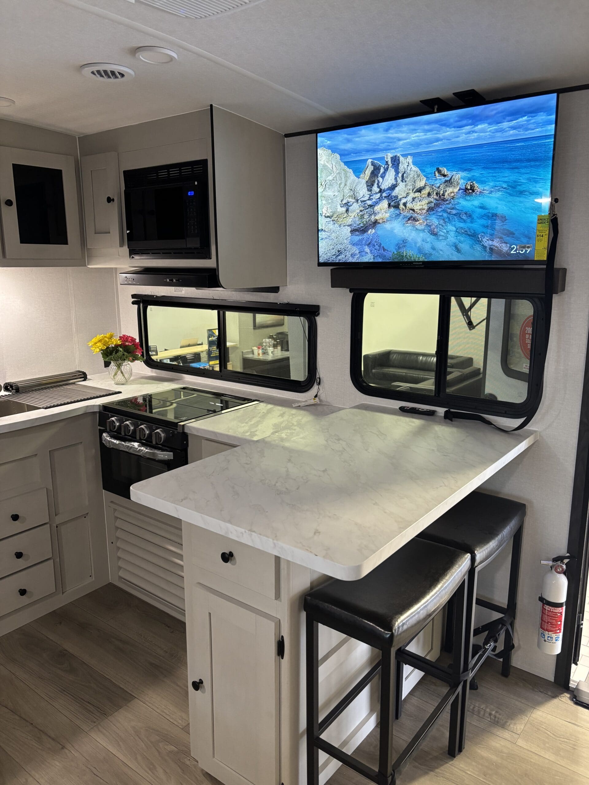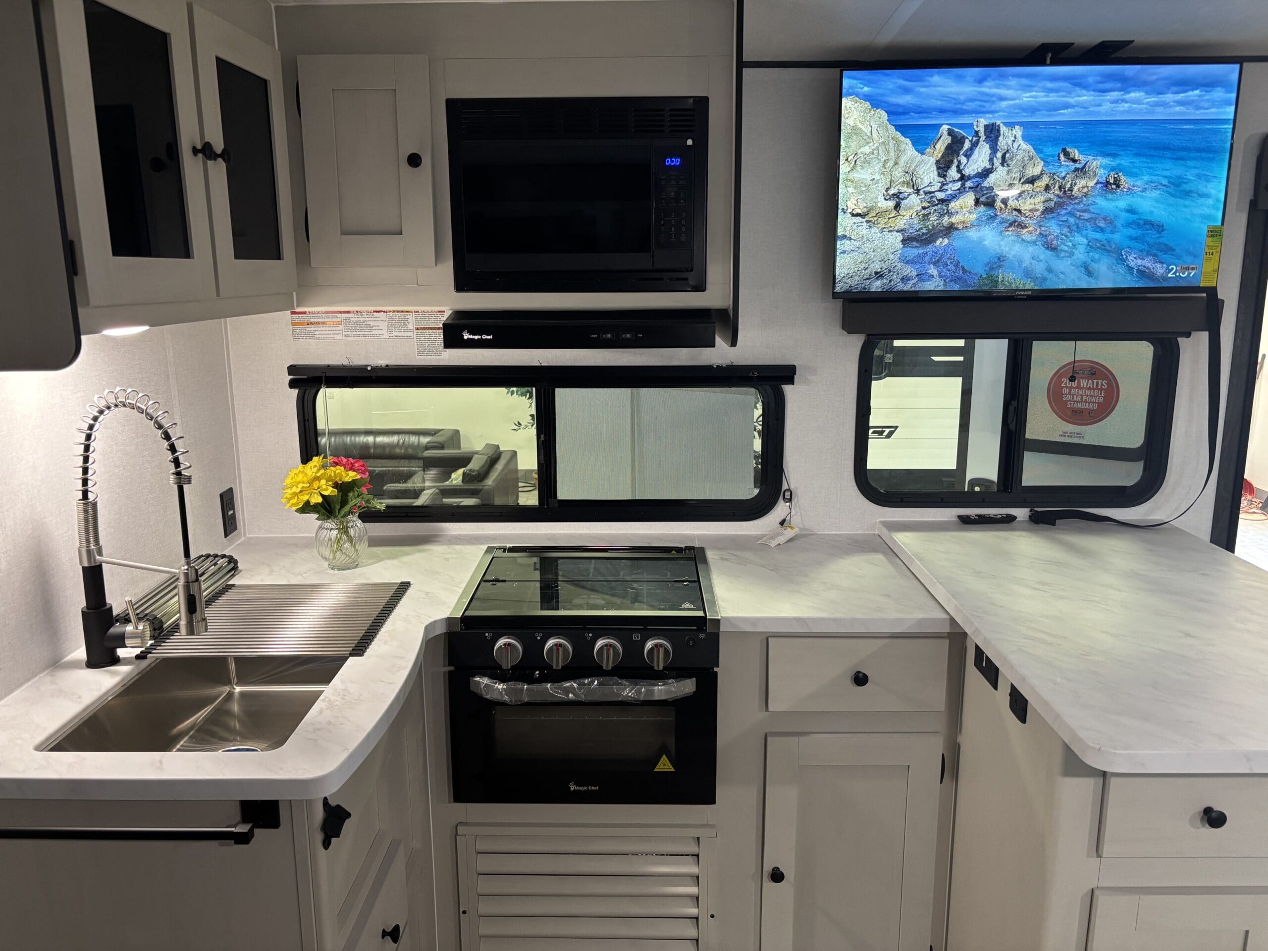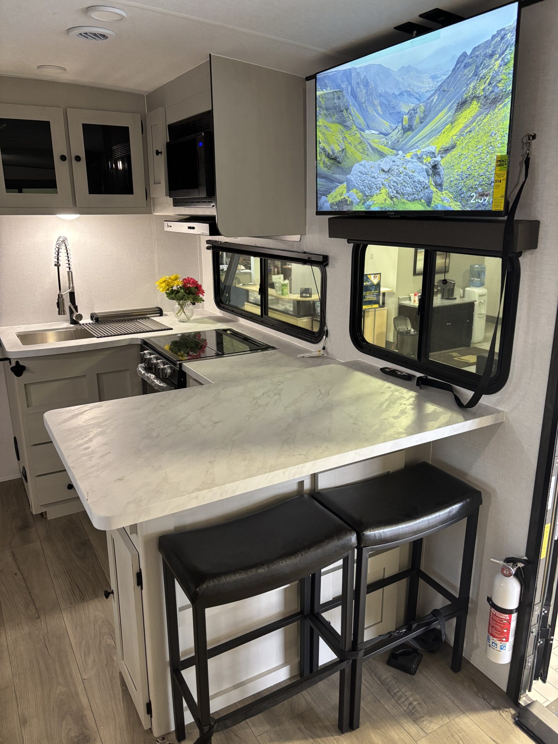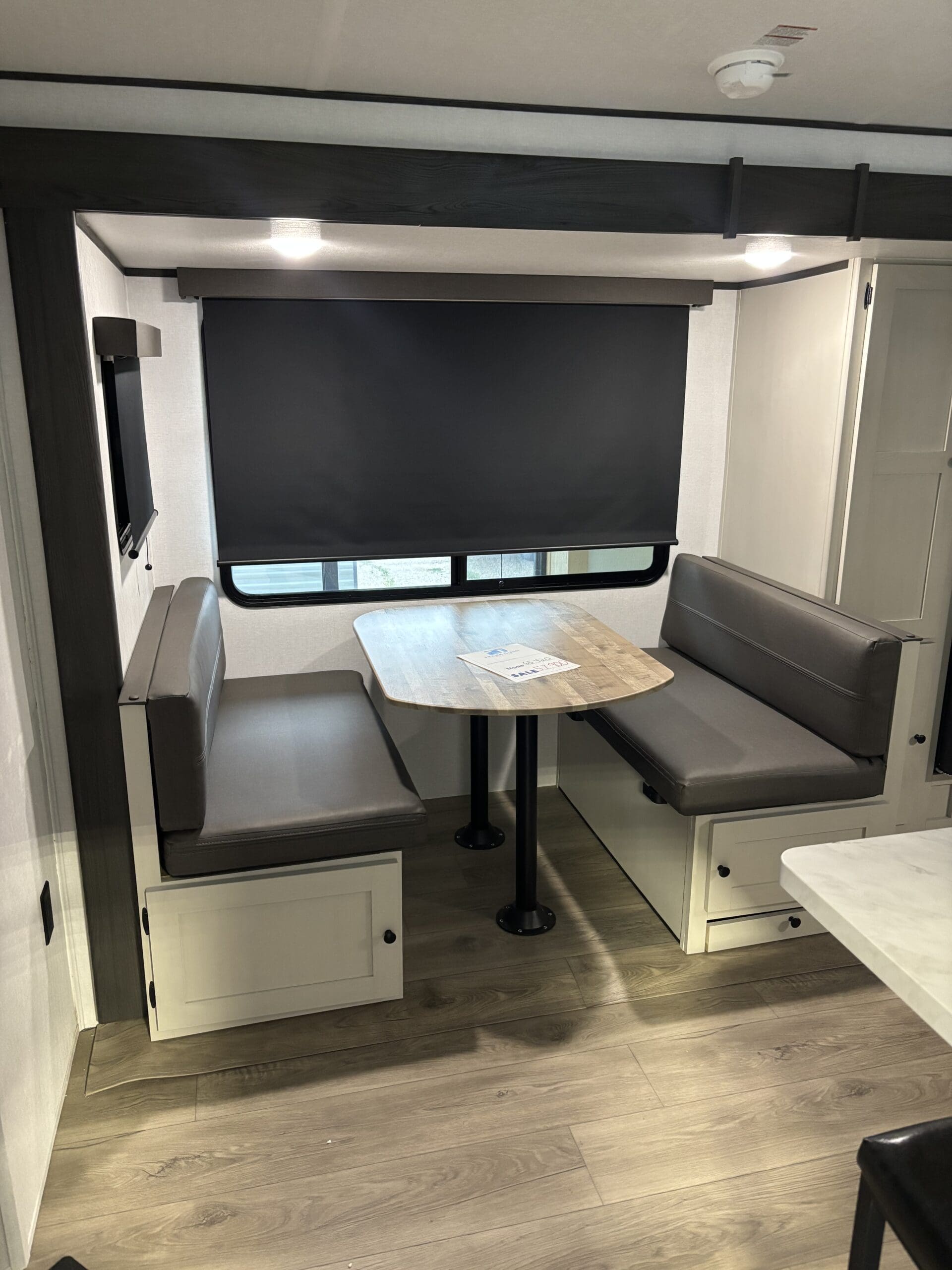 This midsize bunk floorplan is perfect for the family. Coming in under 30 feet overall and just under 6000 lb., the 2457BH features a booth dinette, a breakfast bar with chairs, huge pantry, an abundance of counterspace, double over double bunks, and an outside kitchen. The bottom bunk lifts up to make use of our “Store More” cargo center, which is perfect for bikes, coolers, kayaks, totes, or any other storage items.