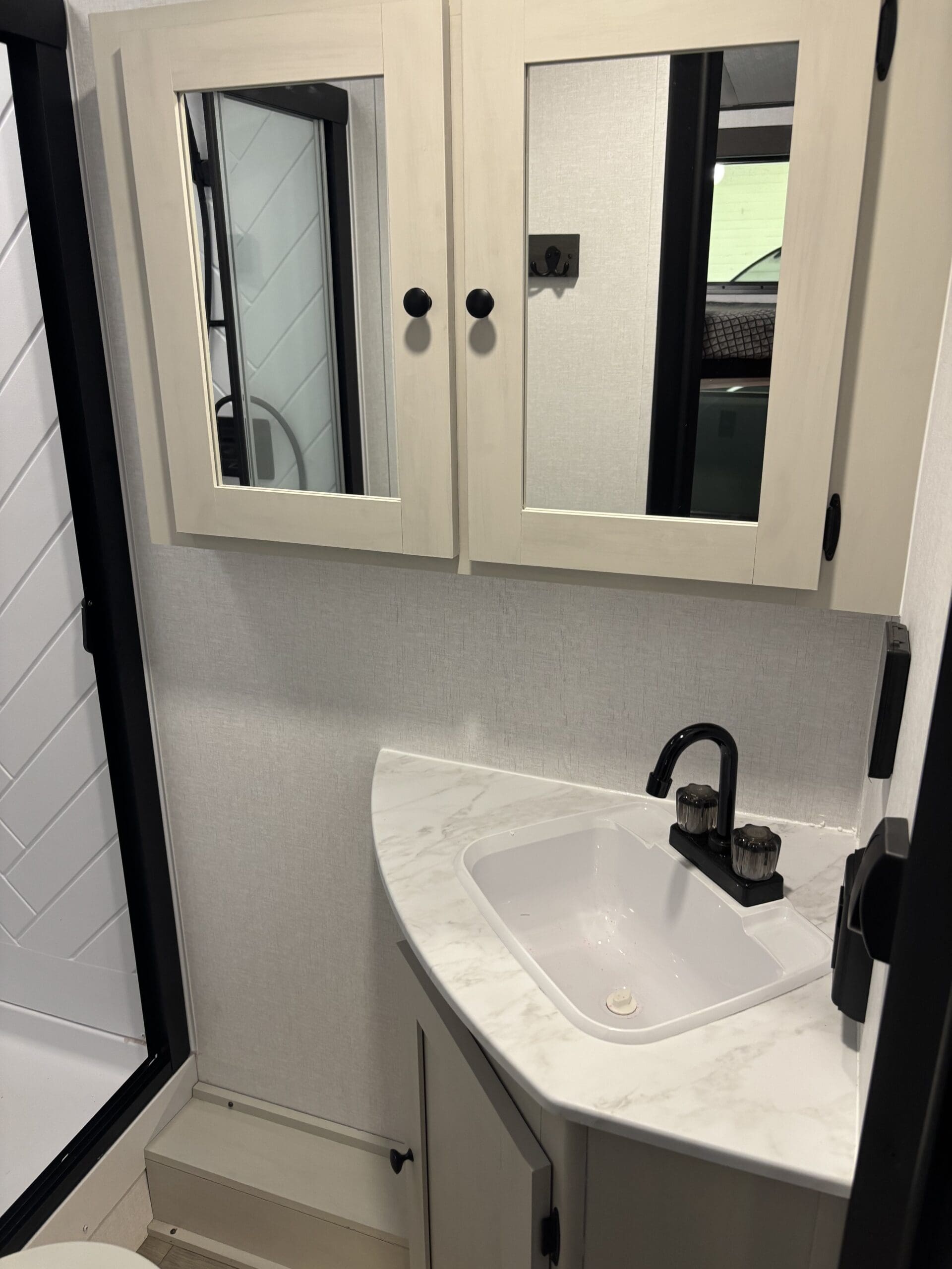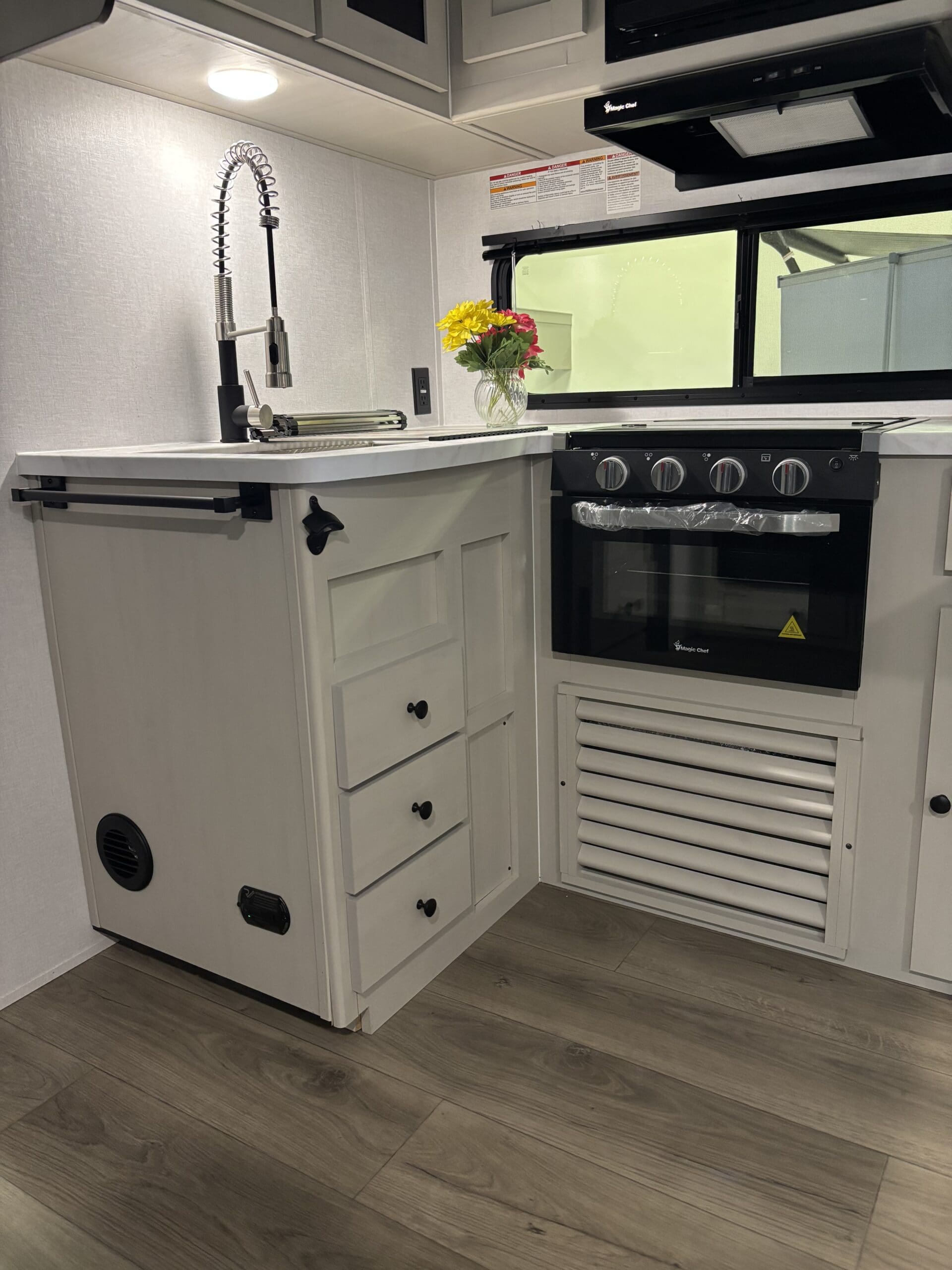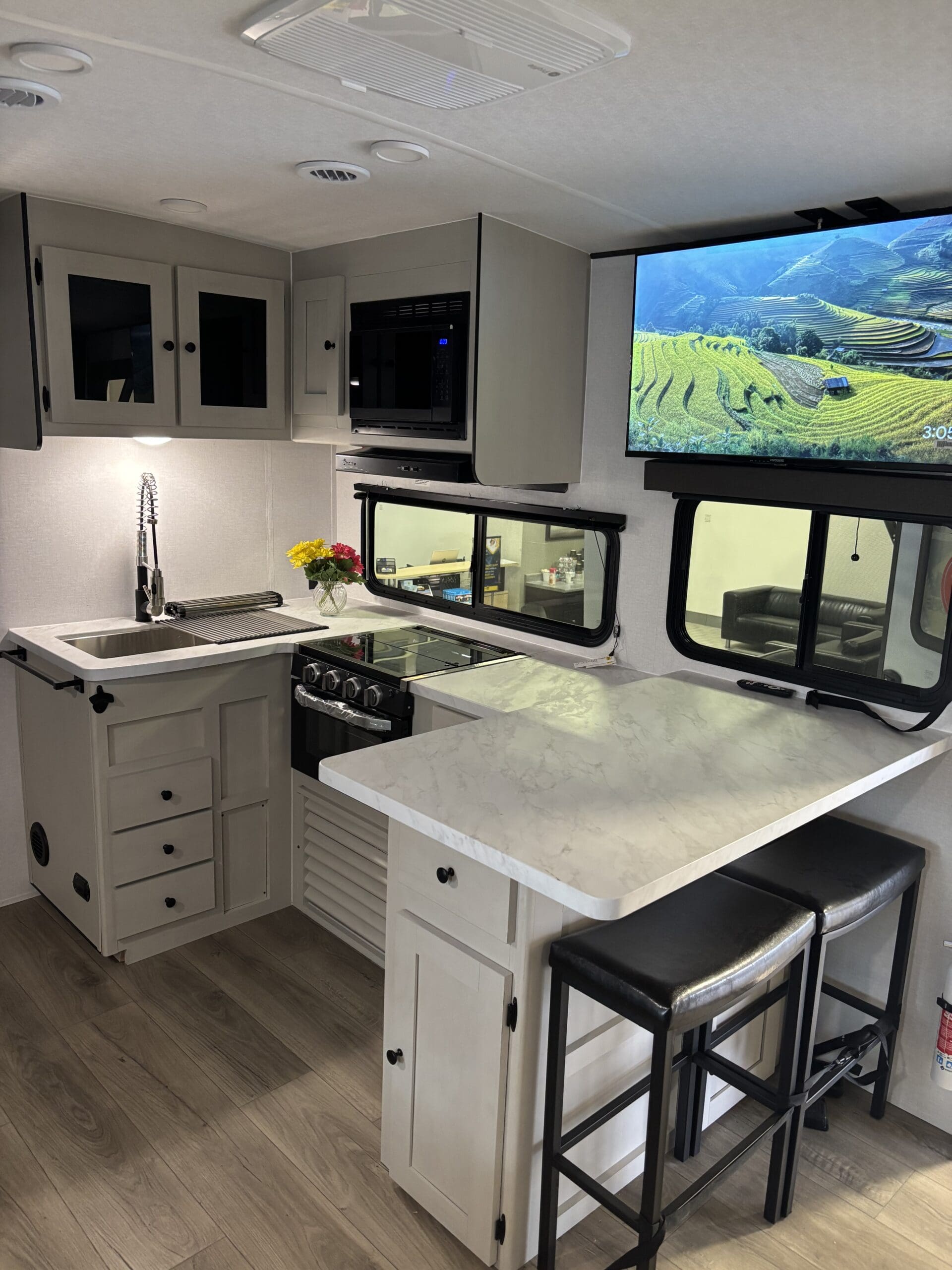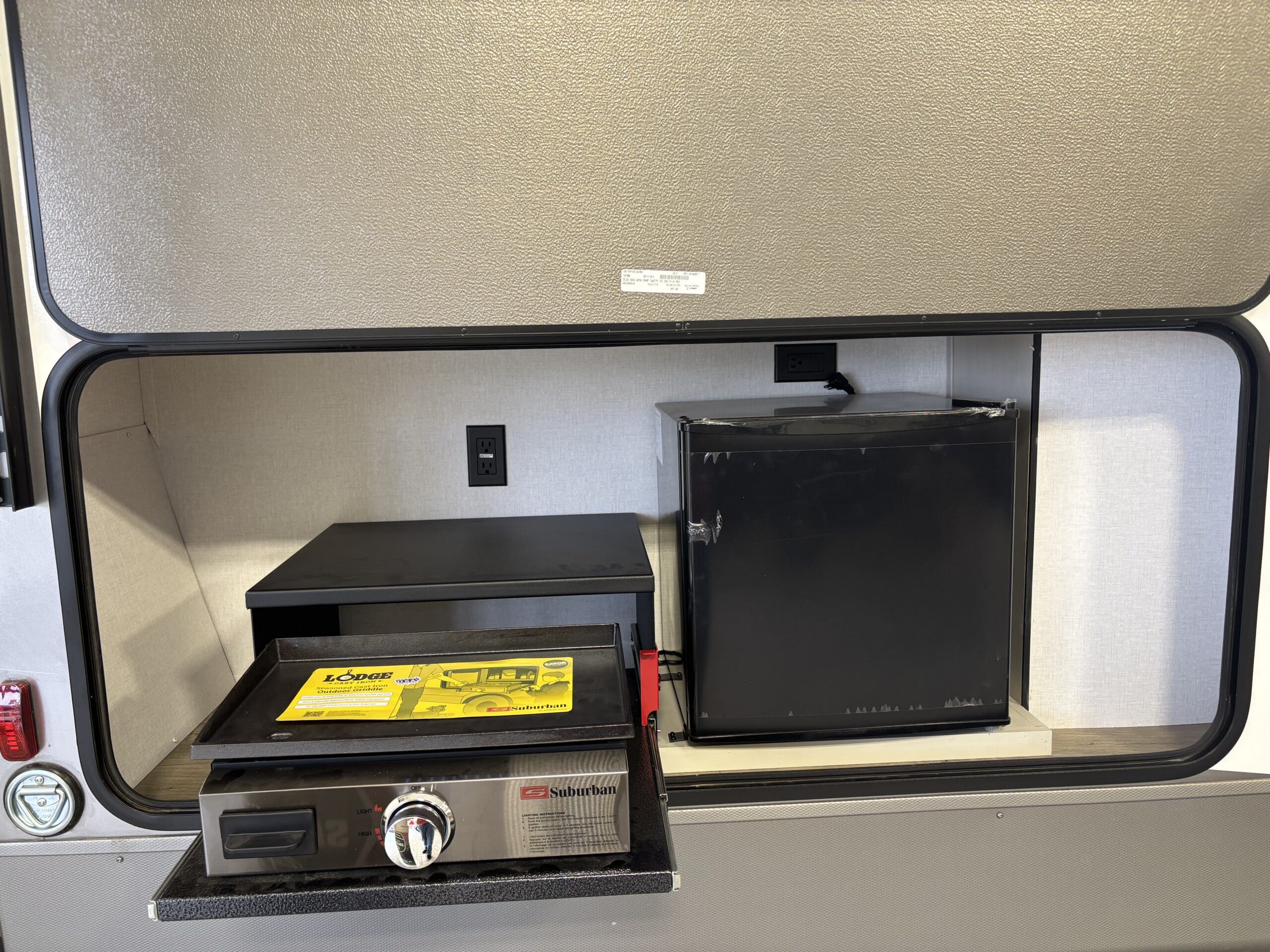 This midsize bunk floorplan is perfect for the family. Coming in under 30 feet overall and just under 6000 lb., the 2457BH features a booth dinette, a breakfast bar with chairs, huge pantry, an abundance of counterspace, double over double bunks, and an outside kitchen. The bottom bunk lifts up to make use of our “Store More” cargo center, which is perfect for bikes, coolers, kayaks, totes, or any other storage items.