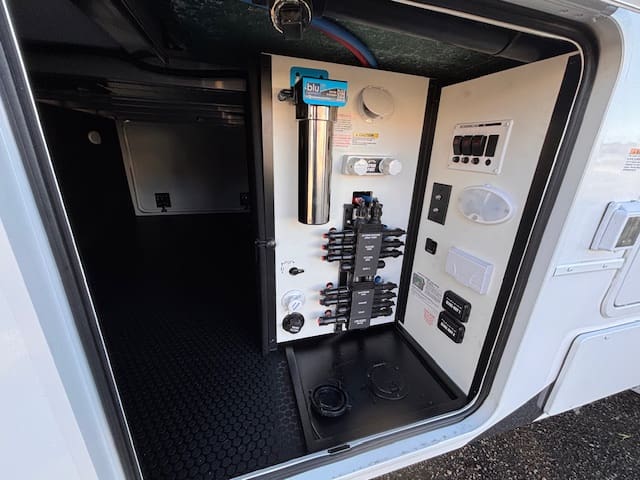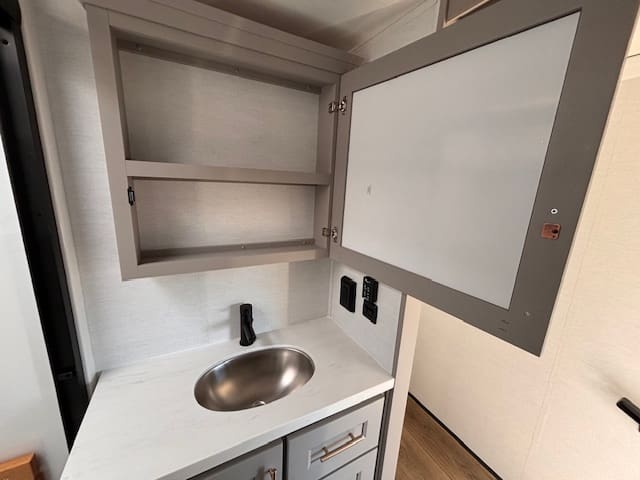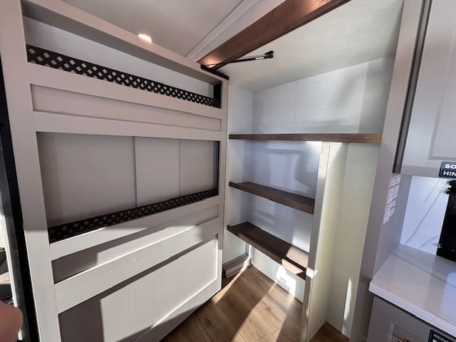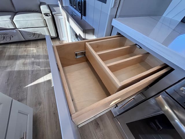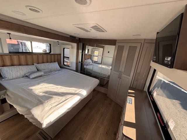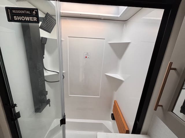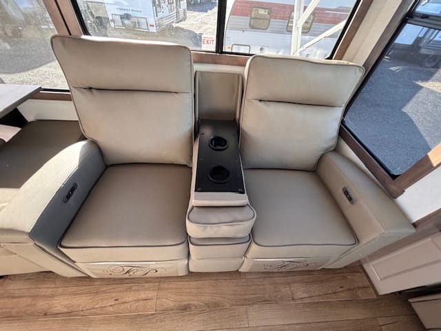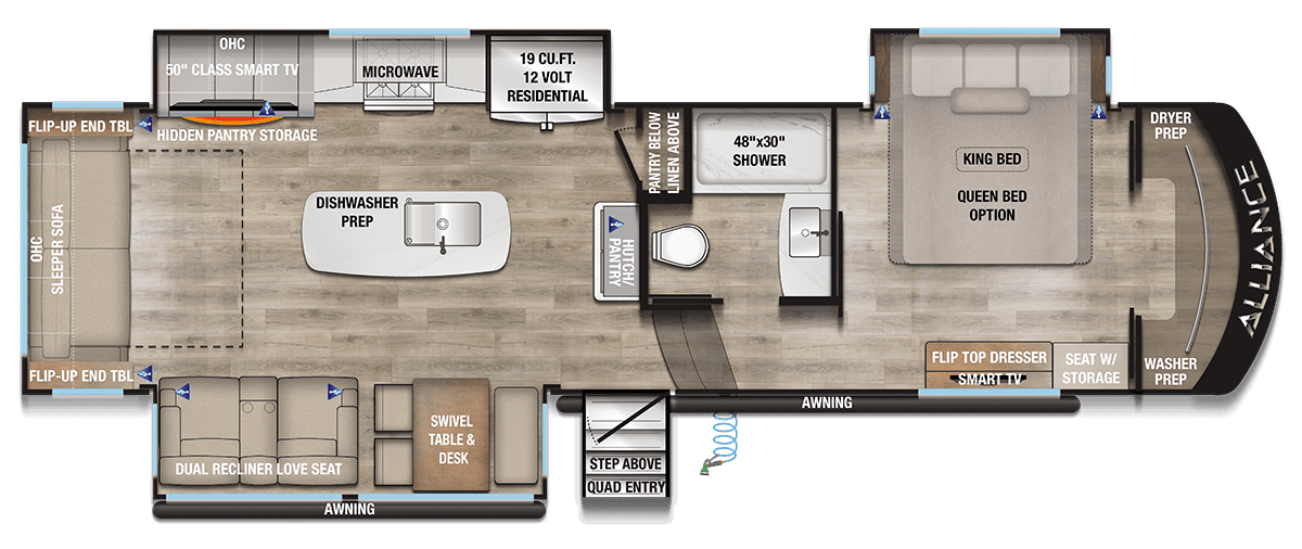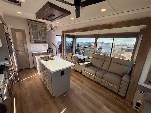 The kitchen impresses with solid surface counter tops, a large island, premium appliances, and generous pantry space — ideal for those who love to cook on the road. Up front, the master suite offers a true retreat with a king bed, full-width wardrobe, and washer/dryer prep for extended stays. The chick sink bathroom and spa-like shower complete the upscale experience.