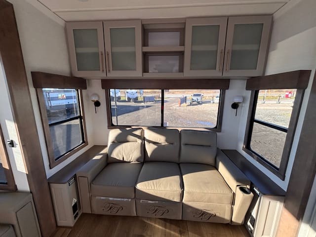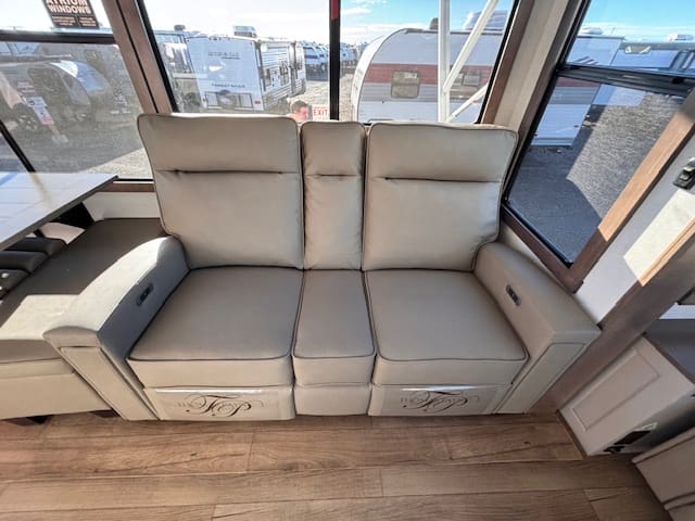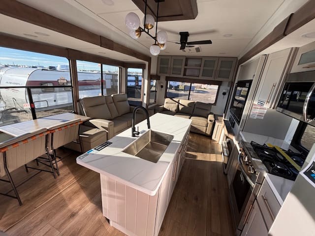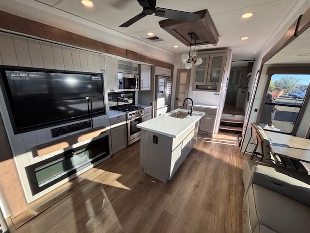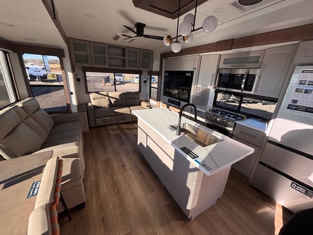 The 2026 Paradigm 310RL takes fifth wheel luxury to the next level, designed for those who believe comfort and adventure should go hand in hand. From the moment you step inside, you’ll notice the residential feel — rich decor, modern lighting, and high-end finishes that make every trip feel like home. The rear living layout is perfect for relaxing or entertaining, featuring power recliners, a spacious sofa, and a large smart TV with an electric fireplace to set the mood.