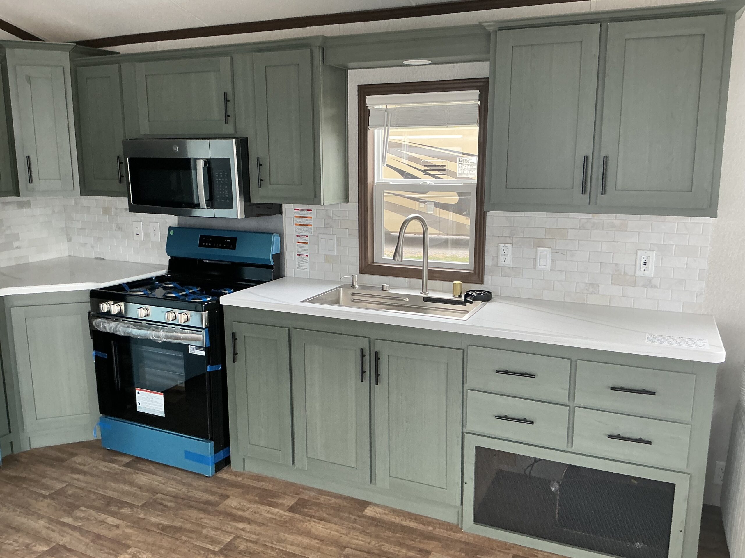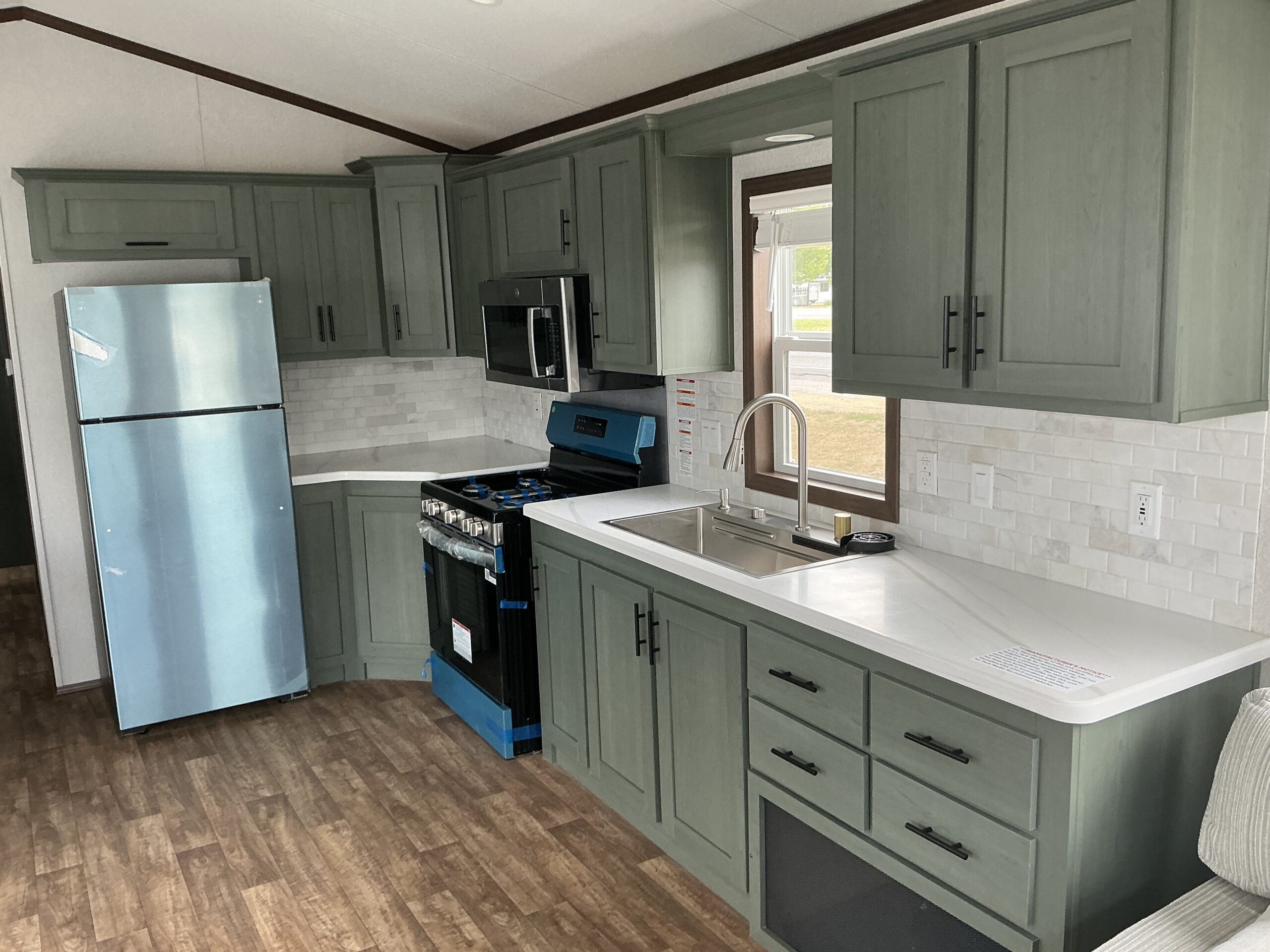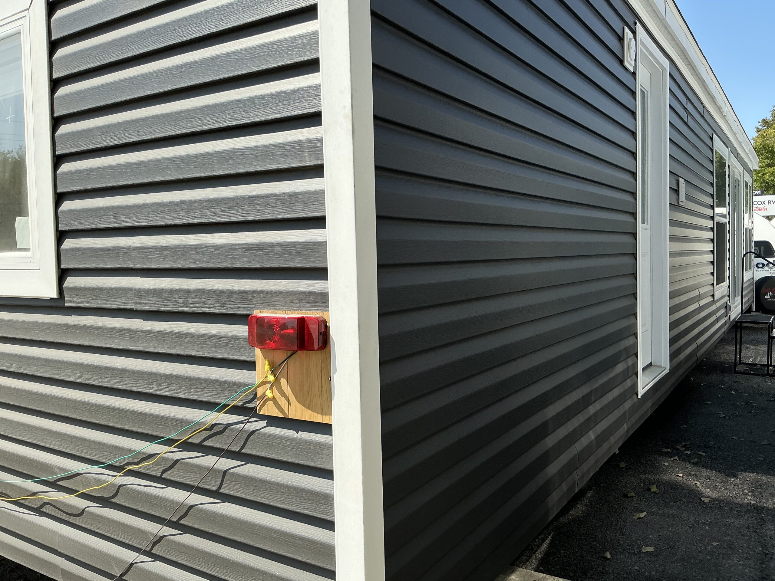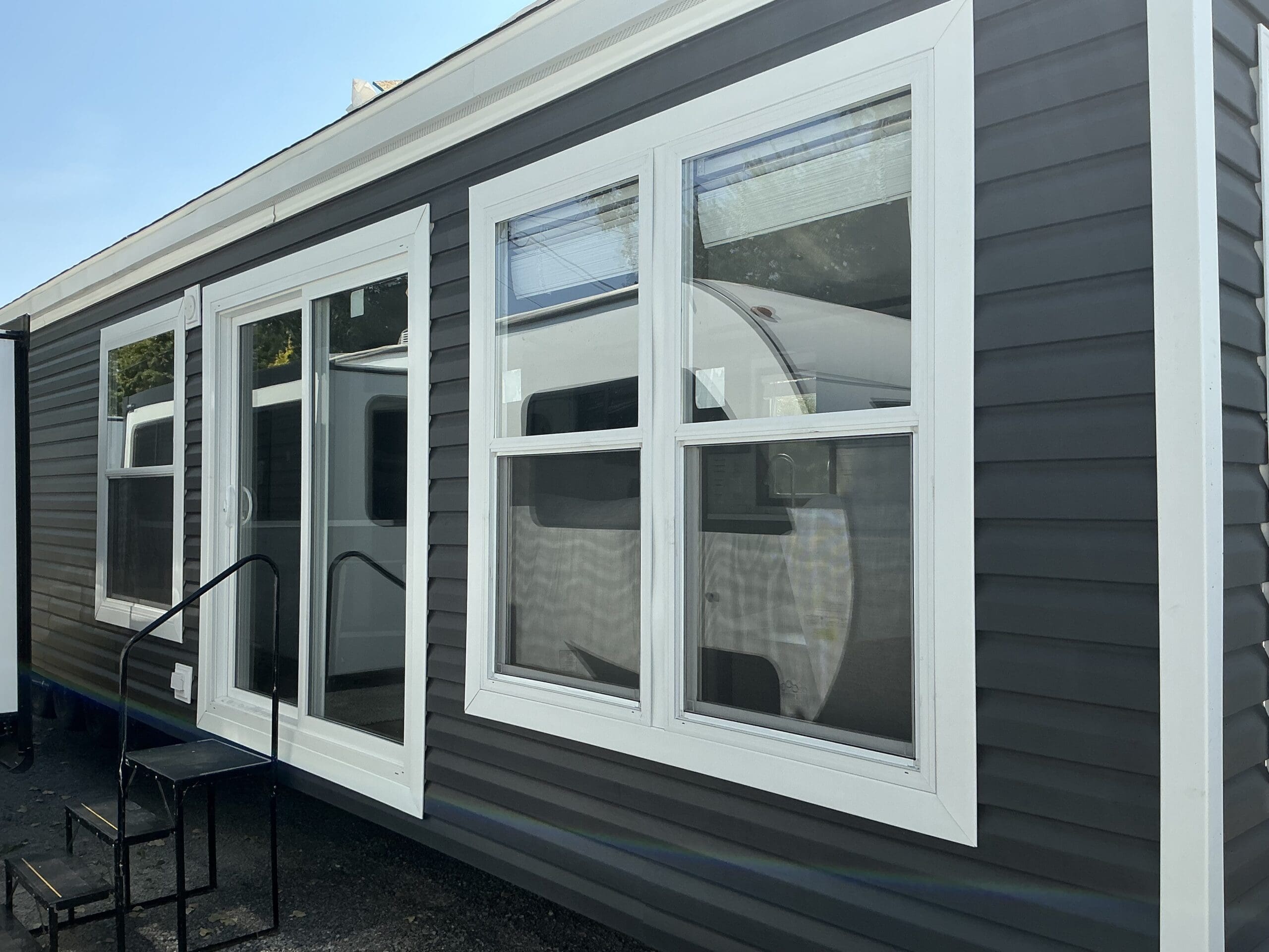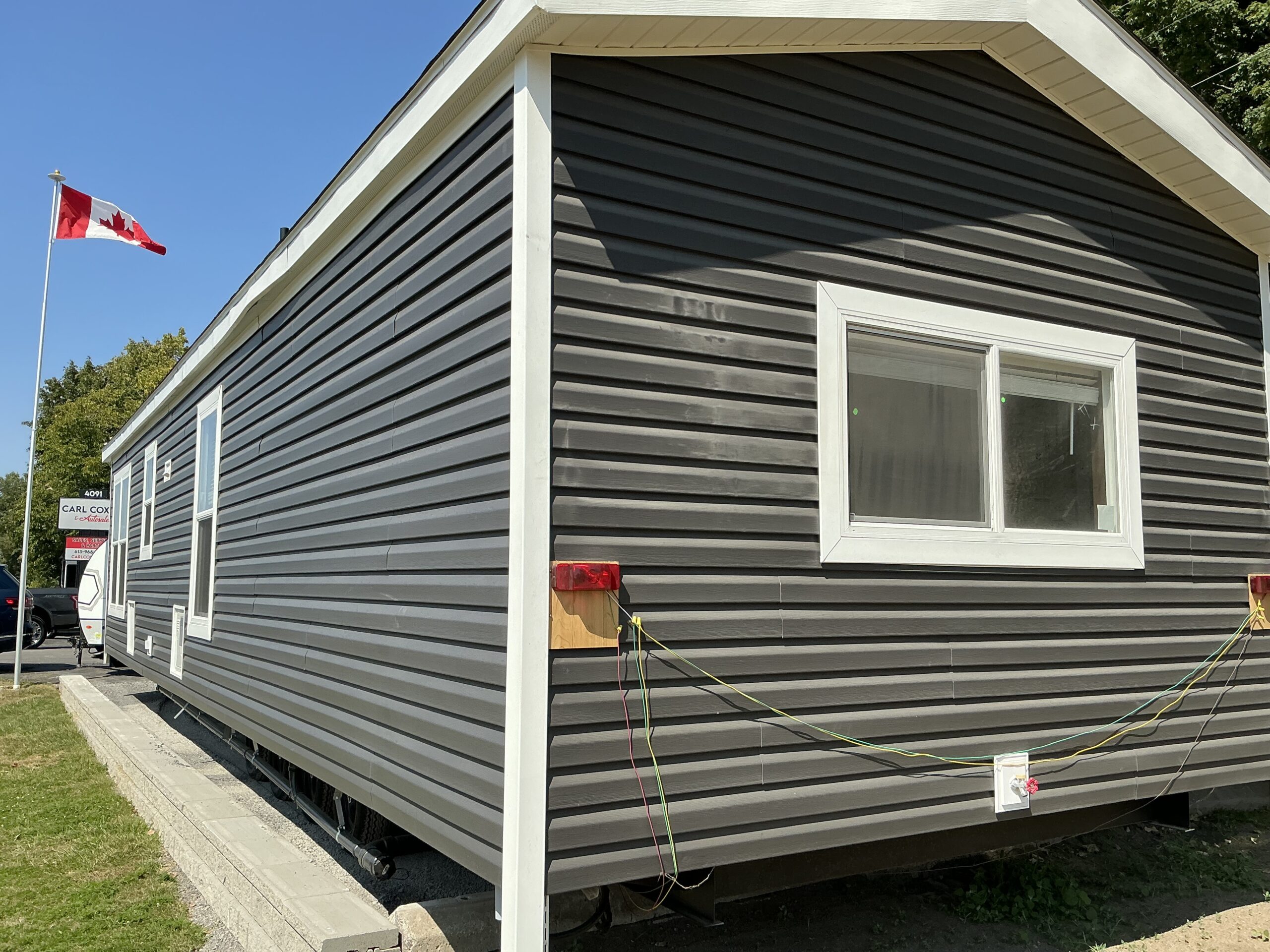 This unit comes with welded I-beam chassis, corrosion resistant metal underbelly, 2X6 transverse floor joists, T&G floor decking, R-22 floor and roof insulation, OSB exterior wall sheathing, with weather wrap, Thermopane windows, residential vinyl siding, exterior Lineals, residential rear door, 16” on centred roof rafters,, fixed overhanging, perimeter ice and storm shield, 30 yr architectural shingles, white shutters, trapezoid windows.