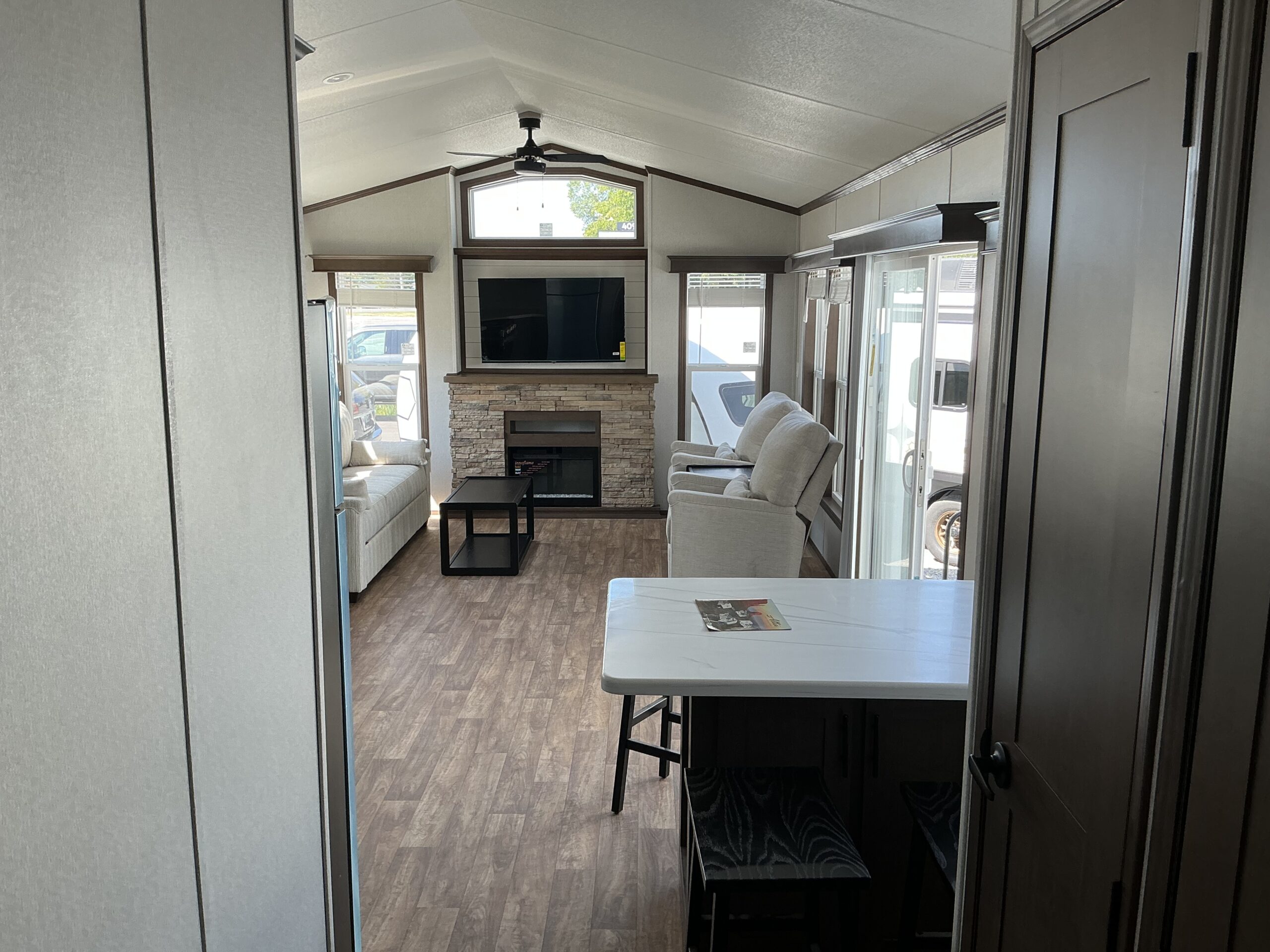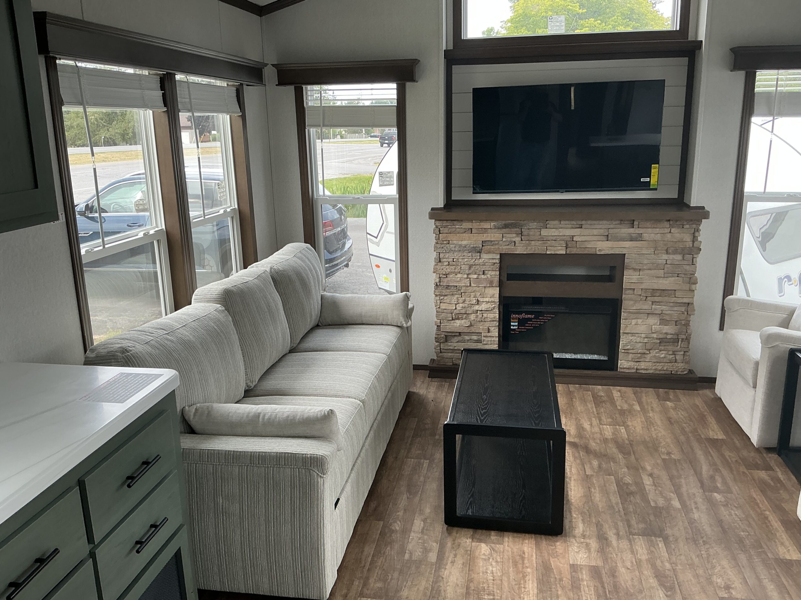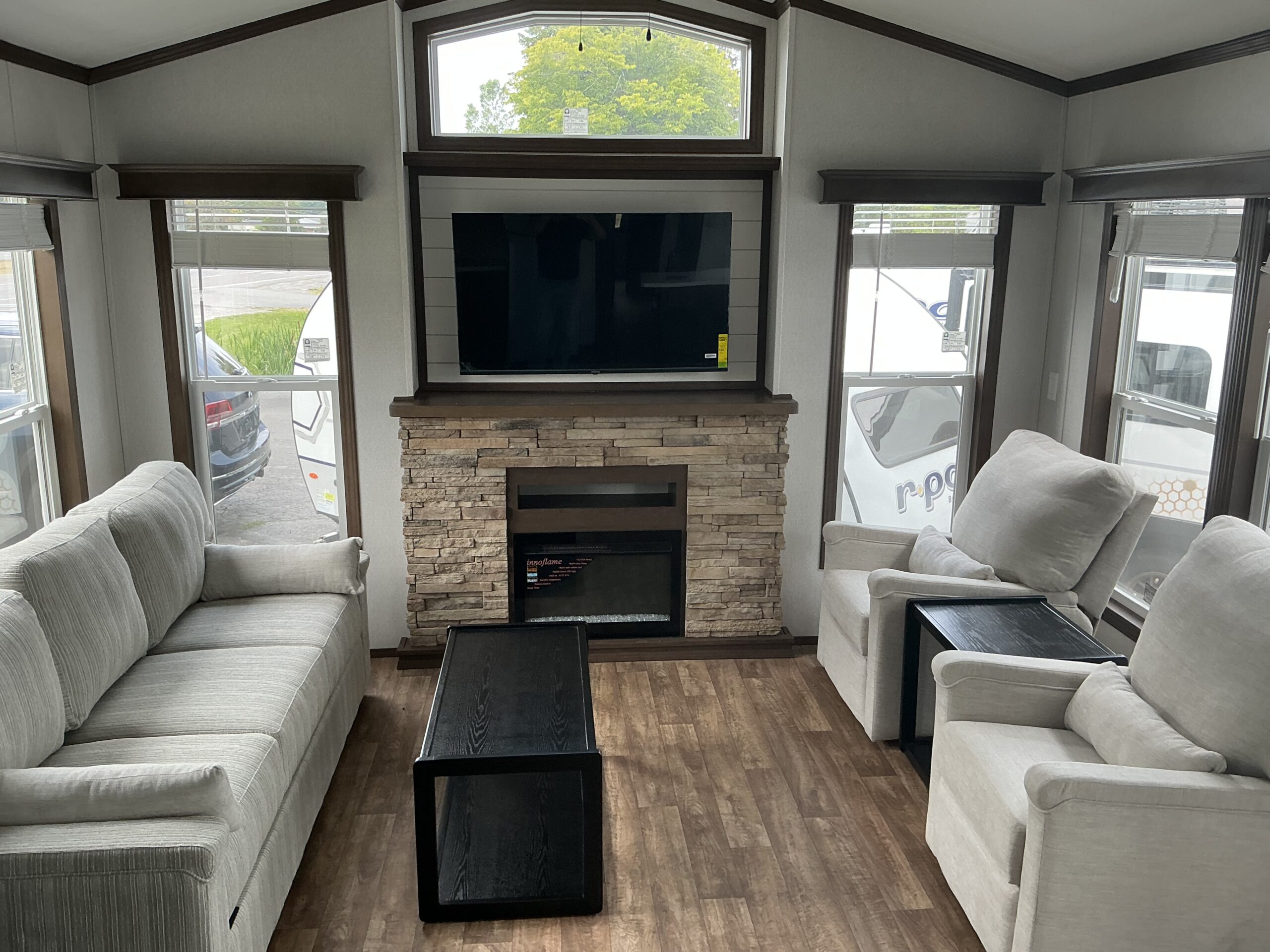 Beautiful living room, with large triple pull out bed, 2 comfortable chairs, end table, coffee table, cathedral ceiling with ceiling fan, large end wall entertainment centre with fireplace, accented with above window and this room os enhanced with large windows and sliding door.
