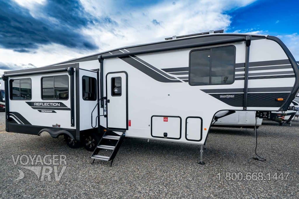 The New 2026 Grand Design Reflection 150 295RL, measuring approximately 32′ 9in in length, a no bunks floorplan, sleeping up to 4 people, queen bed, equipped with 2 slide-outs, and a face to face dining area.