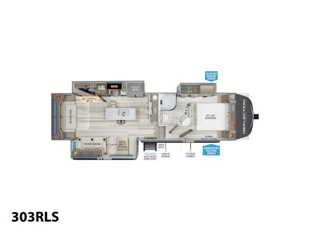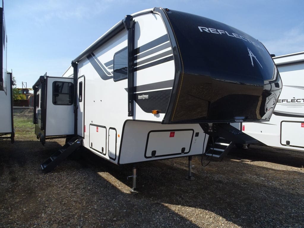 2026 Grand Design Reflection FW 303RLSSlow down in no time flat.The Grand Design Reflection combines luxury, value, and towability in one amazing — best-in-class — package. The quality and service you have come to expect from Grand Design have made the Reflection a tried, true and trusted name in North America.Features may include:Exterior80% Tint Radius Safety Glass WindowsExtended Pin Box30 lbs LP Bottles (2)30" Radius Entry DoorOutside ShowerFactory Installed Roof LadderStep-Above with Lift-Assist Entry StepsLP Quick Connect6' Coiled Break Away CableUnobstructed Pass Thru Storage"One Touch" Electric LED AwningInteriorResidential Hardwood Cabinet DoorsSolid Hardwood Drawer FrontsLouvered Tread Steps to BedroomSolid Core Cabinet StilesPre-drilled and Screwed CabinetryBall Bearing Full Extension Drawer GlidesTri-Fold Hide-A-Bed Sofa (Model Specific)Large Panoramic Slide Room WindowsPremium Congoleum FlooringDuctless Flooring Throughout Living AreaResidential Style Window TreatmentsBlackout Roller Shade Window CoveringTheater SeatsResidential Booth DinetteSolid Surface Countertops & Sink Covers Features Include 3 Slides Ducted A/C 2 Power Awnings On Demand Water Heater 16 Cu. Ft. Refrigerator Arctic Package Mor-Ryde Suspension Power Leveling Jacks 16" Aluminum Wheels Microwave Home Theatre LED TV Fantastic Fan LED Lighting Roller Shades Solid-Surface Counter Tops Free Standing Dinette Theatre Seating Trifold Sofa Fireplace Solar Panel Weight 10,066 Lbs