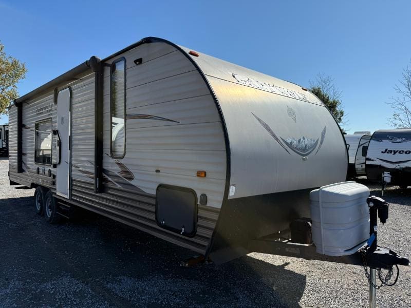 Cherokee Grey Wolf 26RR 2016 une roulotte compacte et confortable idéale pour les escapades à deux. Elle dispose d’un lit queen d’un réfrigérateur au gaz et d’un air climatisé 13 500 BTU offrant praticité et confort pour toutes vos aventures.