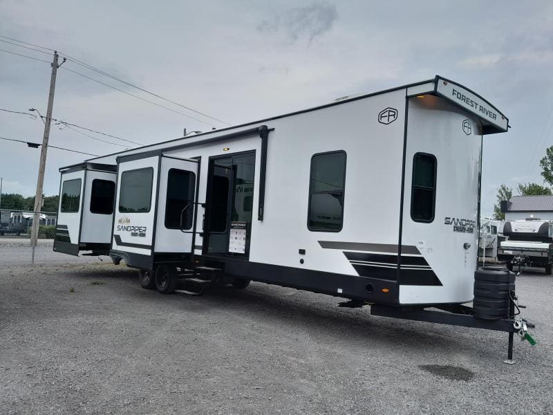 Découvrez le Sandpiper 403RD une caravane équipée d’un foyer îlot central air climatisé 15 000 BTU réfrigérateur 12 volts et tables et chaises. Profitez également d’un sofa lit fauteuils style théâtre et lit king pour des escapades tout confort.