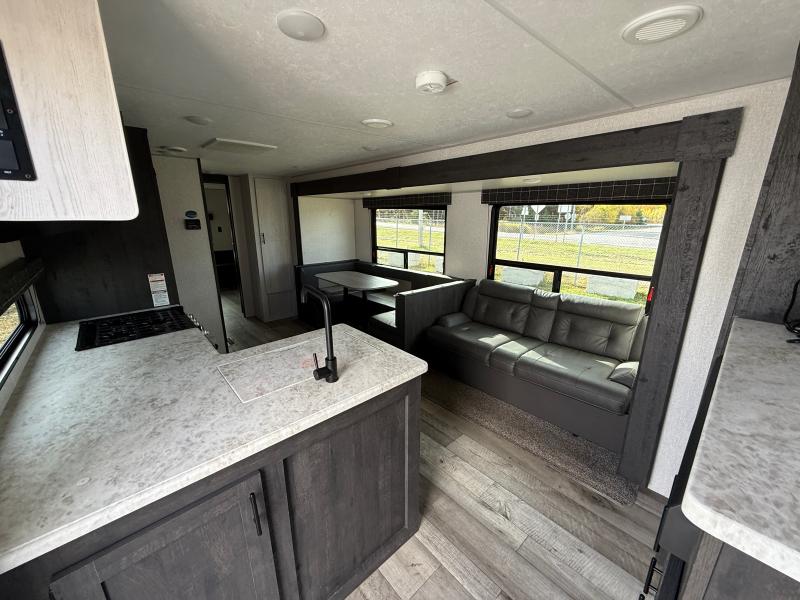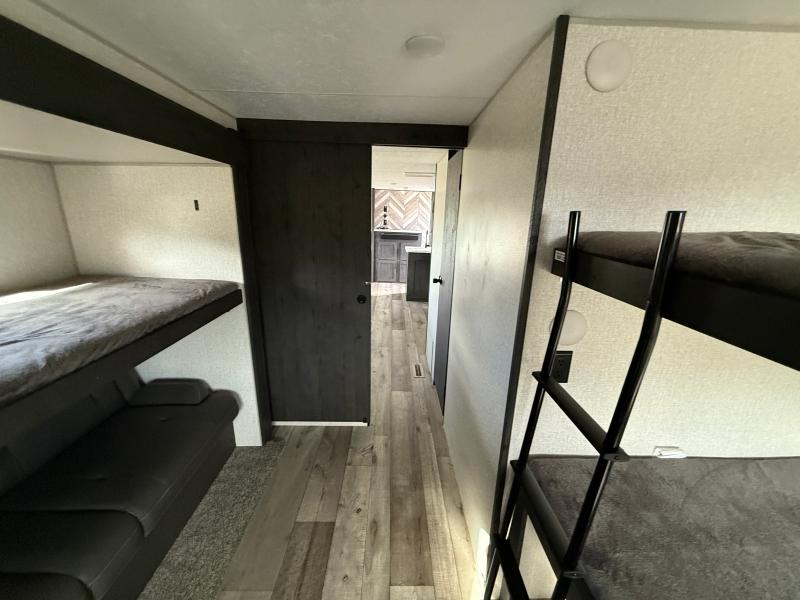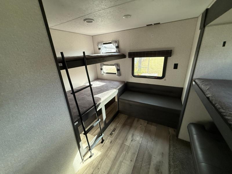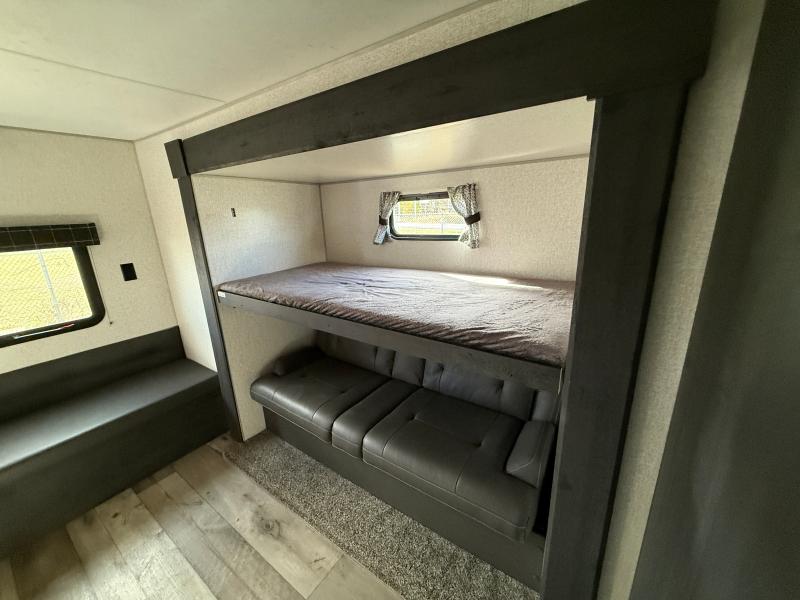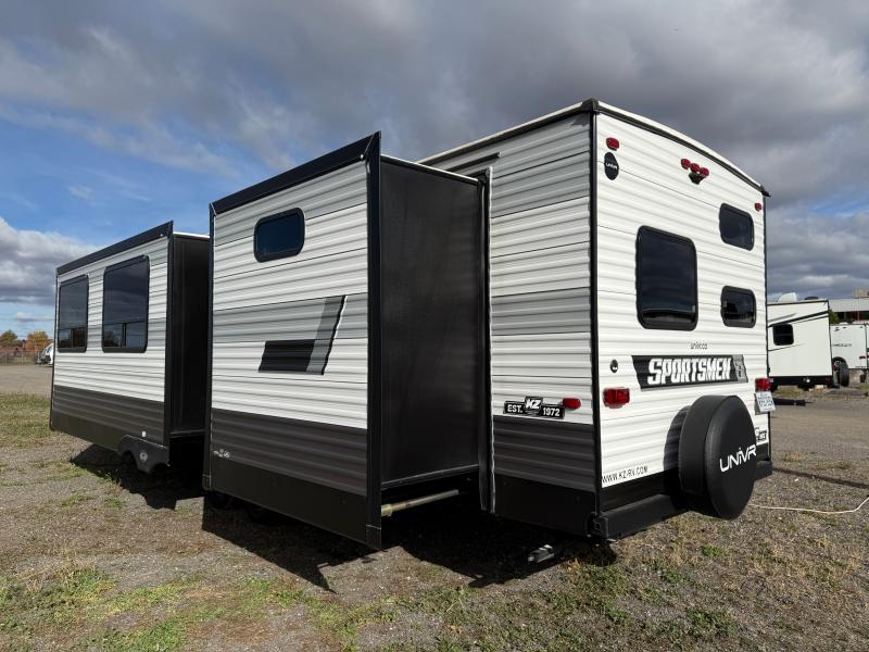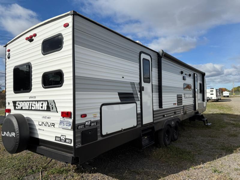 KZ Sportsmen 332BHKSE 2022 – Roulotte familiale spacieuse avec foyer cuisinette extérieure lit queen chambre enfant fermée lits superposés et banquette en U parfaite pour le confort de tous.