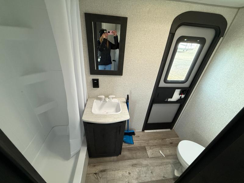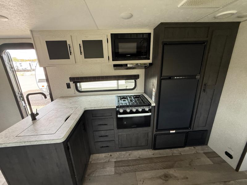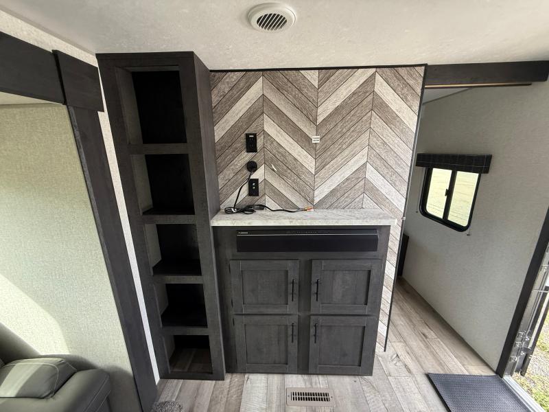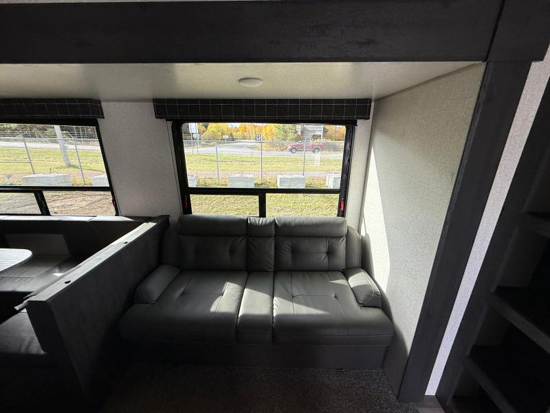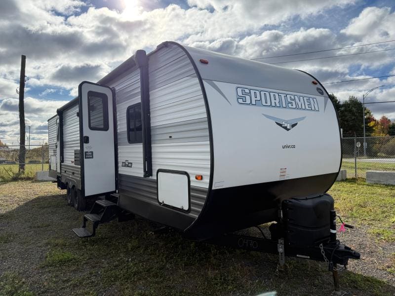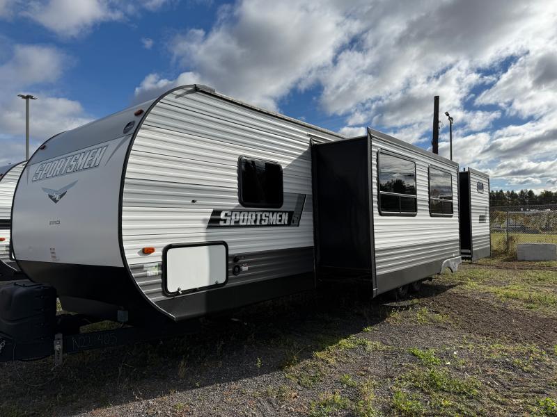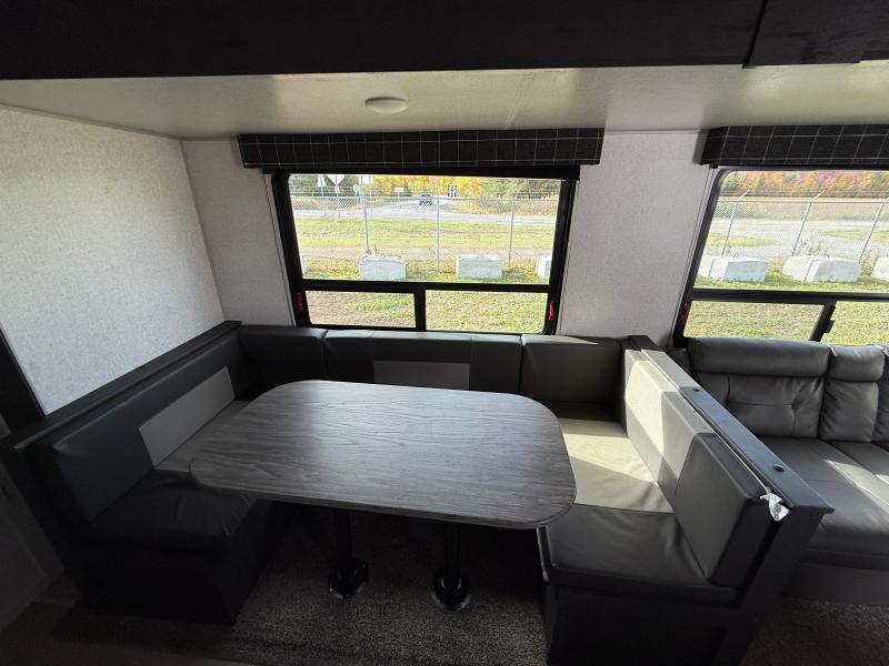 KZ Sportsmen 332BHKSE 2022 – Roulotte familiale spacieuse avec foyer cuisinette extérieure lit queen chambre enfant fermée lits superposés et banquette en U parfaite pour le confort de tous.