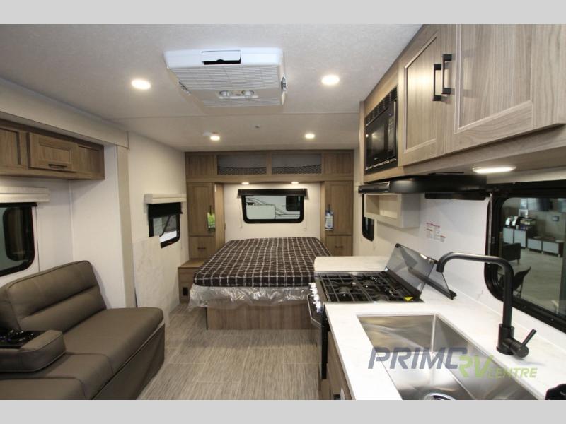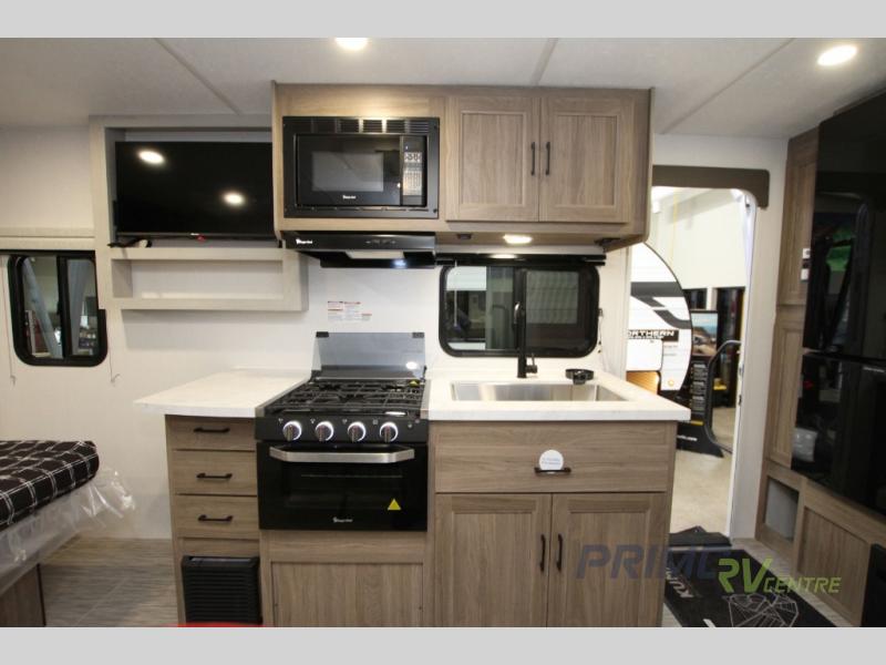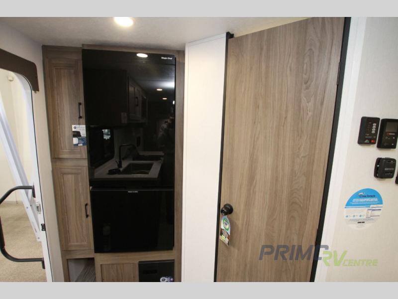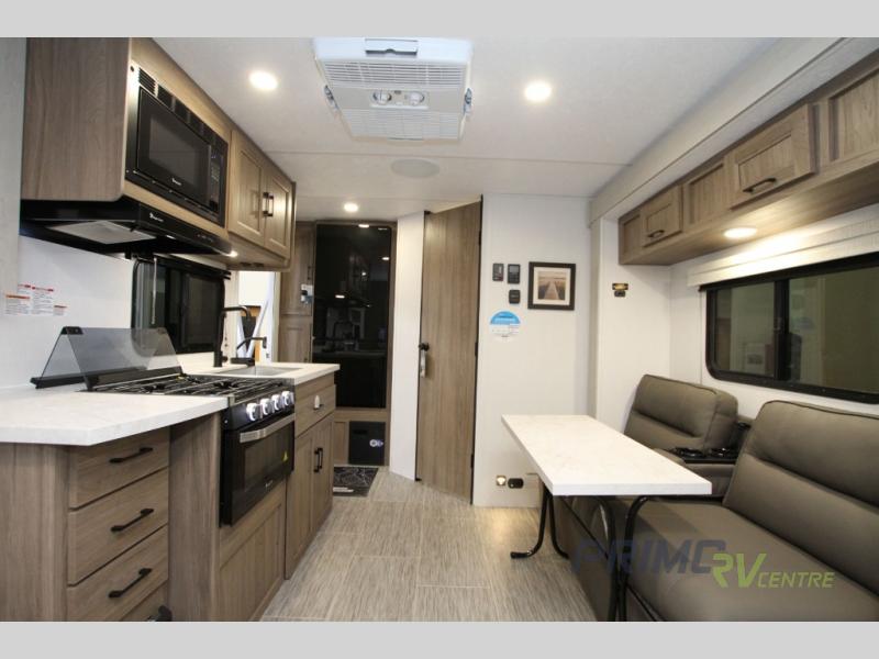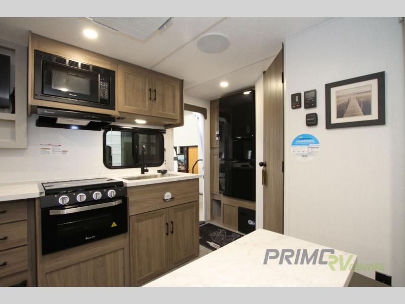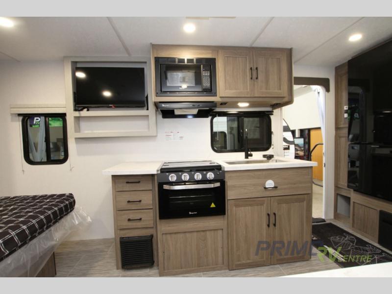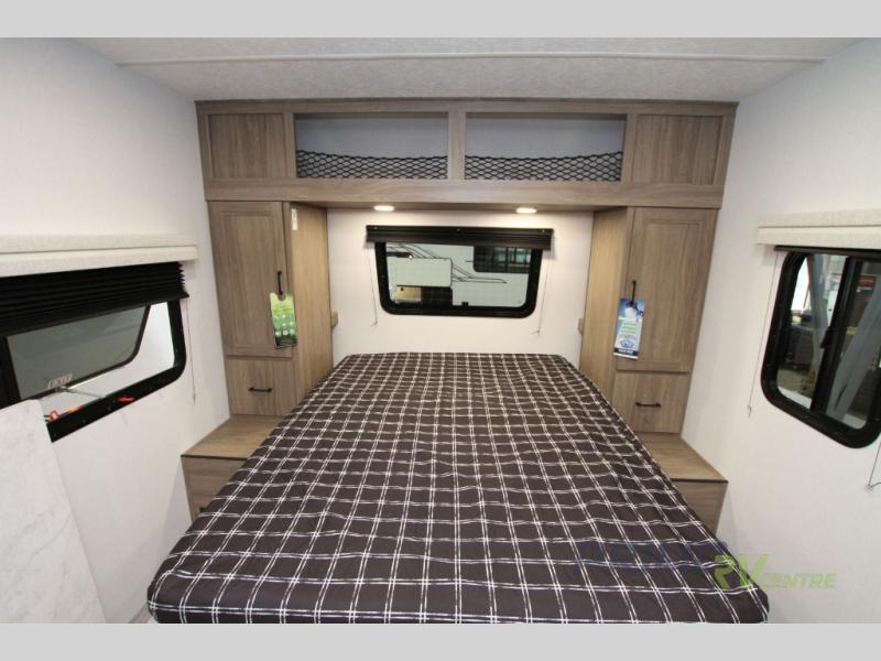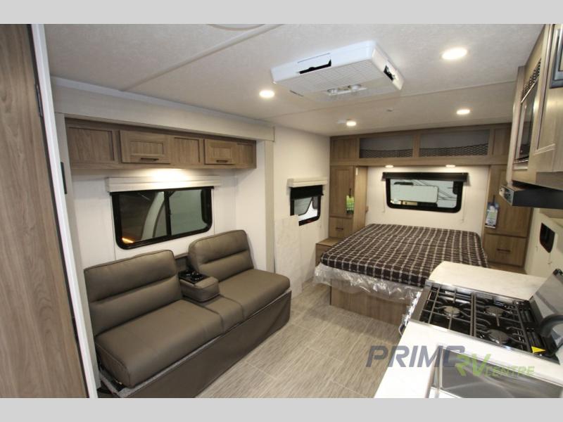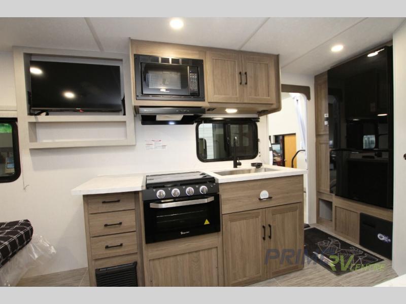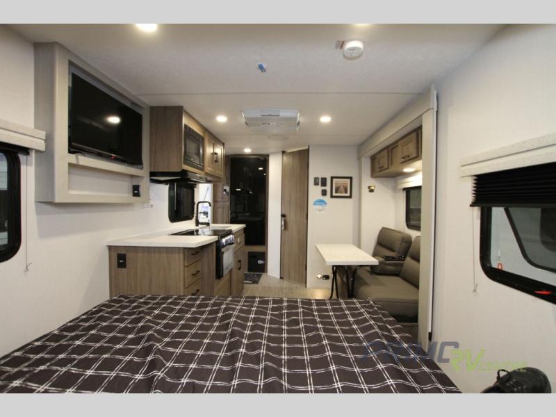 You’ll love spending time at the campground in this single slide out travel trailer! The 60″ x 80″ front queen bed includes vaulted underbed storage to keep your luggage or extra blankets out of the way, plus there are dual bedside wardrobes for your clothes. A sofa with a free-standing table will provide a place to relax and dine, and the full kitchen includes a dual-burner cooktop and microwave to cook meals each day. This unit also features a rear corner bath with a 32″ radius shower, a toilet, sink, and bath linen closet for clean towels!