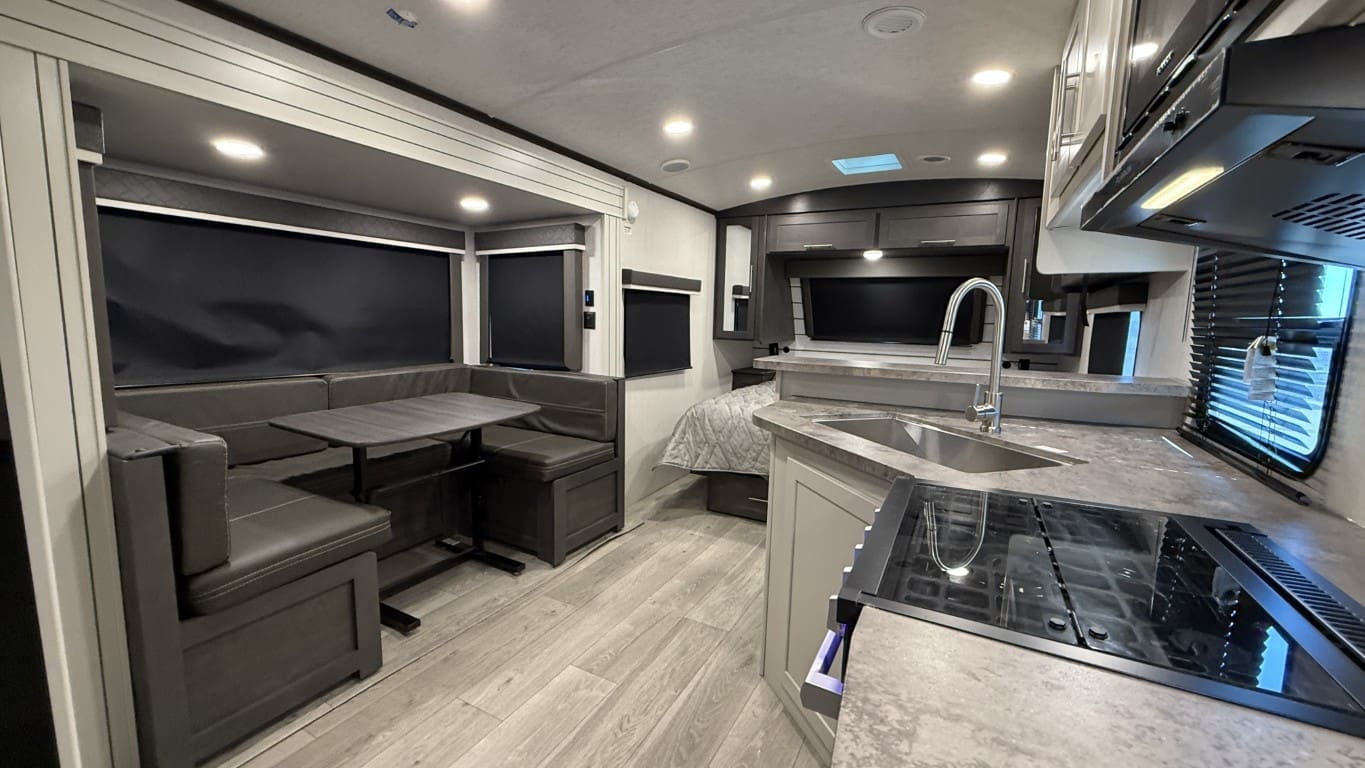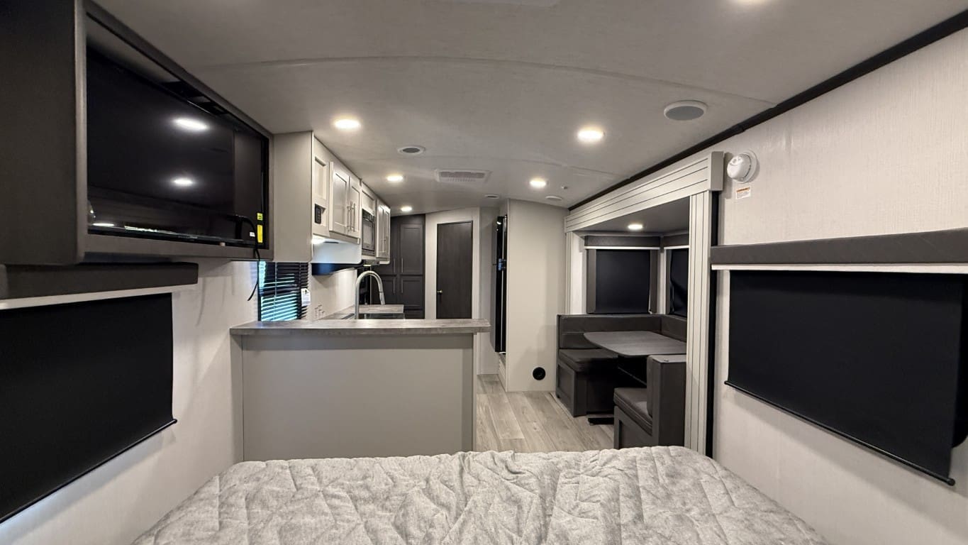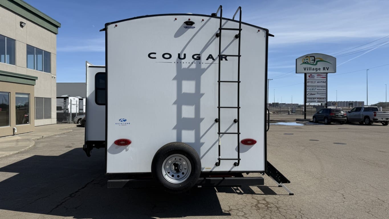 This half-ton towable travel trailer features a spacious rear bathroom, a private front bedroom with a king-size bed, and a large slide-out with a U-shaped dinette for extra living space. Built with Cougar’s premium construction and modern amenities, this model is ready for your next adventure.