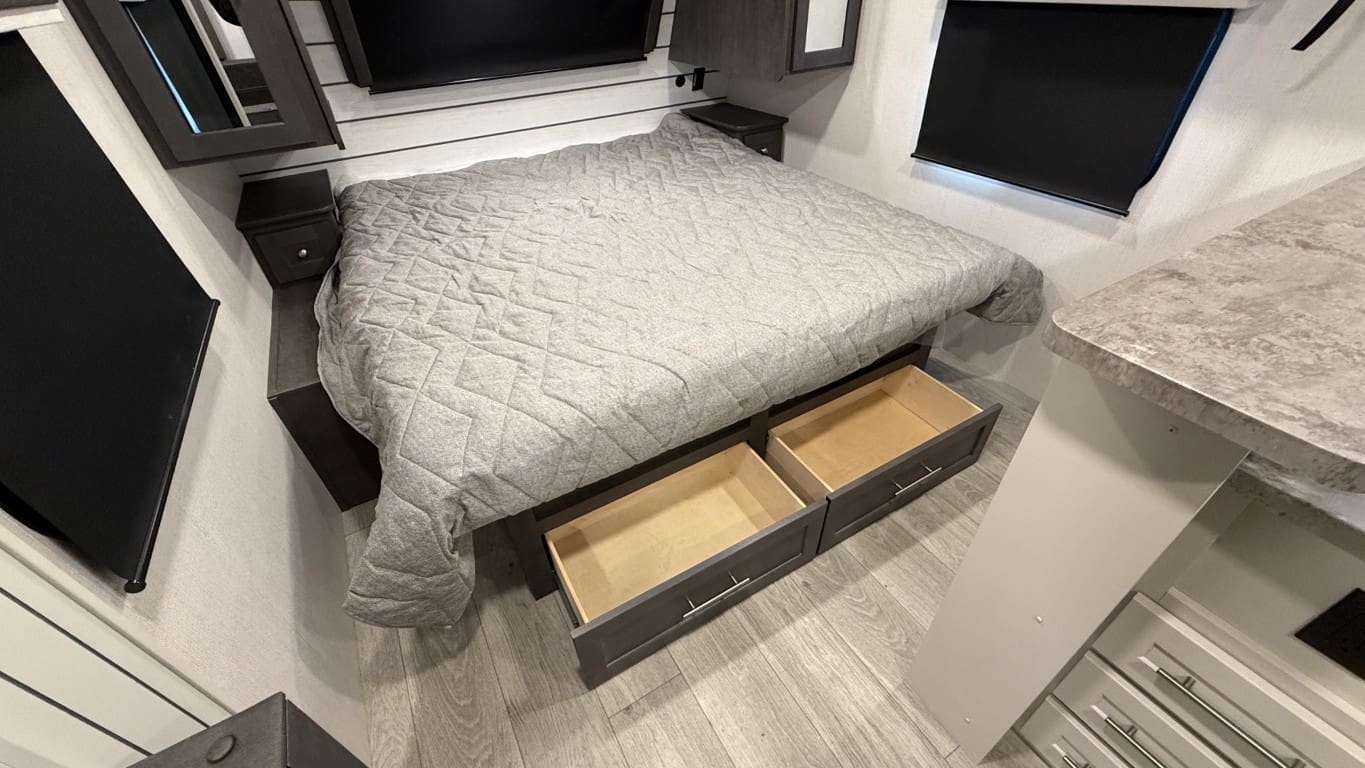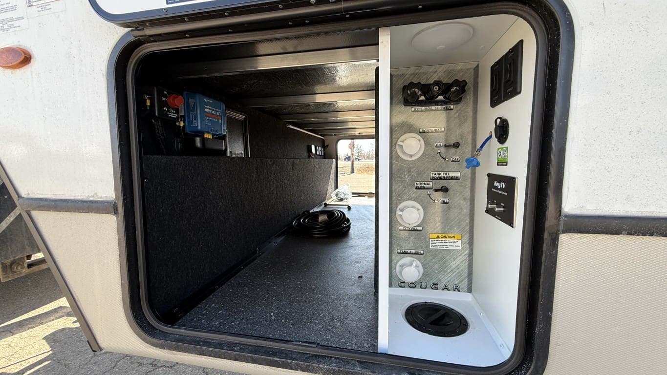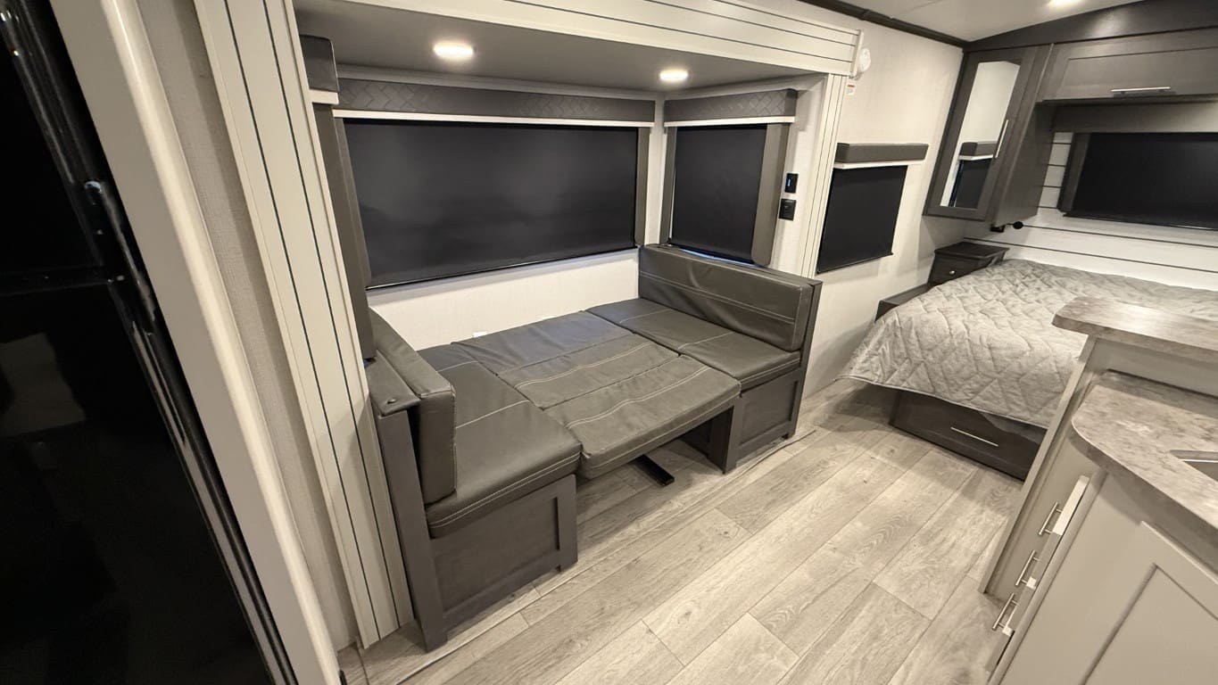 This half-ton towable travel trailer features a spacious rear bathroom, a private front bedroom with a king-size bed, and a large slide-out with a U-shaped dinette for extra living space. Built with Cougar’s premium construction and modern amenities, this model is ready for your next adventure.
