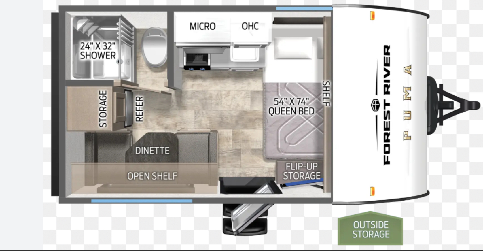 This is the puma 123RDCE. With a length of 16’ and a weight of 2684lbs This is the perfect trailer for anyone looking to tow with a small SUV or van.