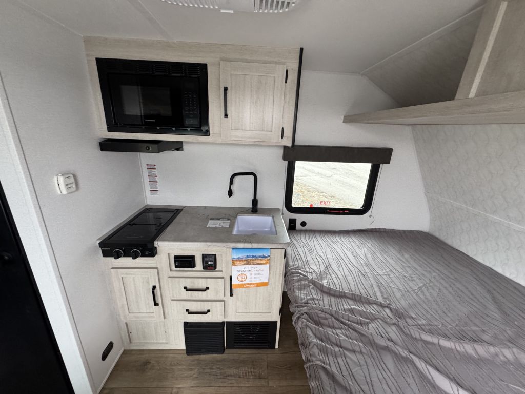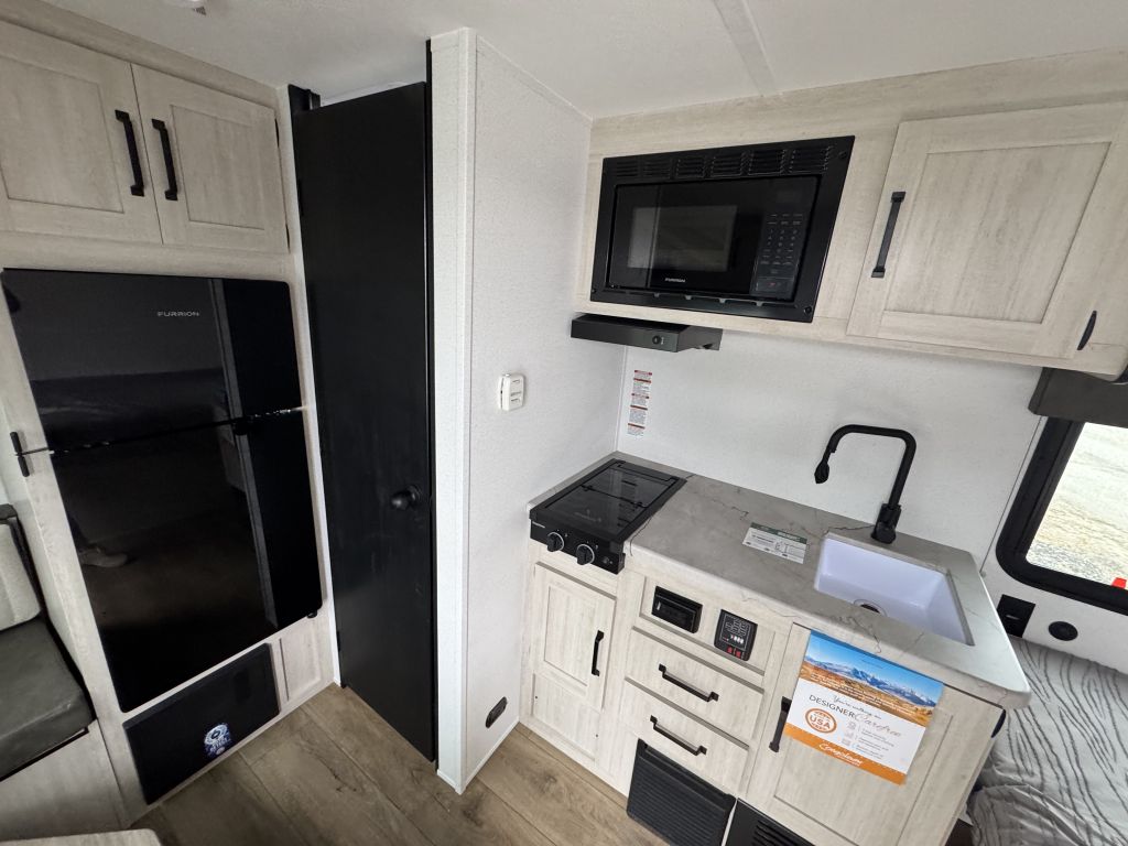 On the right hand side of the trailer is your kitchen area equipped with two burner gas range with convection microwave above, sink with high-rise faucet, tons of counter space for any appliances and lots of storage below.