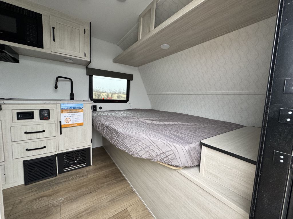 As you walk in, you’re greeted by your queen size bed at the front of the camper, with lots of storage at the base of the bed, tons of storage under the bed and lots of room above the bed.