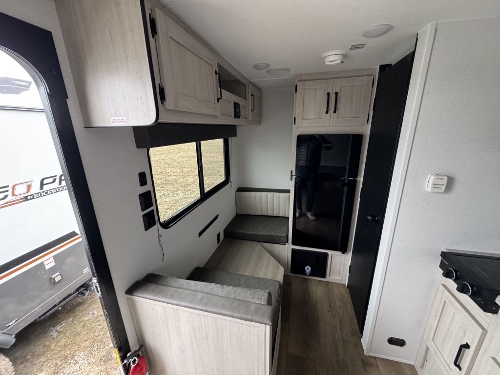 Looking towards a rear on the left side of the trailer, you have your booth style dinette capable of sleeping one more guest, you have tons of storage above as well as your radio. At the rear of the trailer is your refrigerator with lots of storage above. Beside is your foot flush toilet with huge shower.&nbsp