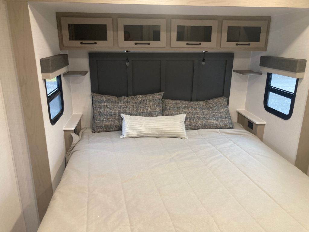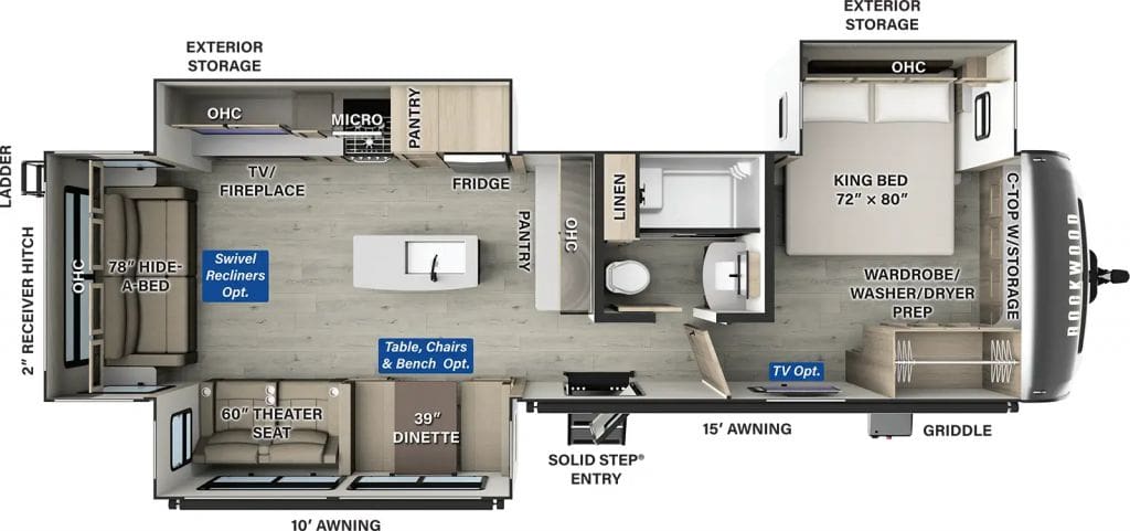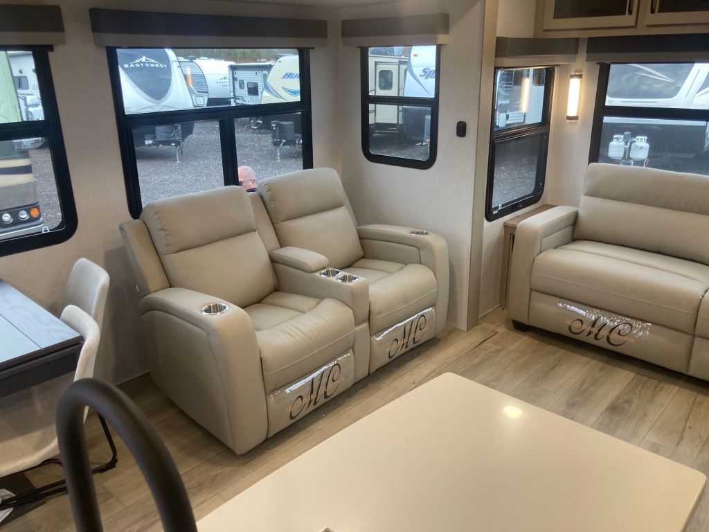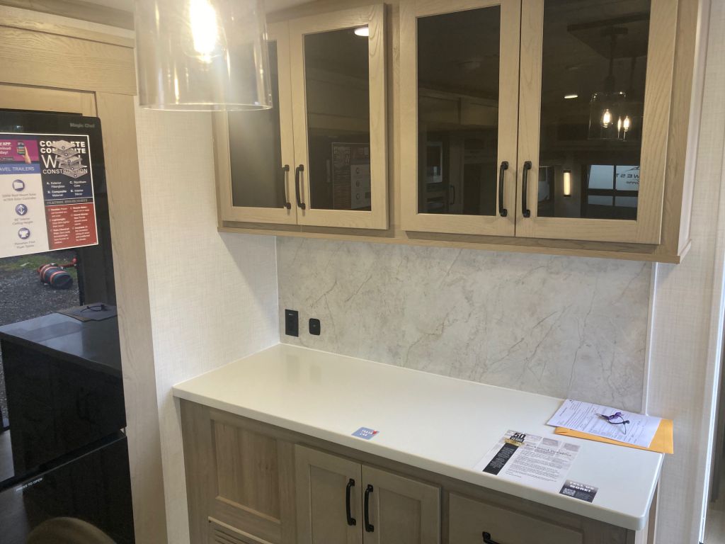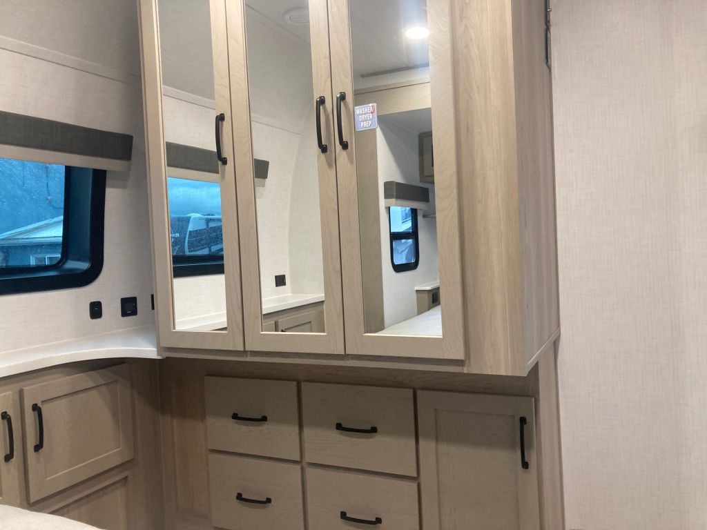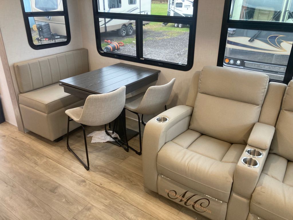 Another highlight of the 8337RL is the abundance of windows. The windows are tinted to help keep the interior cooler and provide a great view, particularly if you’re parked somewhere scenic. All of the windows open for ventilation, which is a nice touch. You also have day/night shades, which allow you to control how much light enters the space. The cabinetry in this unit is high-quality real wood—no flimsy particle board here—and the doors and panels are built to last. You’ll also find a significant amount of countertop space, with outlets and USB ports on both sides of the dinette for charging devices or setting up a little workspace. These touches really add to the overall functionality and convenience of the unit.