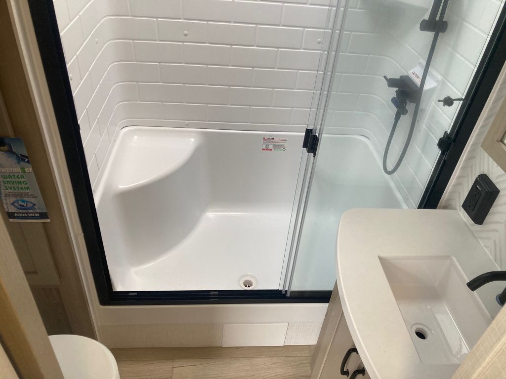 The bathroom features a porcelain foot-flush toilet, a spacious shower with plenty of headroom for taller individuals, and a unique shower Miser system that helps conserve hot water. The shower itself has a sturdy, glass door (instead of a flimsy curtain), which adds a sleek, modern touch.