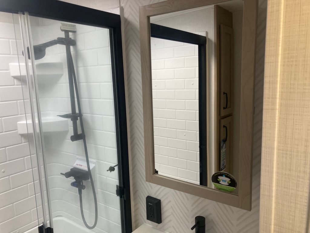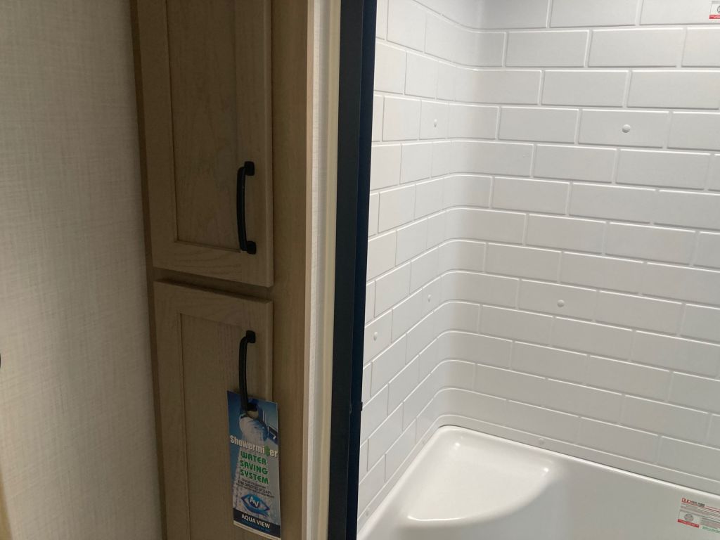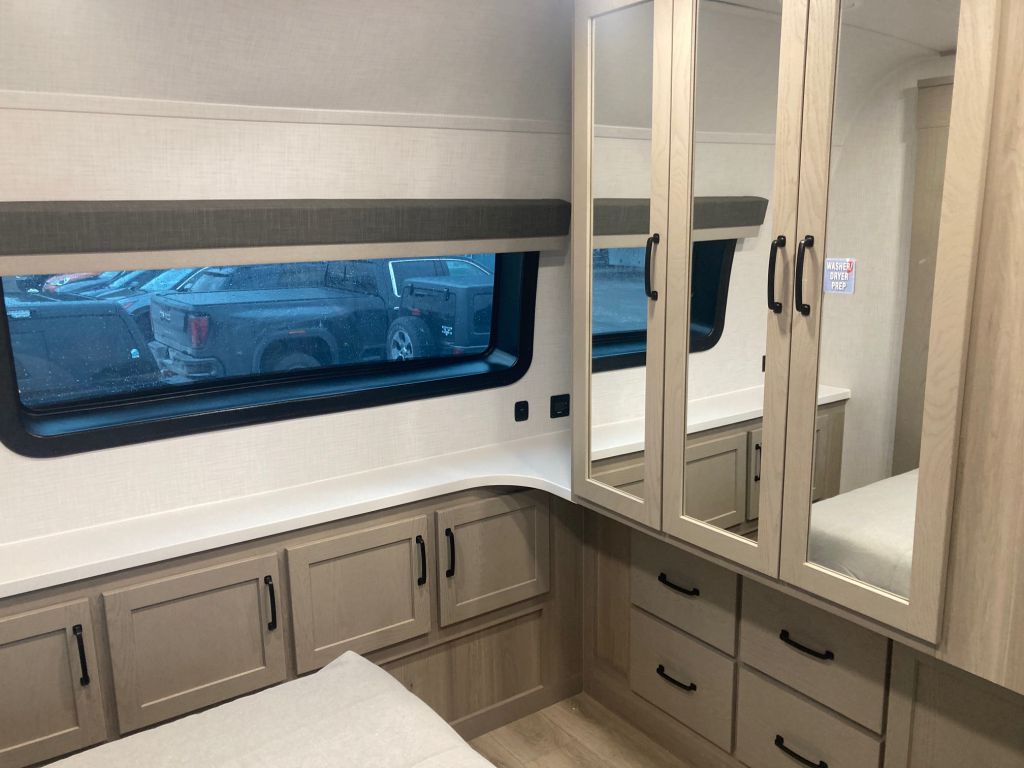 The bedroom also includes a hanging closet with washer/dryer prep—ideal if you’re looking to do some extended stays or even live full-time in this unit. Additional storage is available with cabinets and drawers, as well as a space to mount a TV. The air conditioning system in the bedroom has a dump valve, which allows you to push cool air into the room from the living area if needed. It’s a simple feature, but one that adds extra convenience when you’re trying to keep the bedroom cool on hot nights.