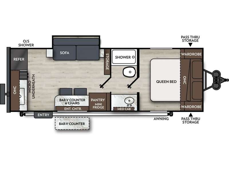 As you step inside, you’re welcomed by a spacious rear kitchen that spans the full width of the trailer, making meal prep both convenient and enjoyable. The kitchen is equipped with a stainless-steel sink featuring a flush mount cover for added counter space, a 2-burner cooktop, an air fryer microwave, and a 10 cu. ft. refrigerator, perfect for storing all your groceries. A pantry adds even more storage for dry goods and kitchen essentials. Just in front of the kitchen, a Bar-V counter with chairs offers a great spot to dine, work, or relax with company. Across from the counter, a comfortable sofa slide provides a cozy lounging area and can also convert into an extra sleeping space when needed. Moving forward, the walk-through bathroom features a shower, a skylight for natural light, and a foot flush toilet for added convenience. At the front of the trailer, the private bedroom includes a queen bed flanked by wardrobes on each side, offering both comfort and practical storage for all your essentials.