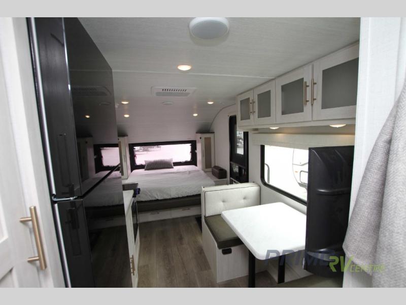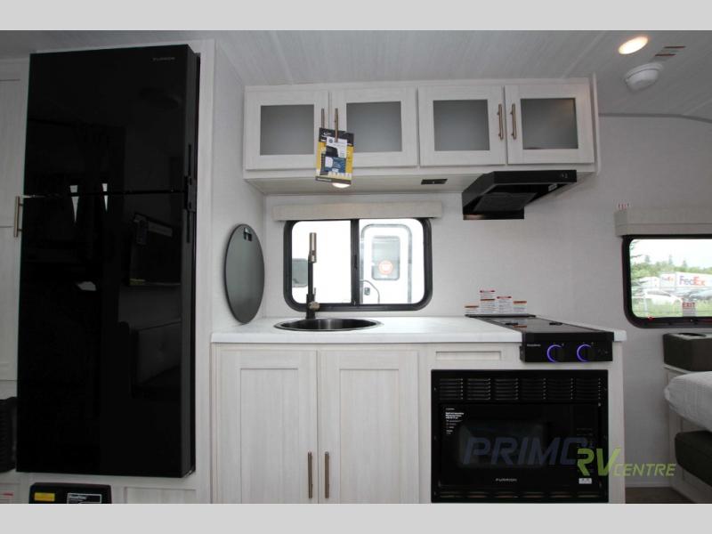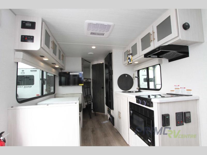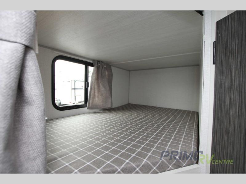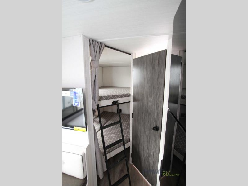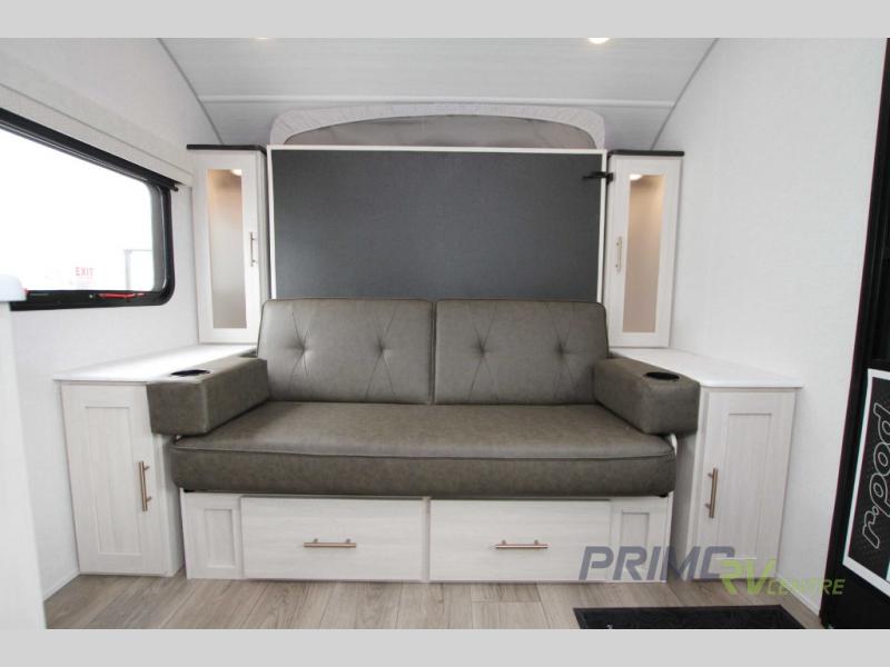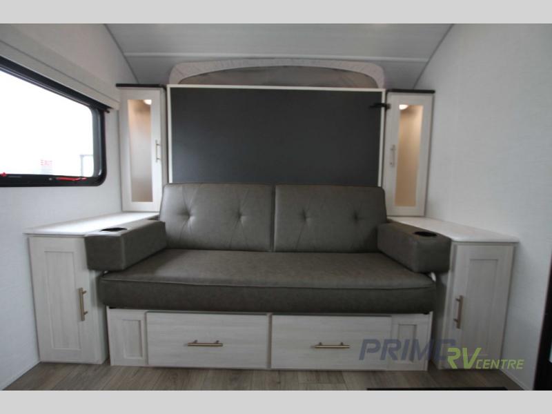 This travel trailer offers a great flexible floorplan. The living area sofa hides a queen-size Murphy bed which can be folded down at night, giving you full use of the room during the day. At the rear is a pair of double-size bunks which provide a spacious private sleeping area for children or guests. The booth dinette can also be used for an additional bed as needed. An efficient kitchen includes a convection microwave and cooktop to cook meals each day, along with a 12V black glass refrigerator and pantry for food storage.