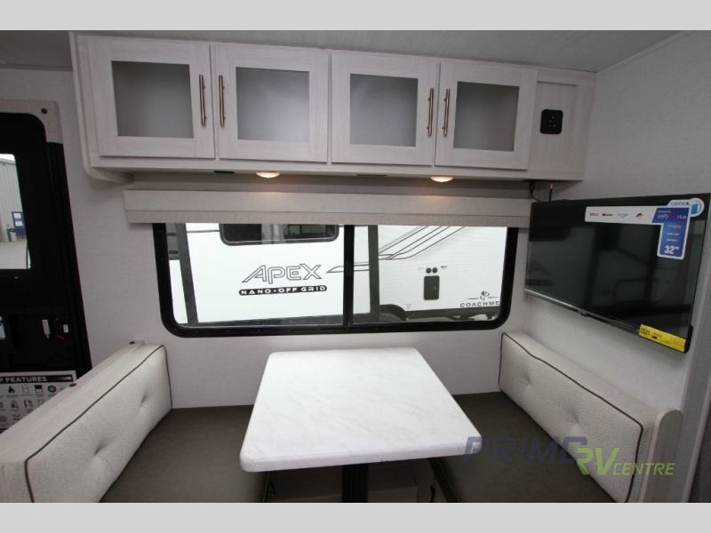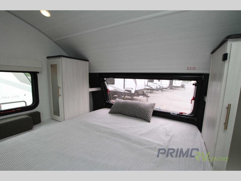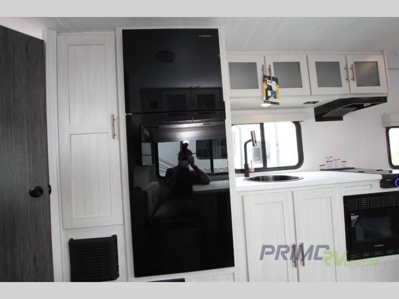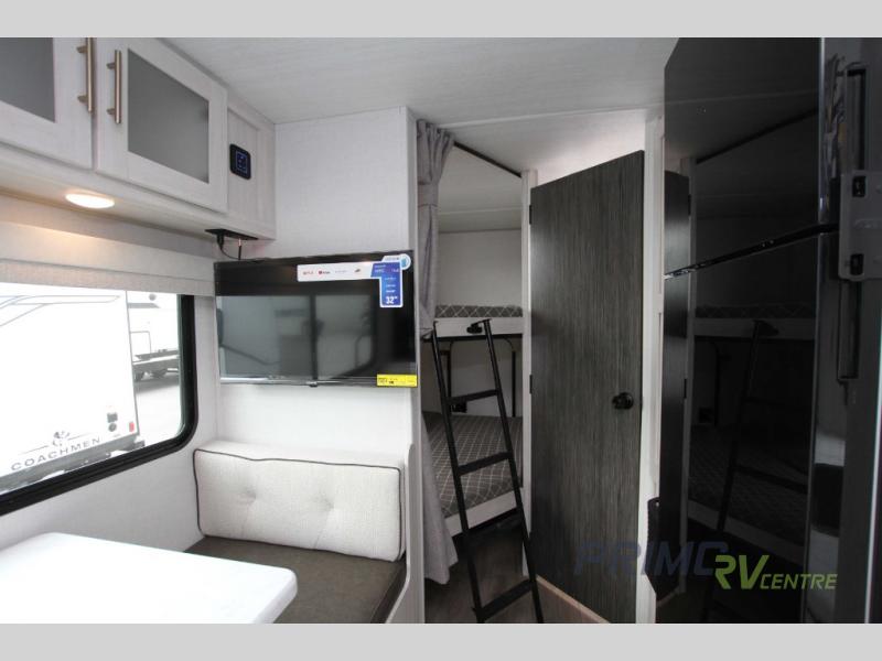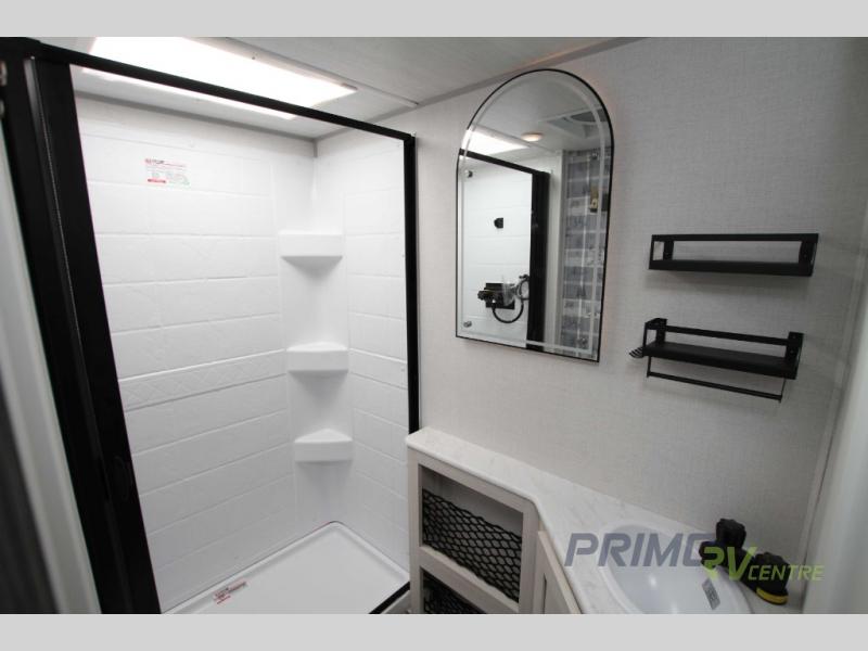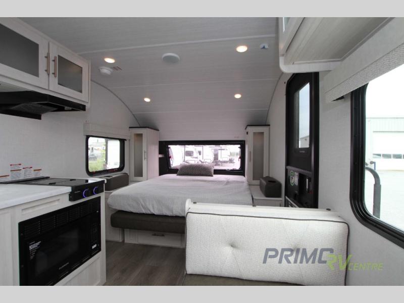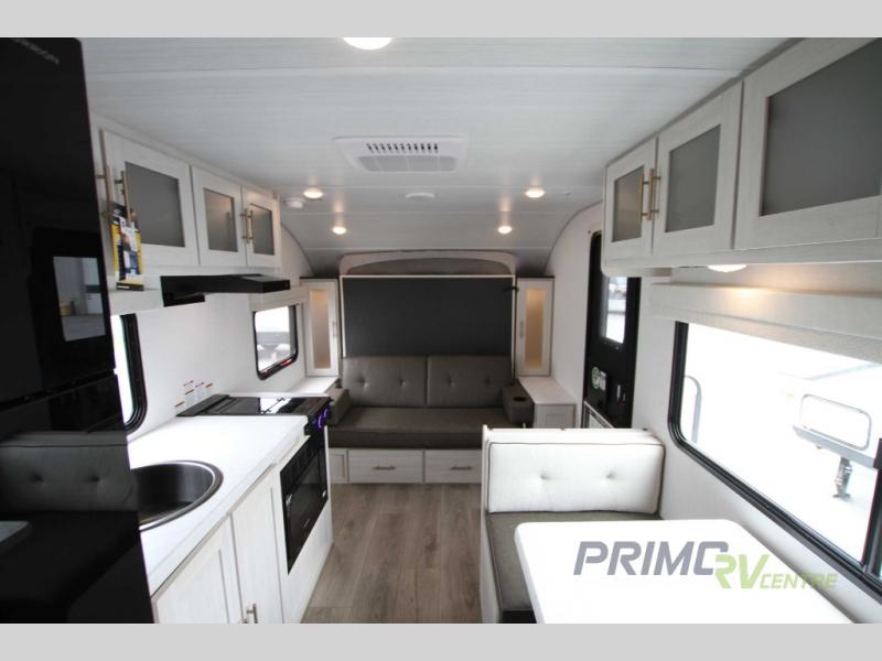 This travel trailer offers a great flexible floorplan. The living area sofa hides a queen-size Murphy bed which can be folded down at night, giving you full use of the room during the day. At the rear is a pair of double-size bunks which provide a spacious private sleeping area for children or guests. The booth dinette can also be used for an additional bed as needed. An efficient kitchen includes a convection microwave and cooktop to cook meals each day, along with a 12V black glass refrigerator and pantry for food storage.