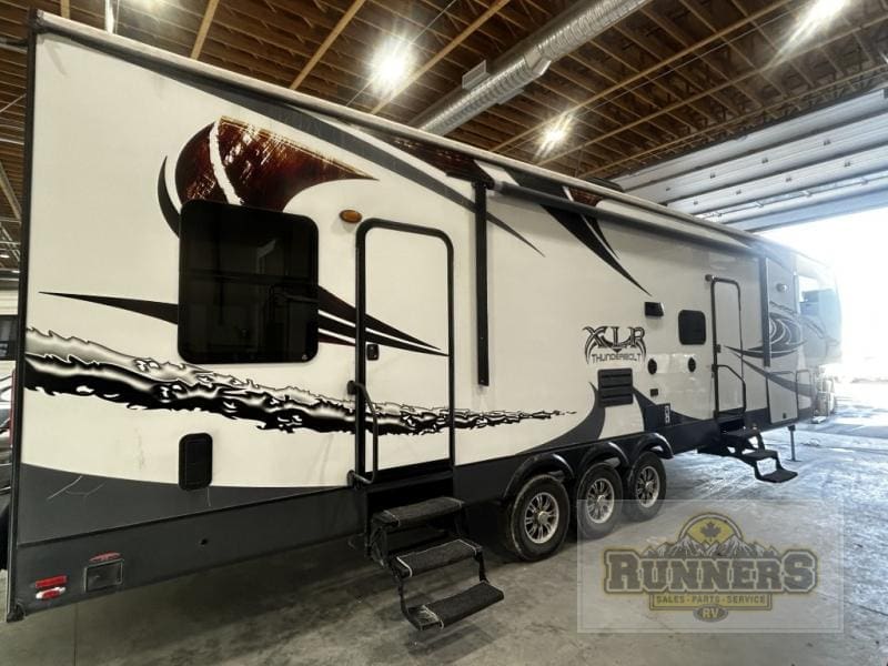 This local, one owner Thunderbolt toy hauler has just arrived at Runners RV!