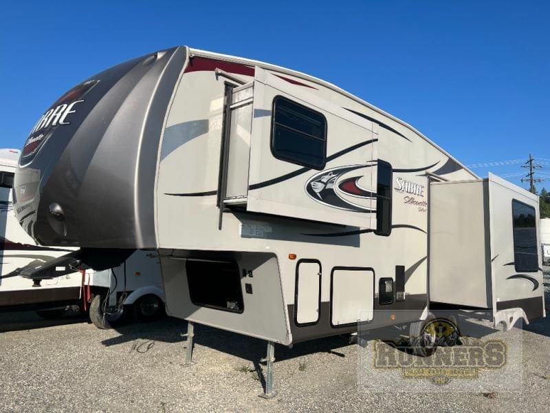 Step inside this rear living 284RSKS Sabre Silhouette triple slide fifth wheel by Palomino RV. You will enjoy the spaciousness inside with dual slides opposite one another in the main living area alone, plus so much more.