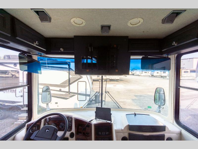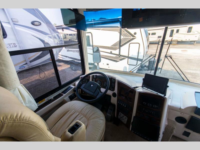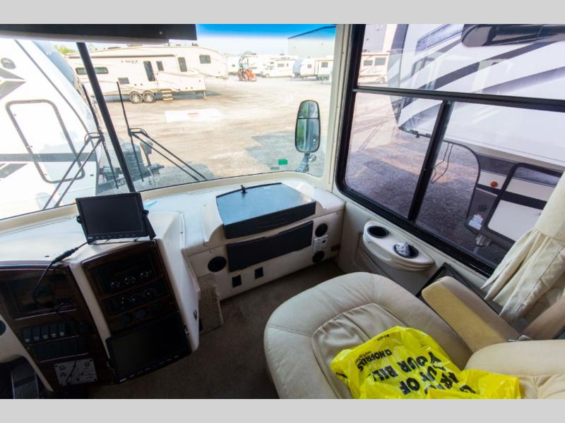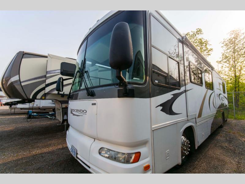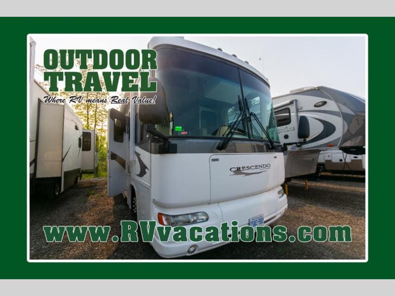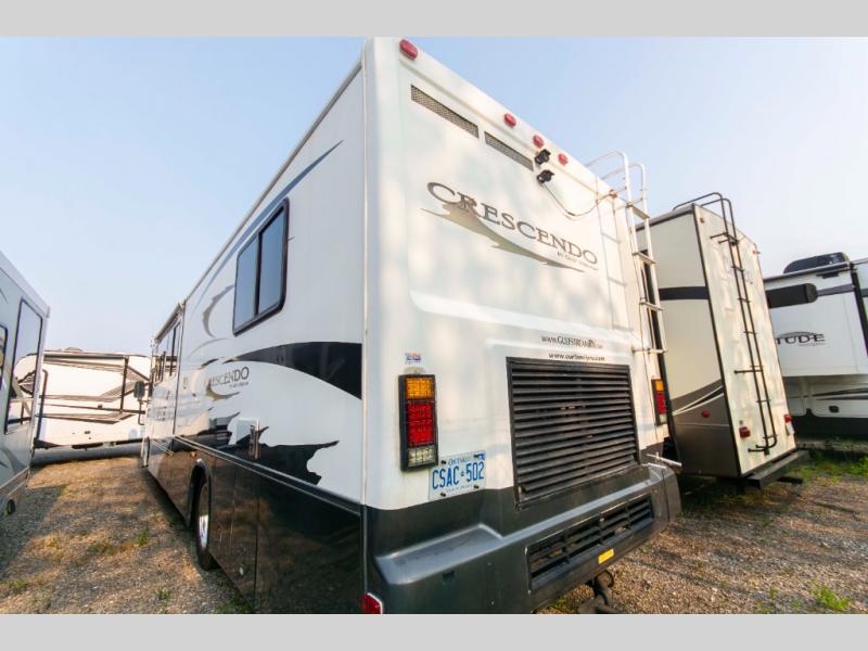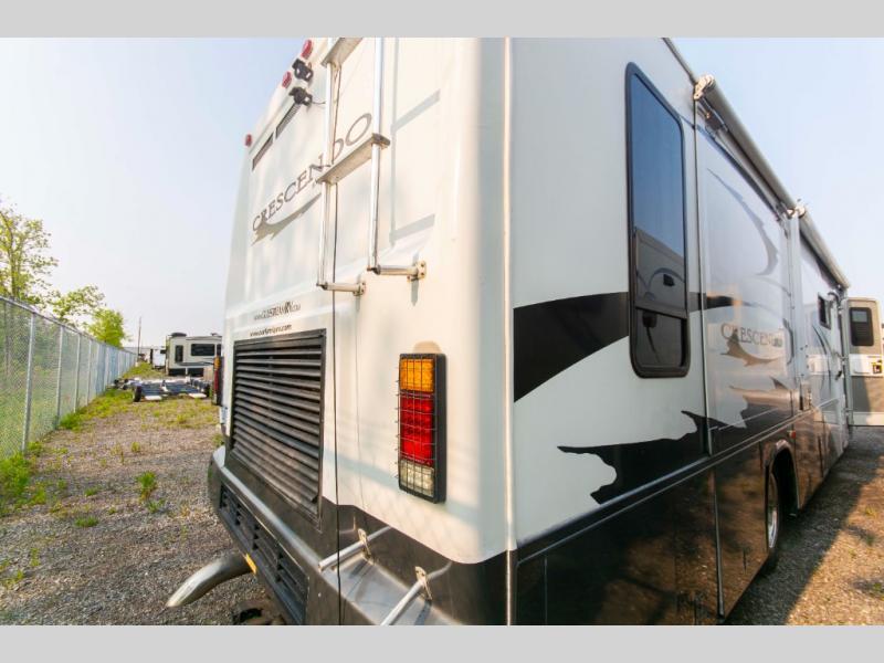 This 2005 Crescendo 8356 has a 350hp Caterpillar Engine On a Freightliner Chassis, Spring/Air Suspension, Exhaust Brake, 2 Slide-outs, Onan Diesel Generator, 2 Ducted Air Conditioners, Levelers, Double Door Gas/110v Norcold Refrigerator, Main Awning, Backup Camera, Satellite Dish, TV, 3 DVD Players, Convection Microwave, 3 Burner Range