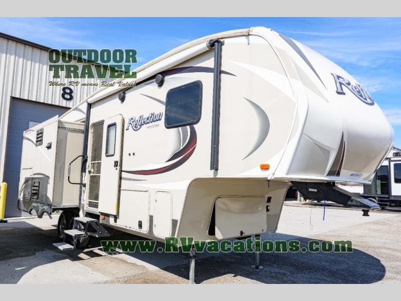 Across the rear wall of this Reflection unit you will enjoy a tri-fold hide-a-bed sofa with storage cabinets above to store more camping items. Adjacent, in the second living area slide out you will find theater seating for two and an optional free standing dinette instead of a booth dinette.