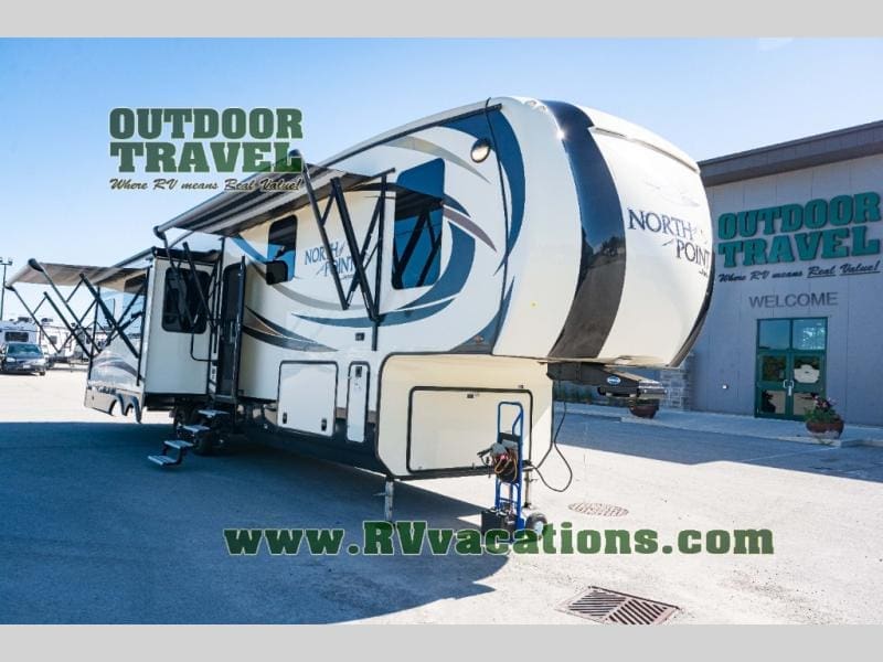 Enjoy camping in this Jayco North Point luxury fifth wheel model 301RETS featuring a rear entertainment layout, triple slides, and a convenient kitchen island!